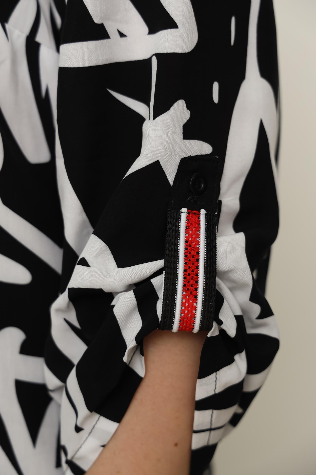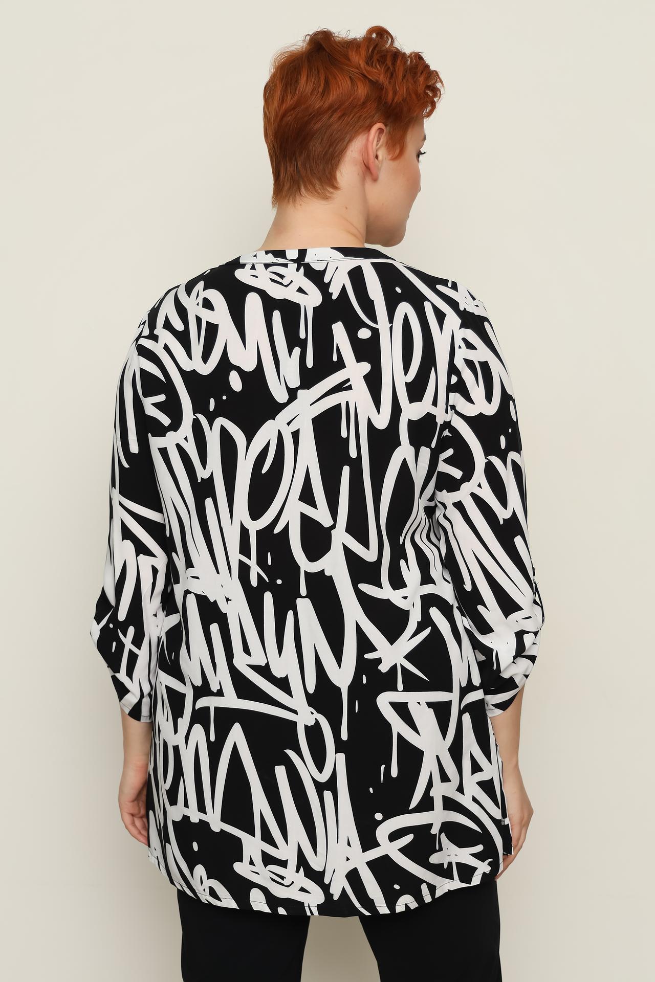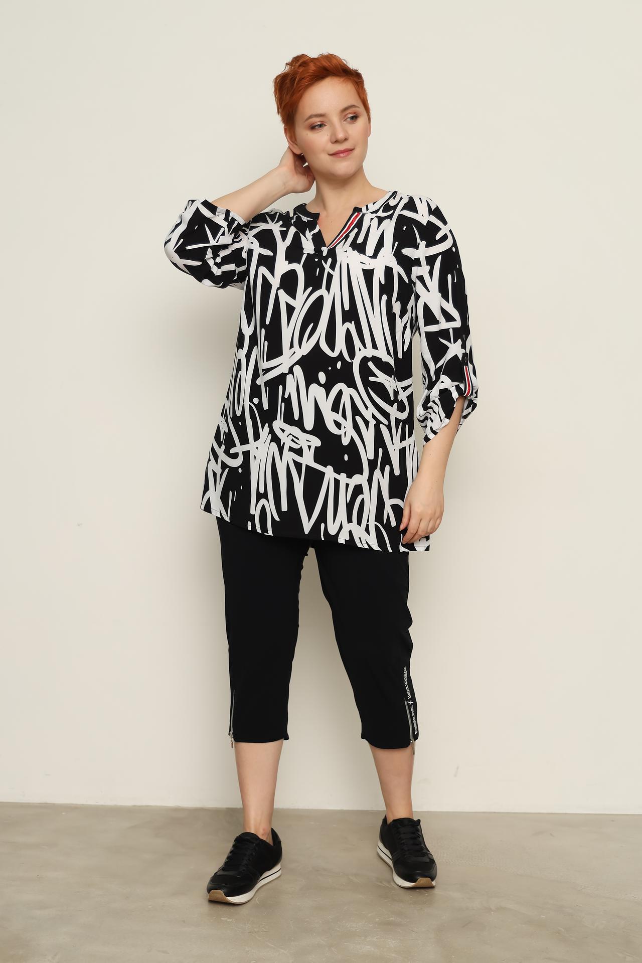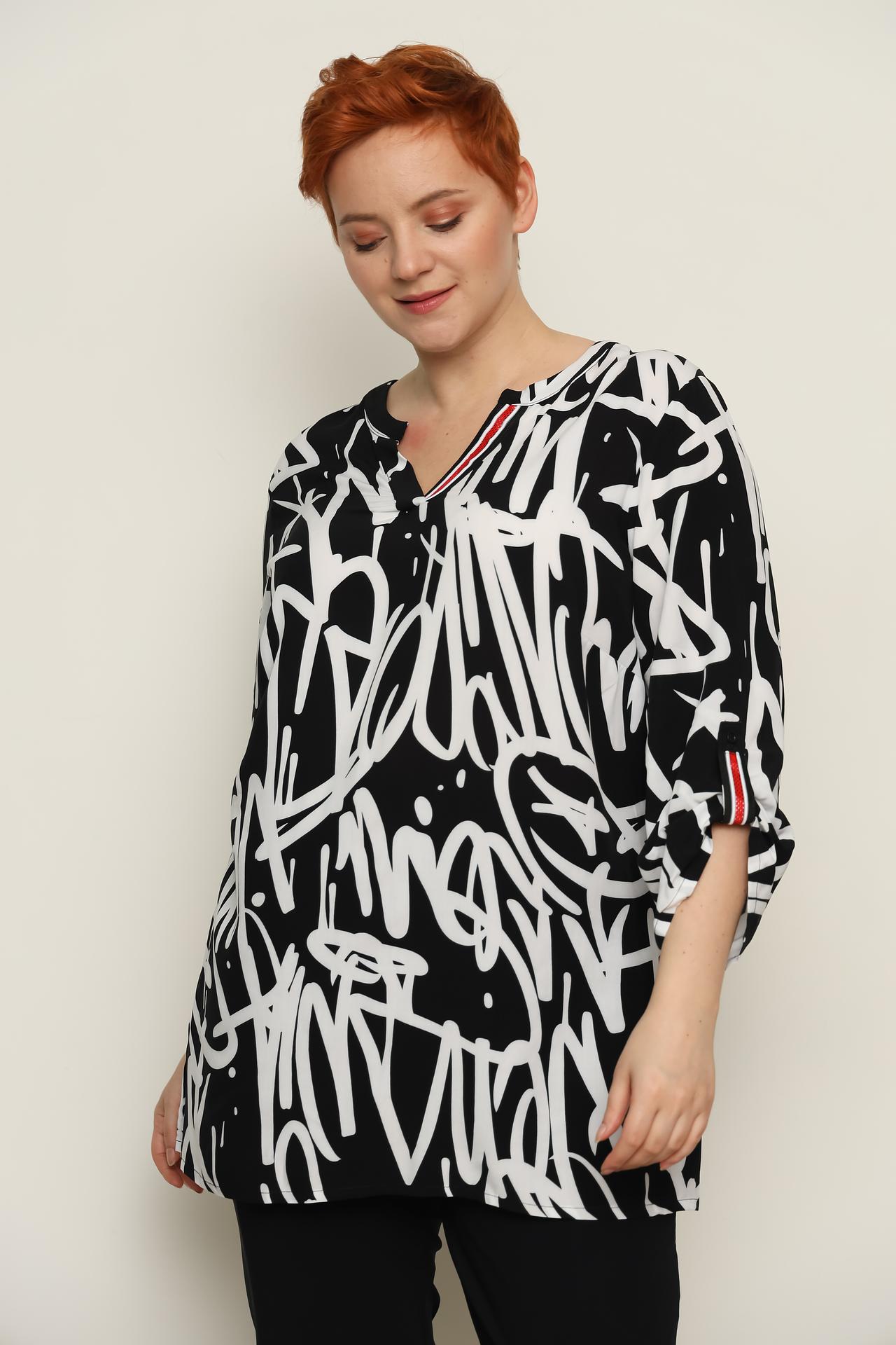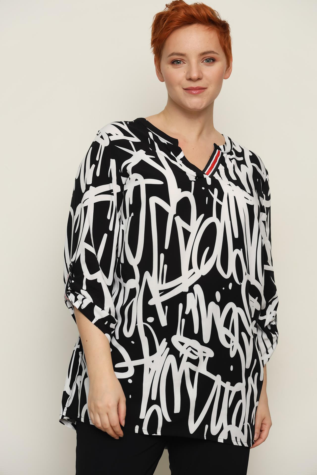 Стильная блуза от Doris Streich – идеальный выбор для создания эффектного образа. Оригинальный принт в стиле граффити на черном фоне добавляет динамичности и подчеркивает индивидуальность.