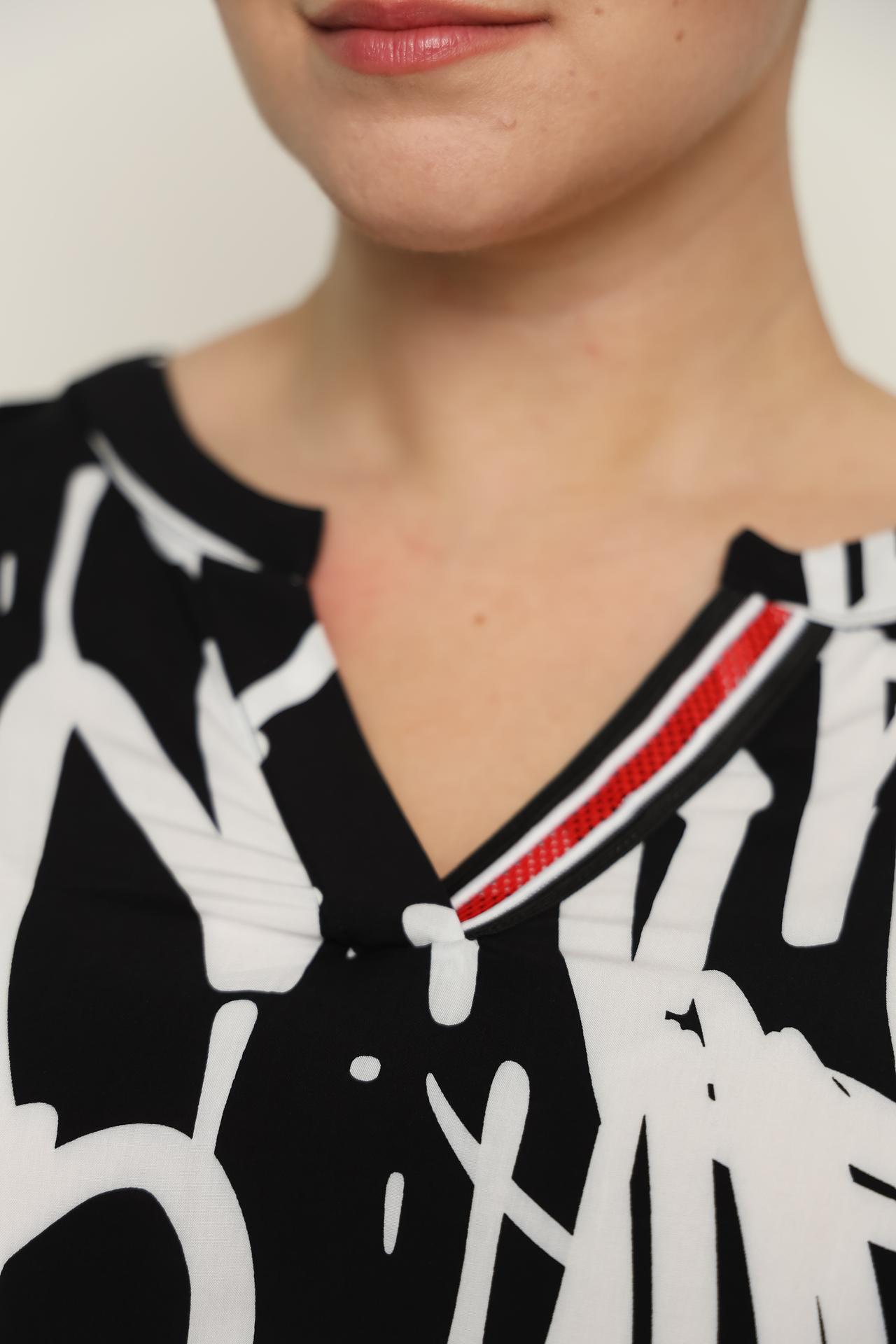 - Дизайн: Оригинальный черно-белый принт в стиле граффити. V-образный вырез с декоративной полосой из красной и белой тесьмы.