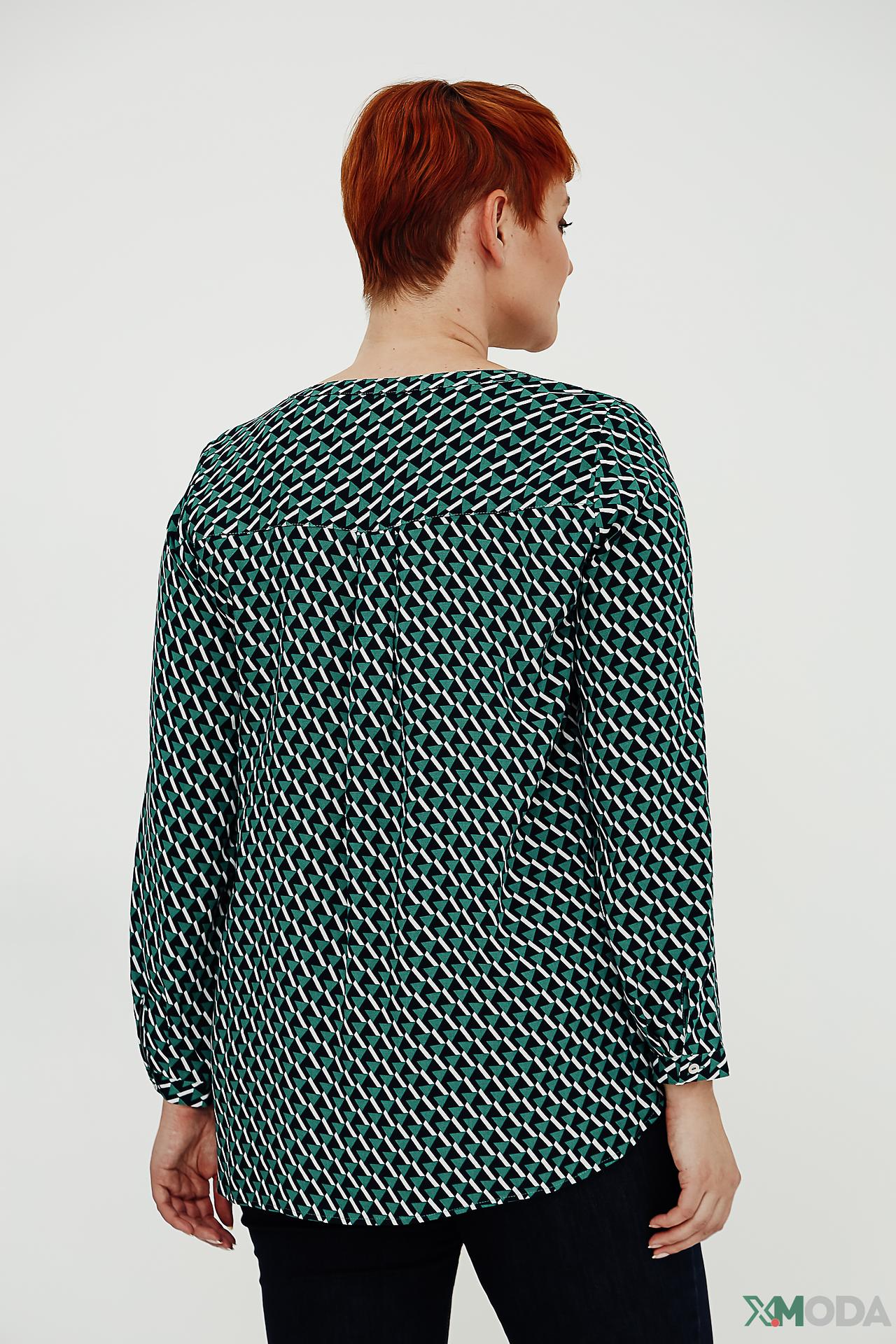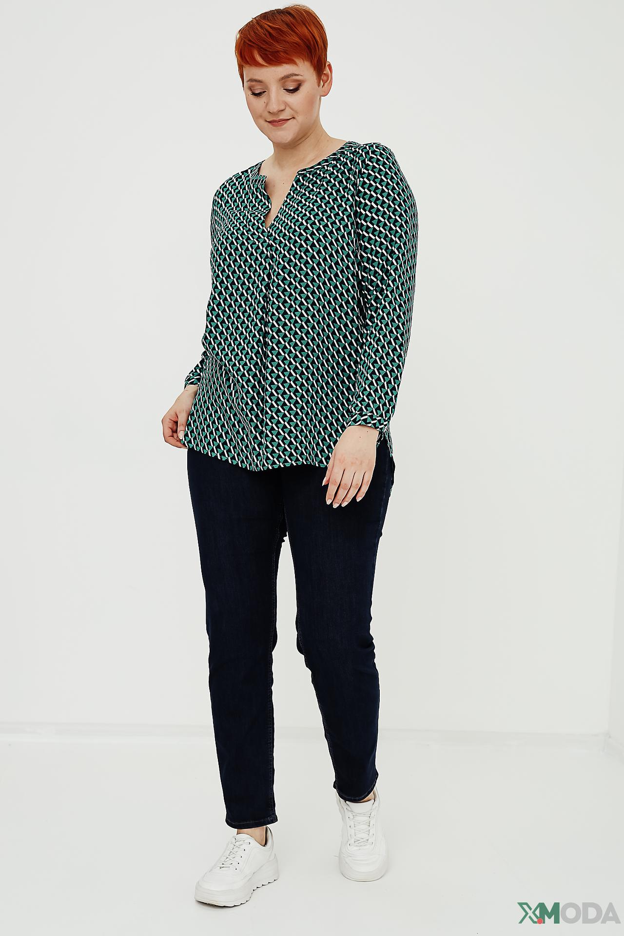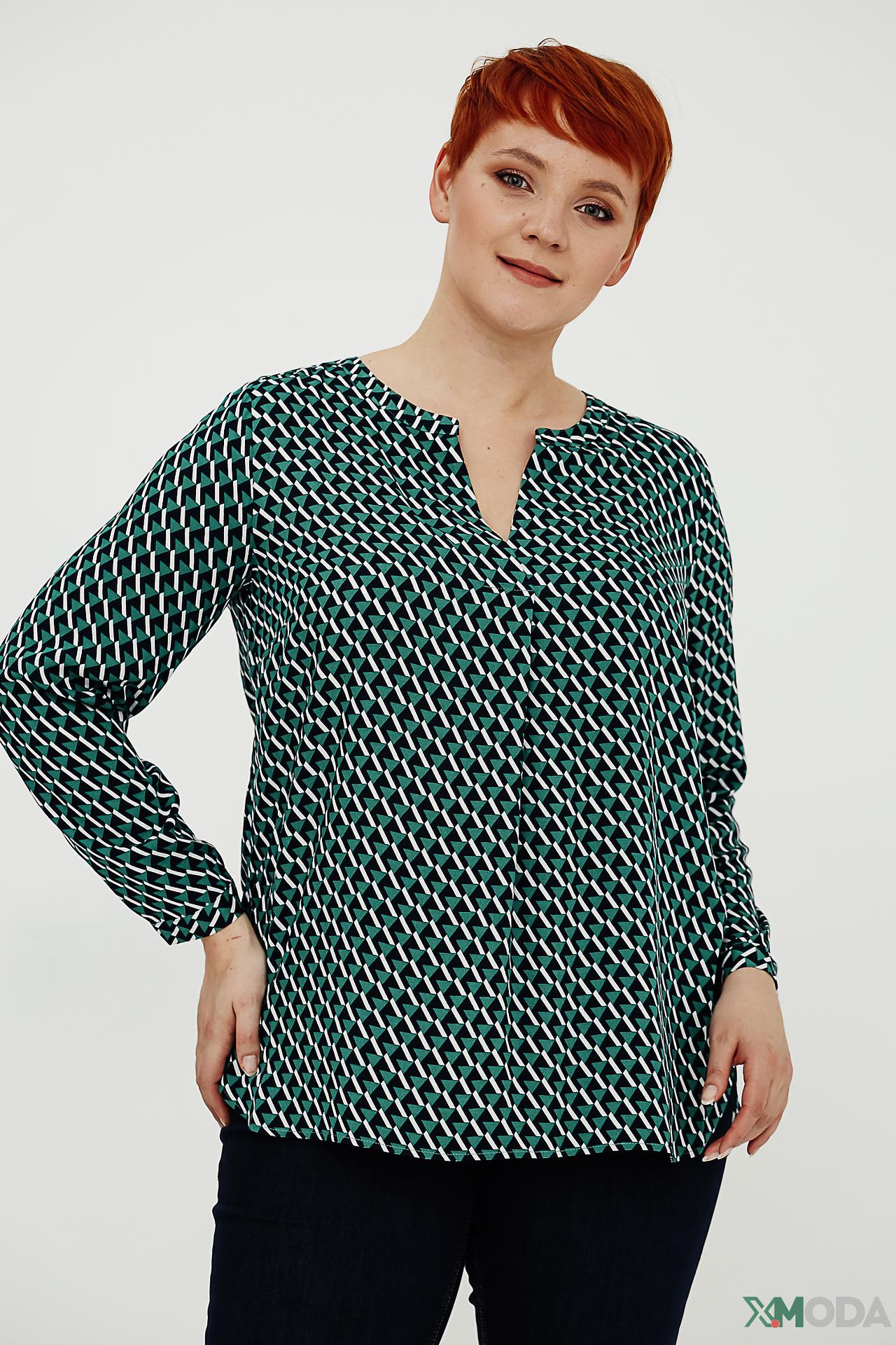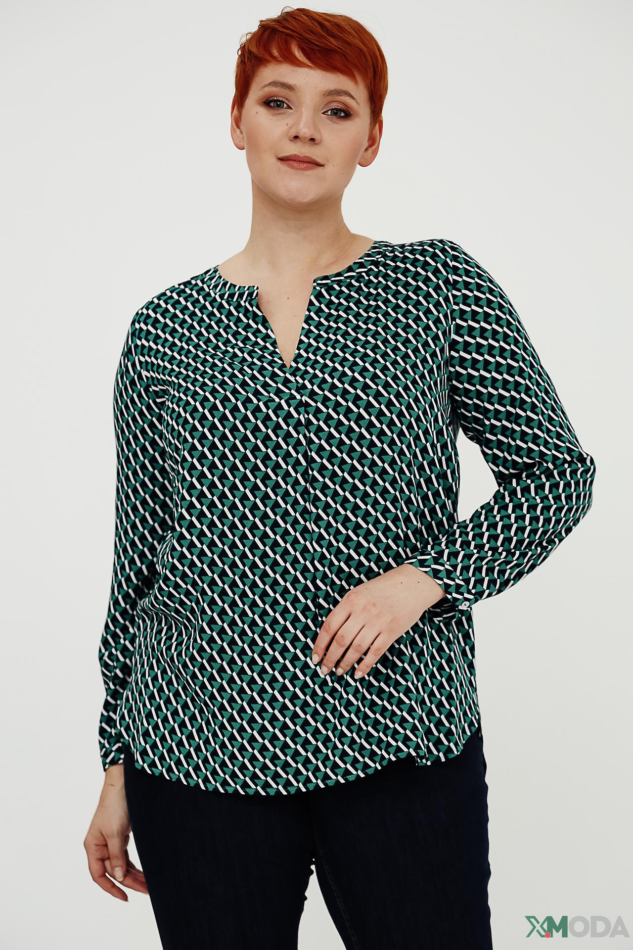 - Дизайн: Геометрический принт. Оригинальный узор в виде ромбов придает блузе современный и динамичный вид. V-образный вырез визуально вытягивает силуэт.