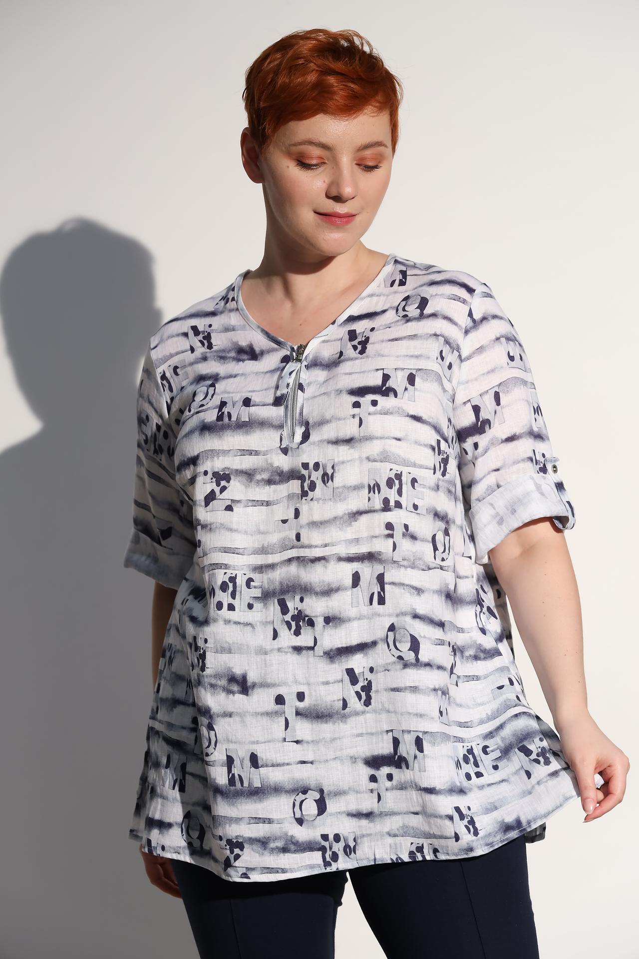 - Уникальный дизайн: Оригинальный принт в виде горизонтальных полос и букв делает эту блузу особенно привлекательной. V-образный вырез с молнией добавляет изюминку и позволяет регулировать глубину декольте.