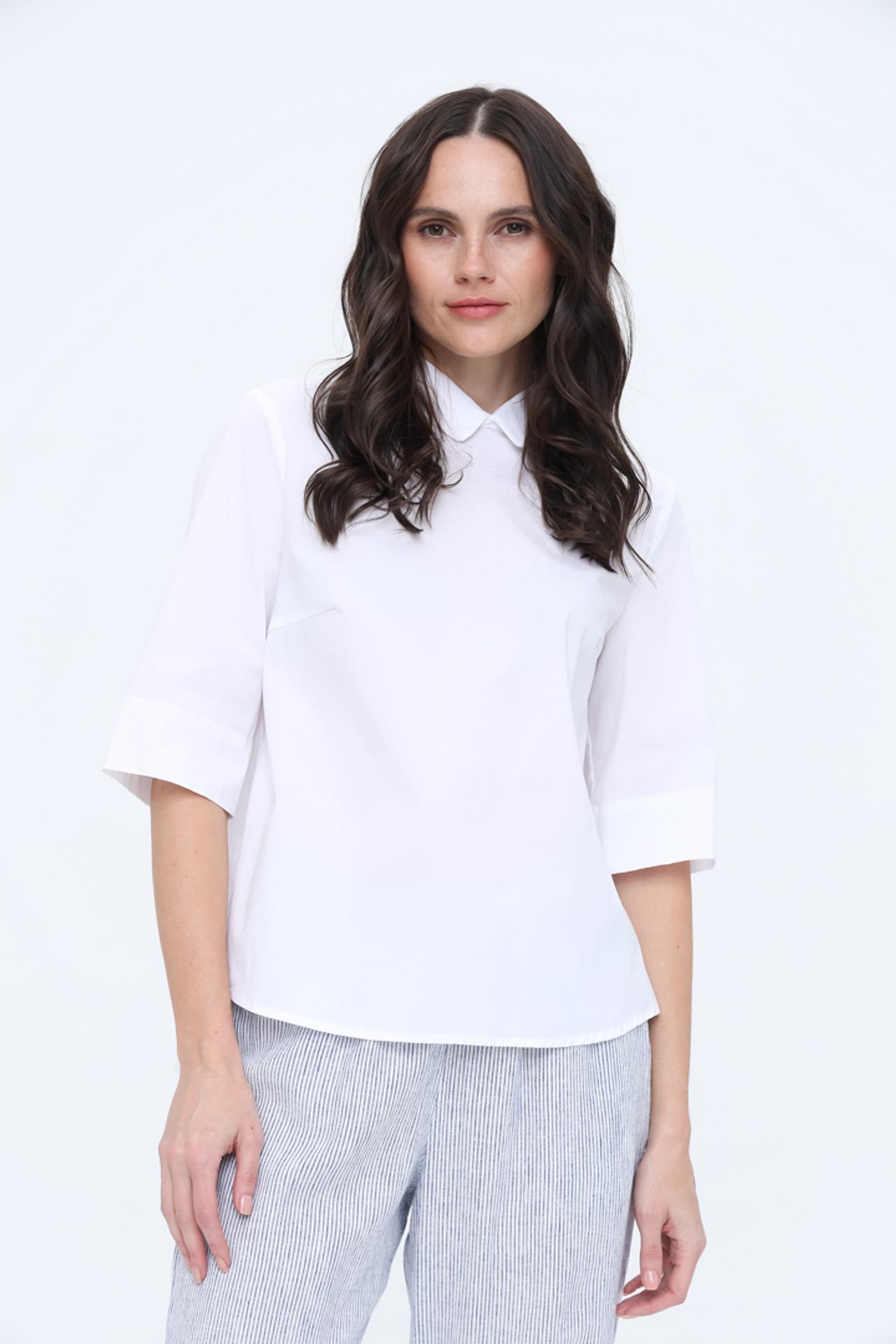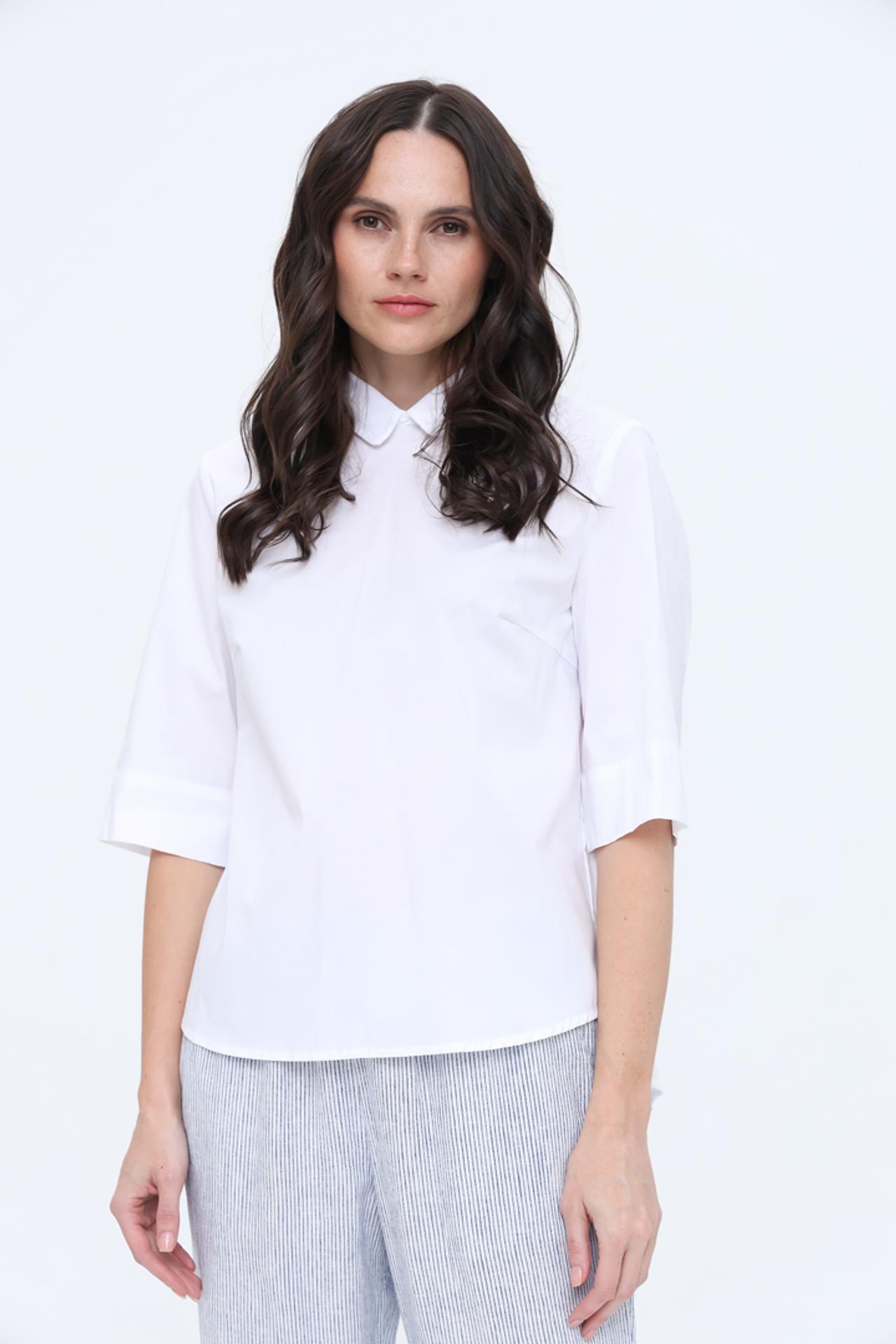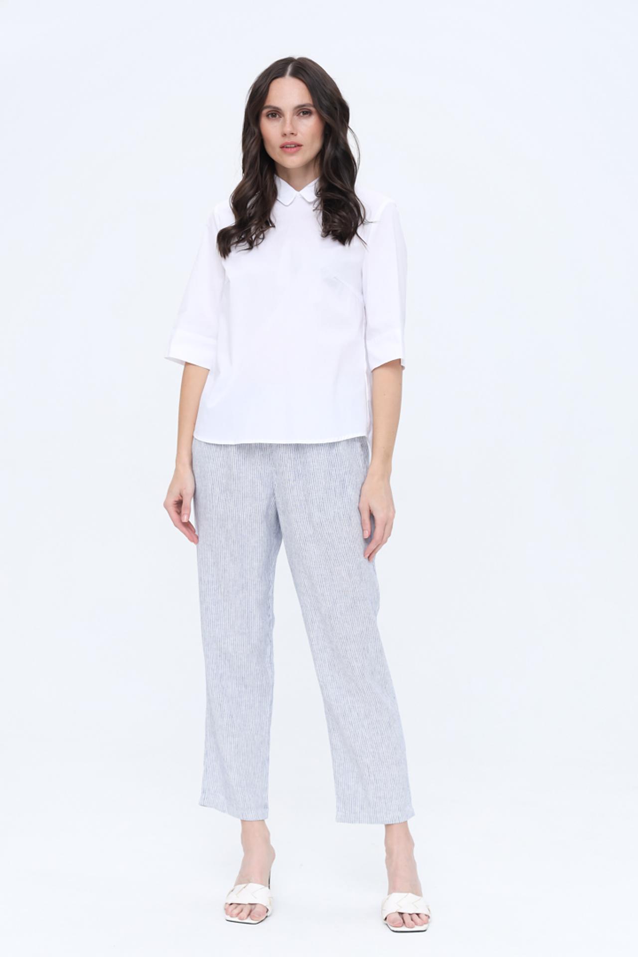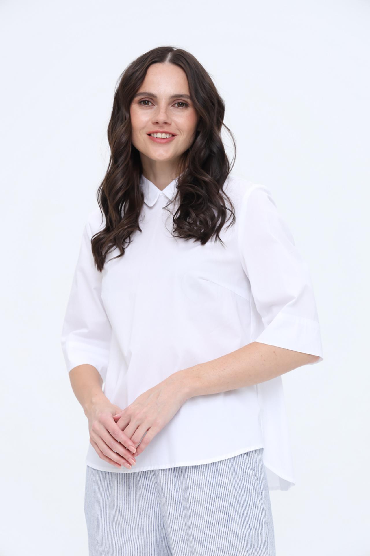 - Классический крой и детали: Блуза имеет прямой крой, что обеспечивает комфортную посадку. Аккуратный закругленный воротник и рукава длиной 3/4 добавляют модели утонченности и делают ее универсальной.