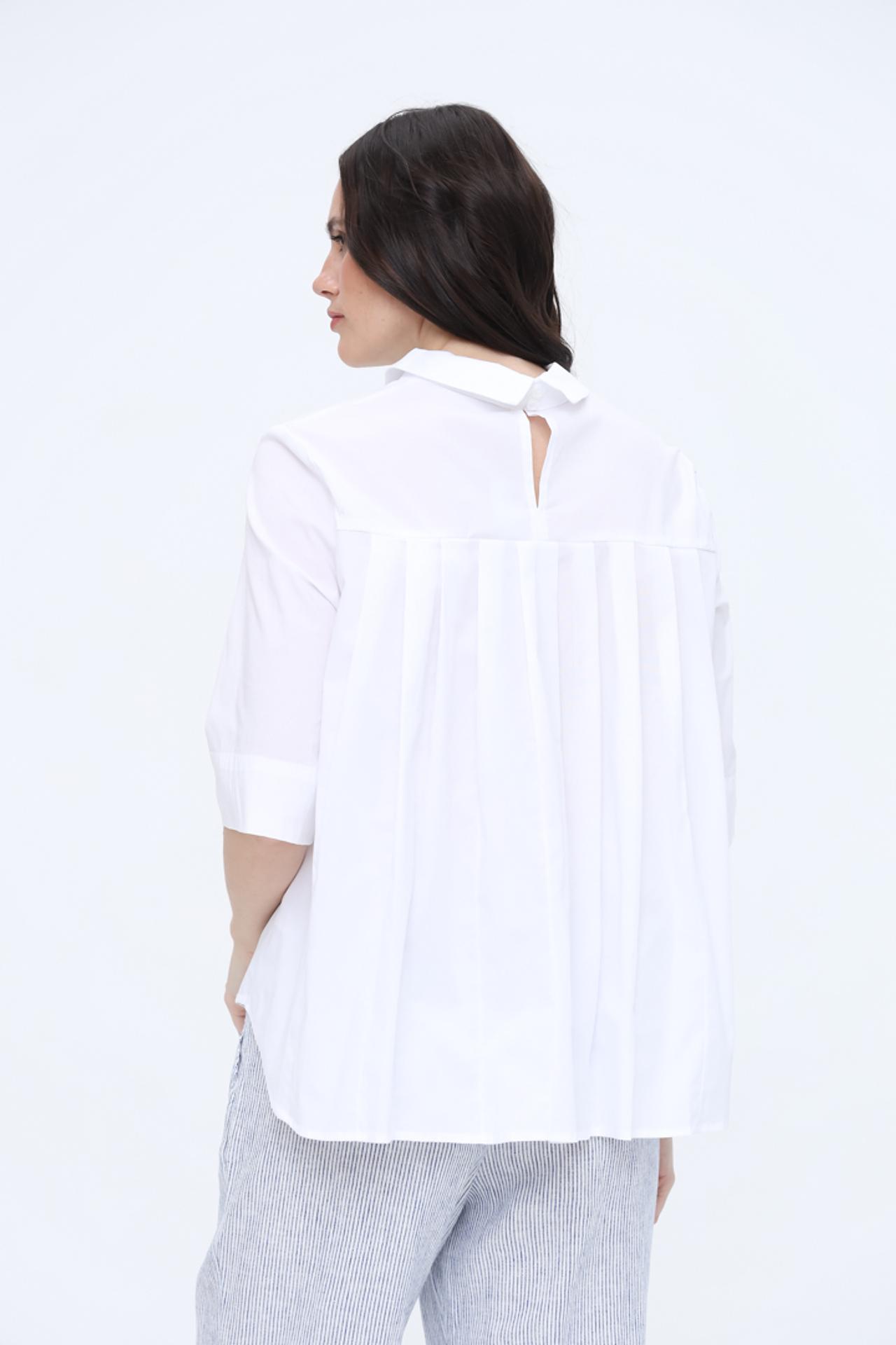 - Практичные элементы: Наличие складок на спине обеспечивает дополнительный объем и комфорт, а также придаёт блузе современный силуэт. Это добавляет функциональности и стиля.
