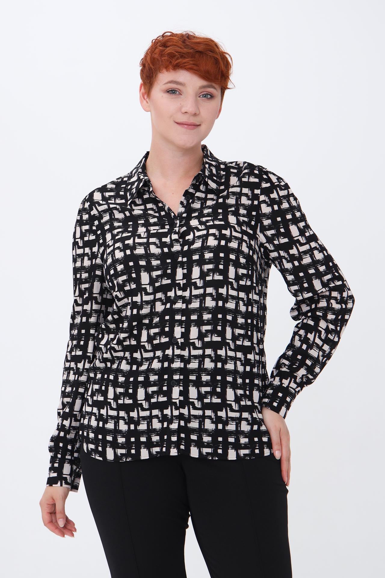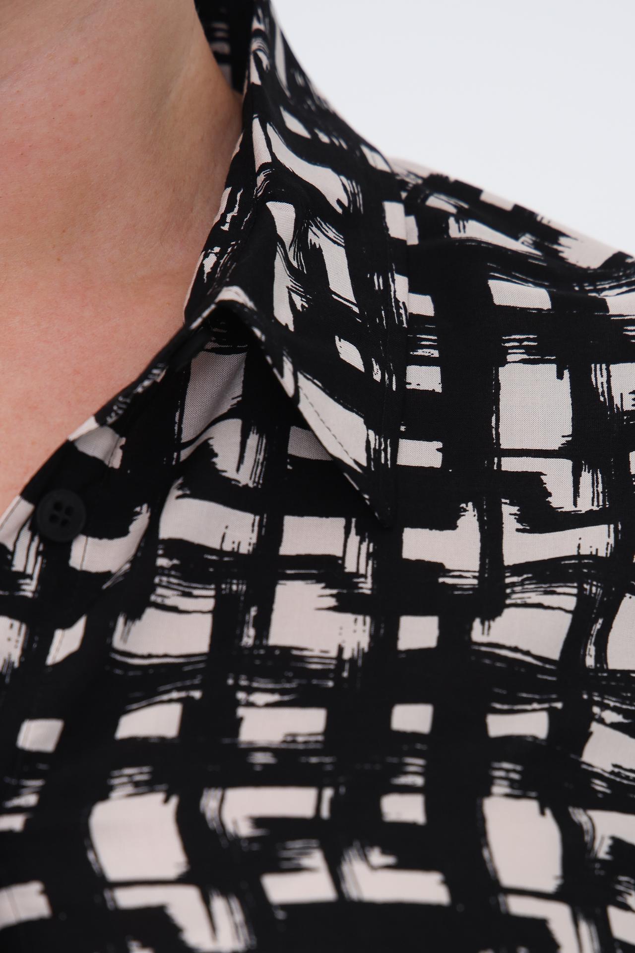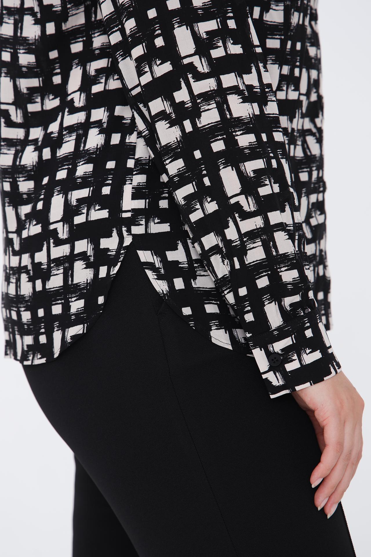 Яркий черно-белый абстрактный принт придает модели современный и динамичный вид, делая ее идеальной для создания как деловых, так и повседневных образов. Классический крой и отложной воротник подчеркивают изысканность изделия, позволяя легко интегрировать его в разнообразные стили.