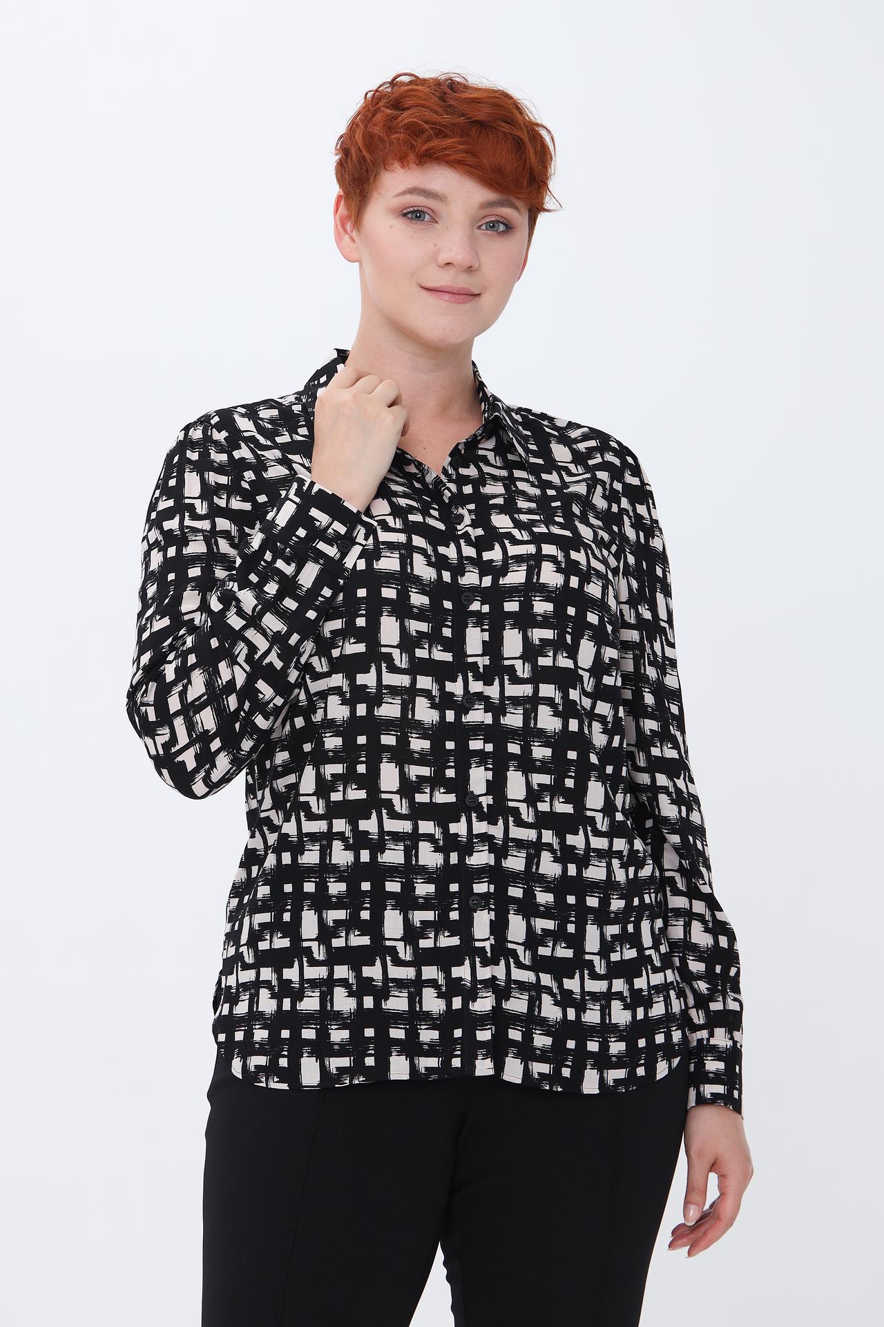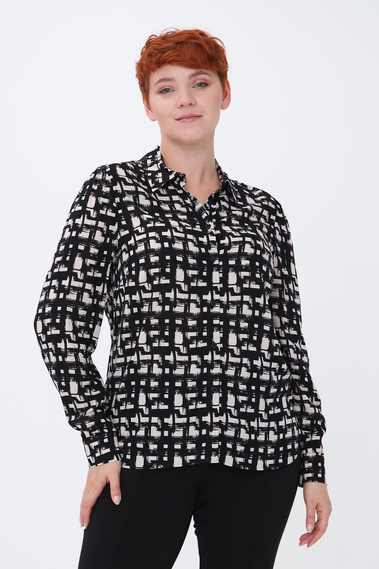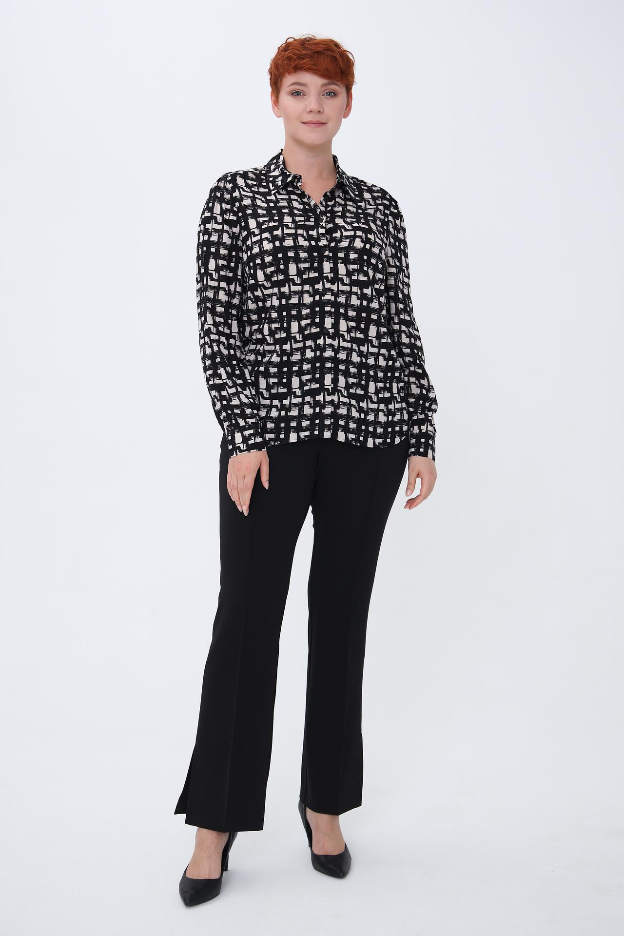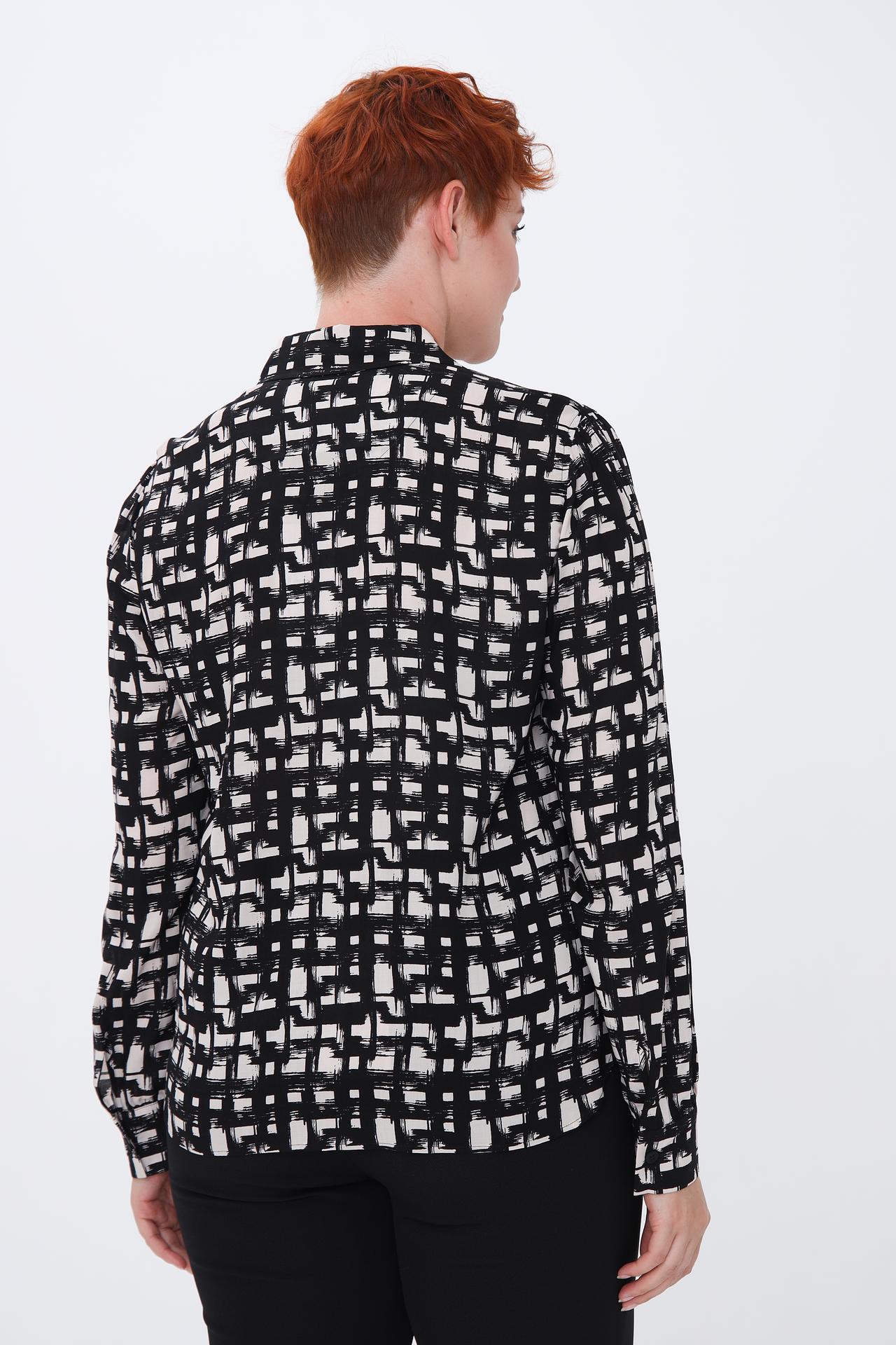 Яркий черно-белый абстрактный принт придает модели современный и динамичный вид, делая ее идеальной для создания как деловых, так и повседневных образов. Классический крой и отложной воротник подчеркивают изысканность изделия, позволяя легко интегрировать его в разнообразные стили.