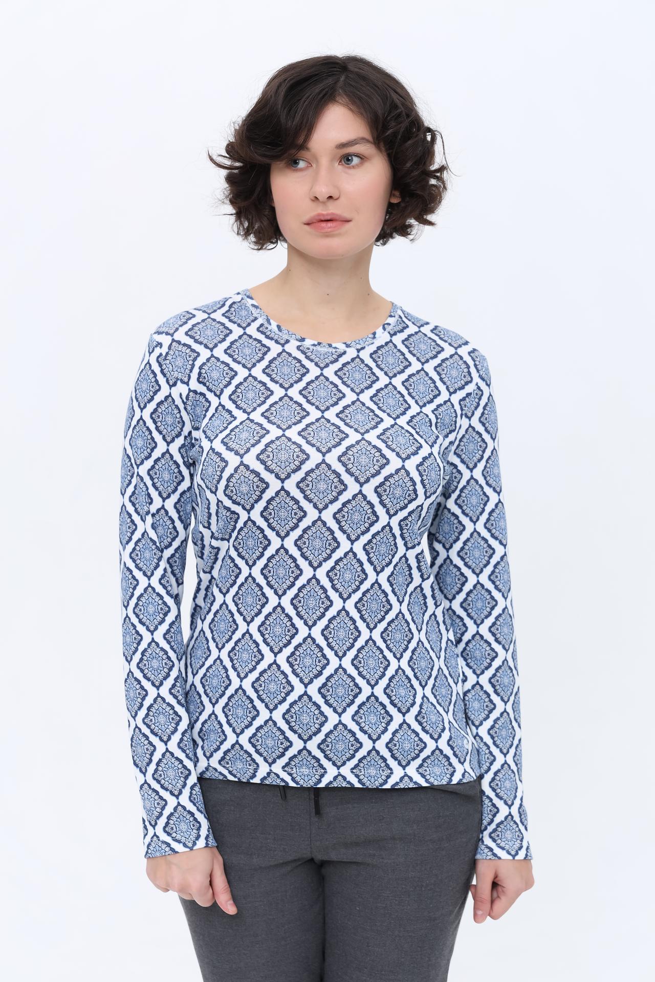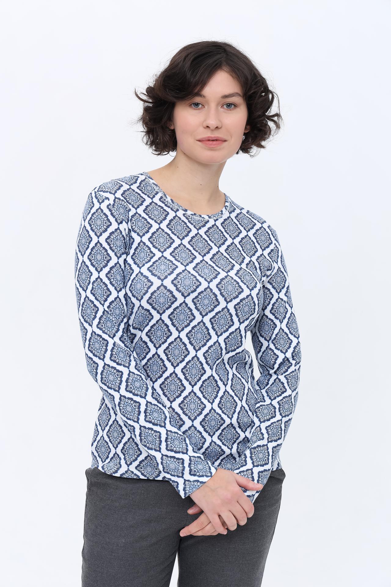 Лонгслив Olsen из 100% хлопка — это воплощение комфорта и стиля для вашего повседневного гардероба. Классический крой и изящный бело-синий узор делают его универсальным элементом для создания как деловых, так и расслабленных образов.