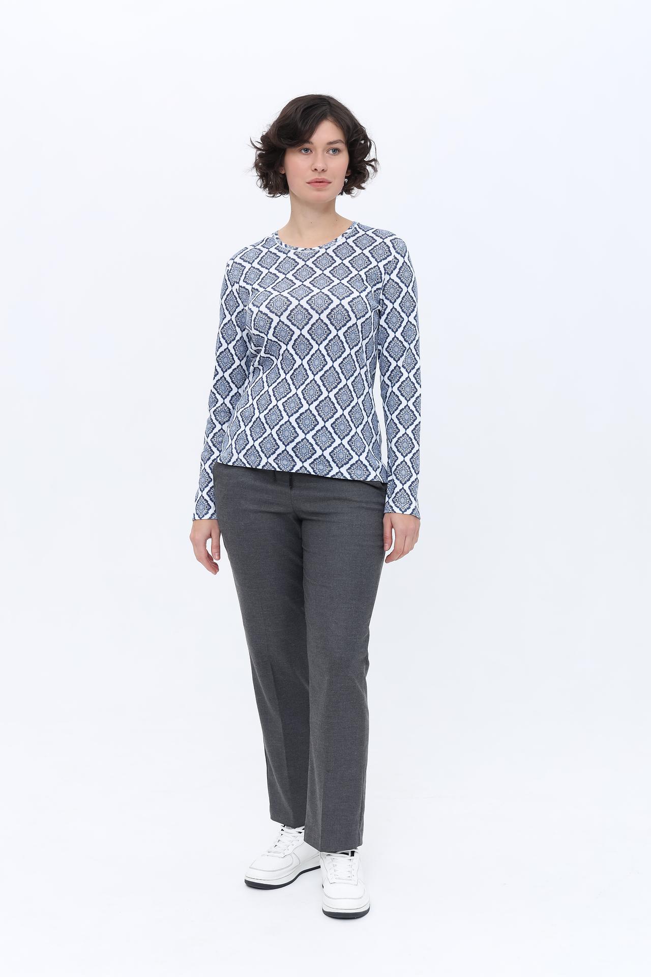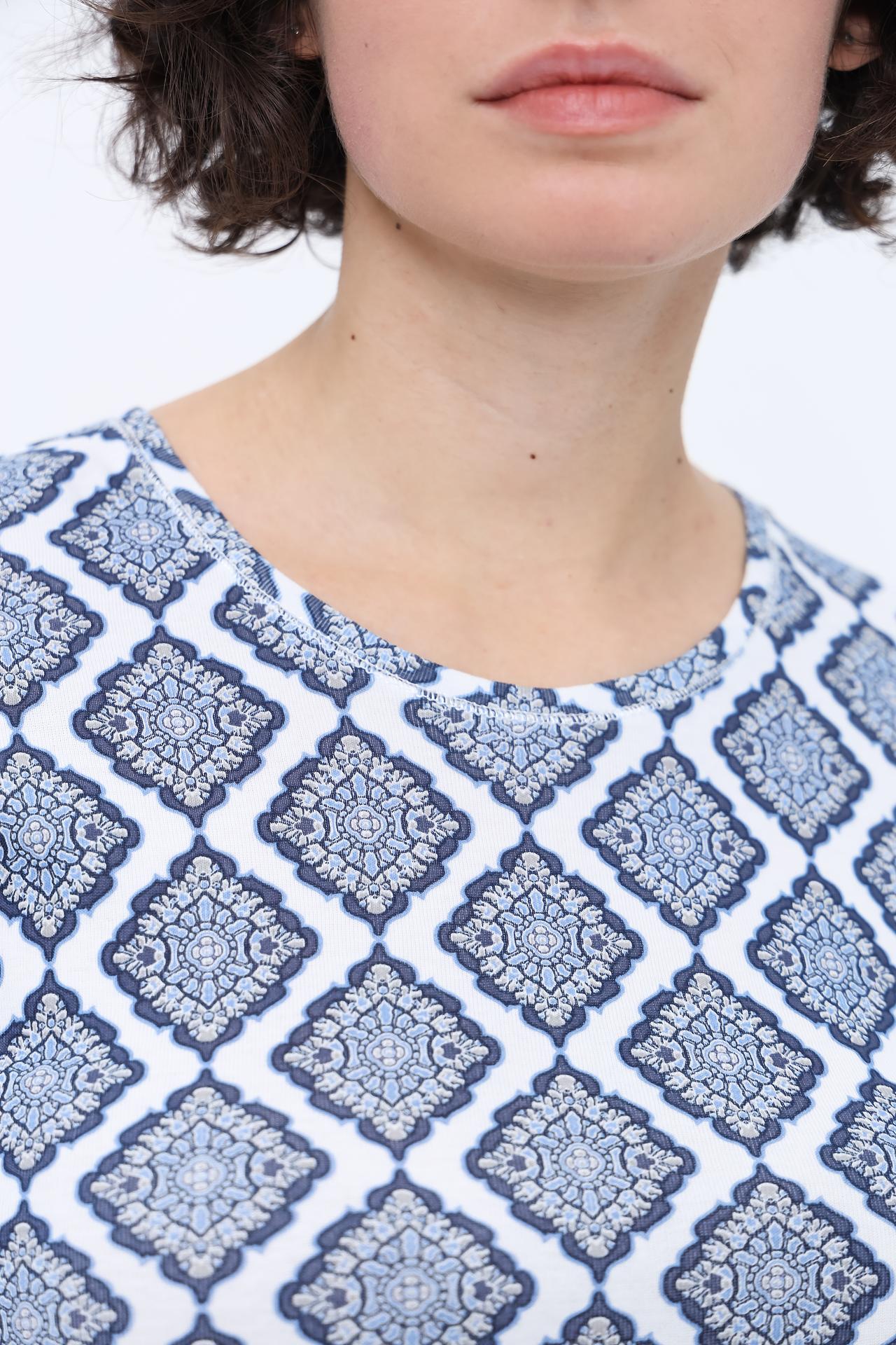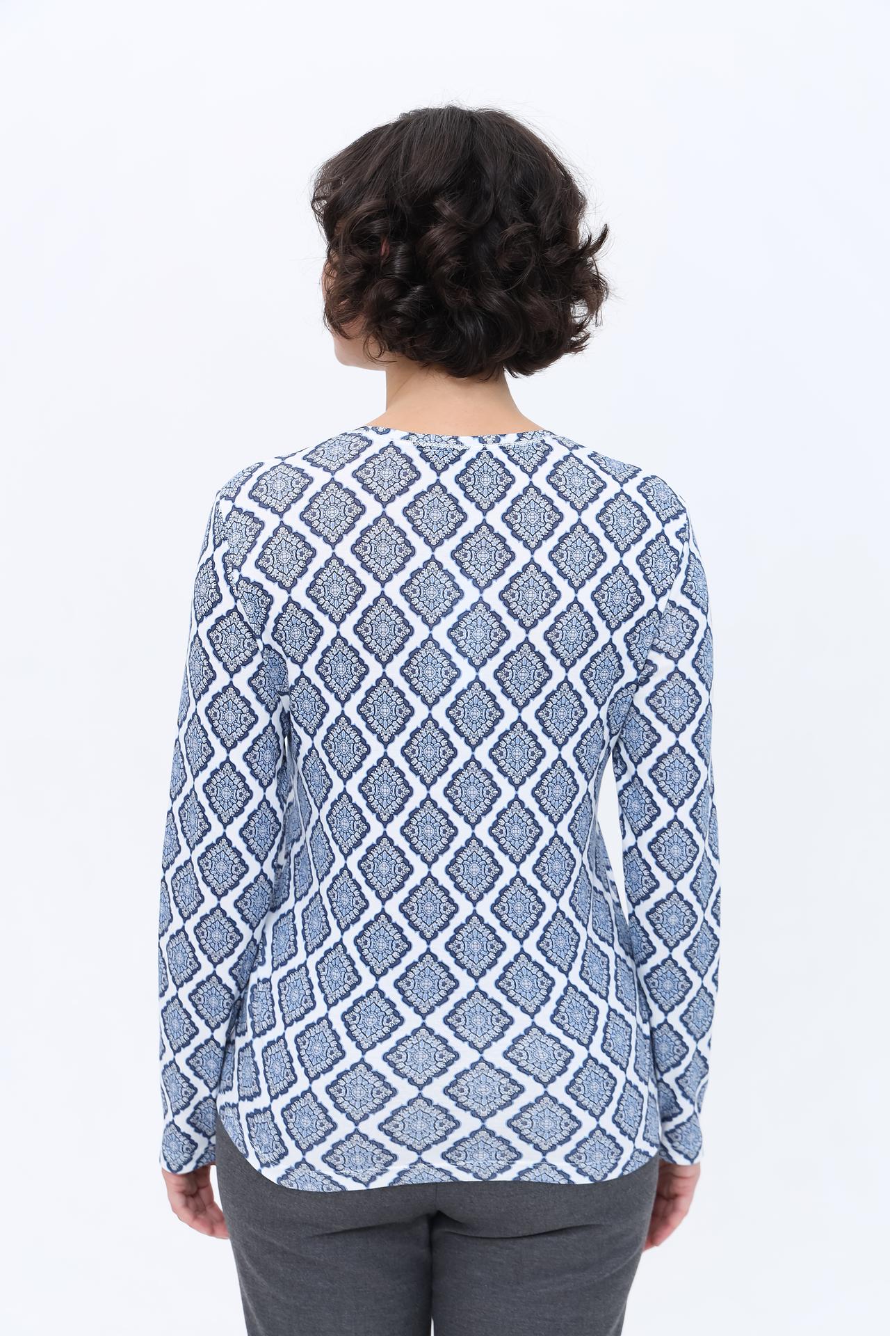 - Стильный дизайн: Утонченный геометрический принт в оттенках синего на белом фоне придает изделию особую элегантность и легко сочетается с различными цветами нижней части гардероба.