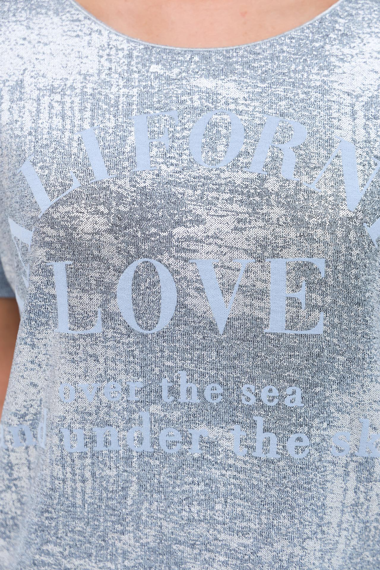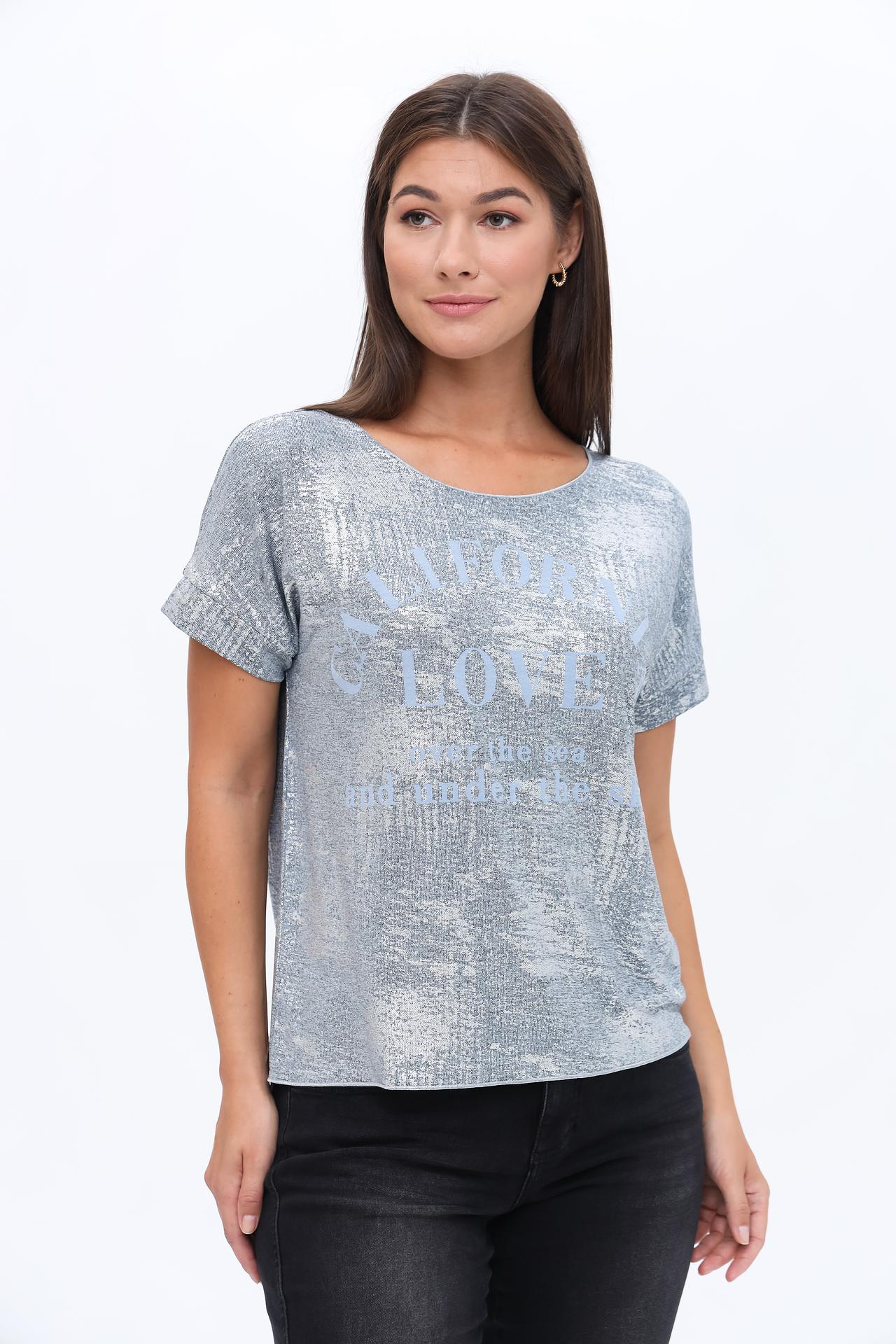 - Современный дизайн: Блуза отличается актуальным эффектом "потертого" металлика, который создает уникальную текстуру, а голубой буквенный принт добавляет контраст и современность. Свободный крой с приспущенной линией плеча и отворотами на рукавах обеспечивает расслабленную и стильную посадку.