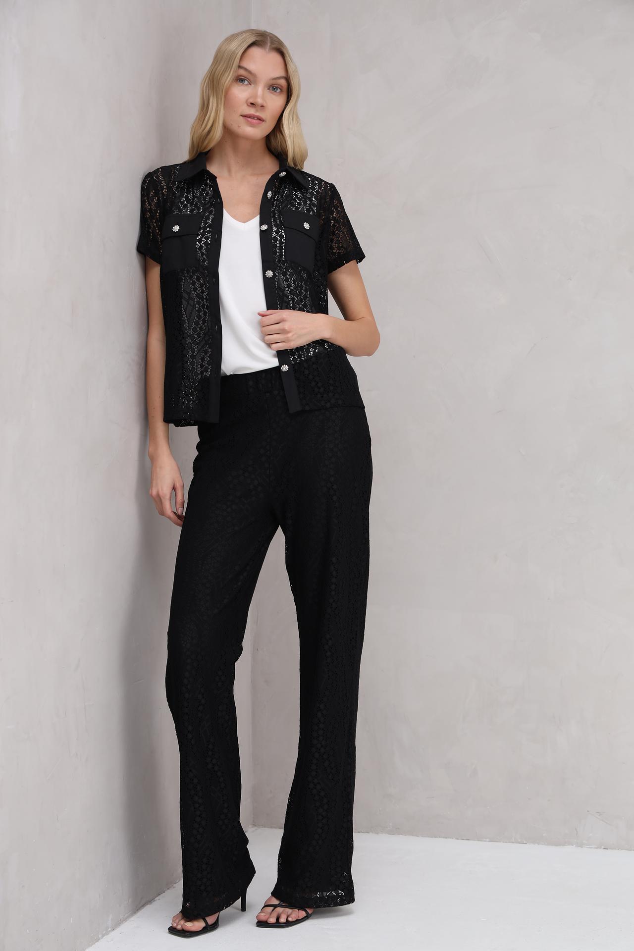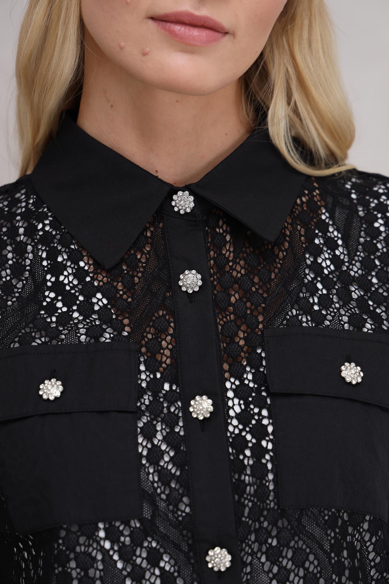 - Дизайн: Полупрозрачный кружевной узор создает изысканный и женственный силуэт. Отложной воротник и застежка на пуговицы в сочетании с накладными карманами на груди придают изделию структуру и элегантность. Декоративные пуговицы с кристаллами добавляют роскошный акцент.