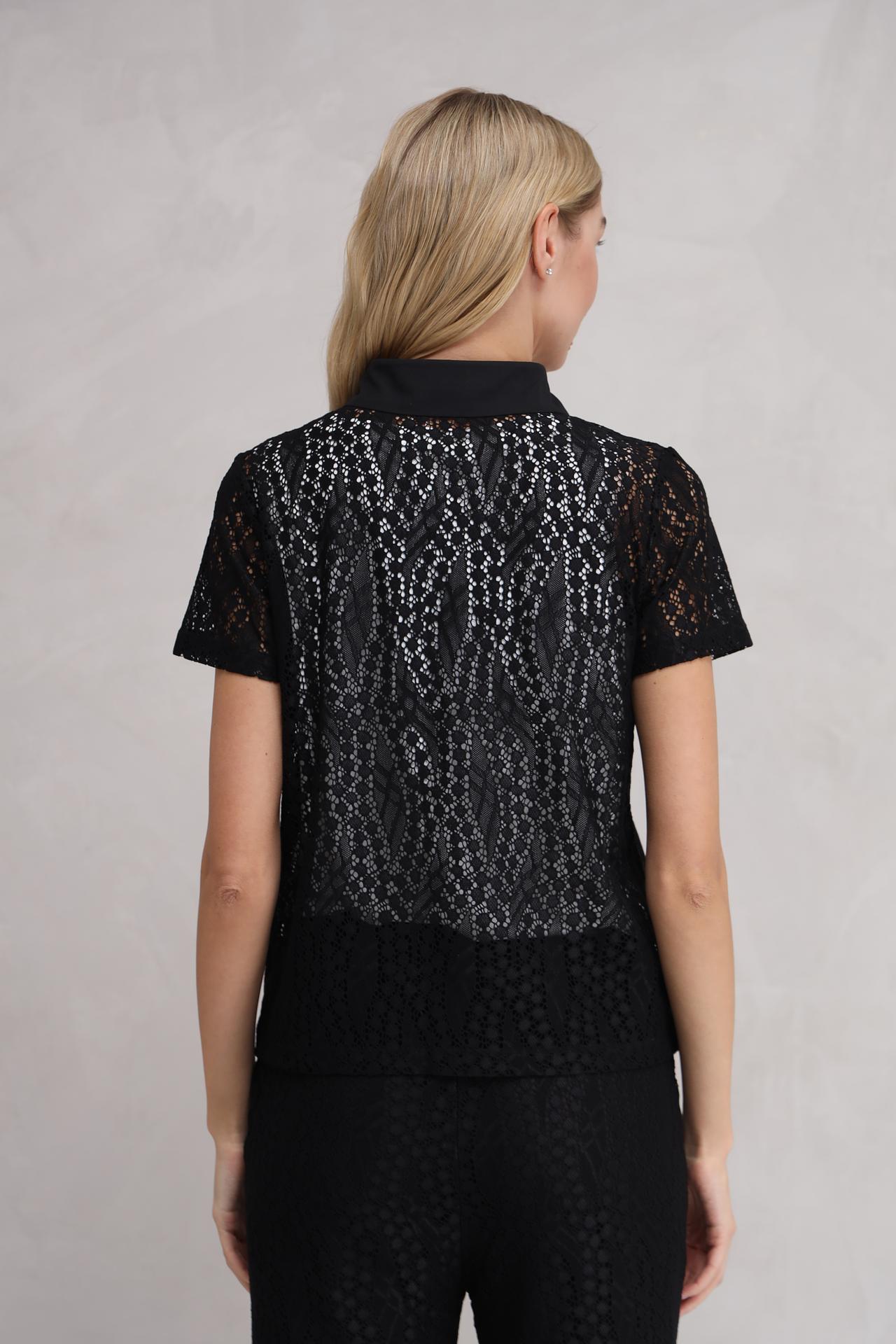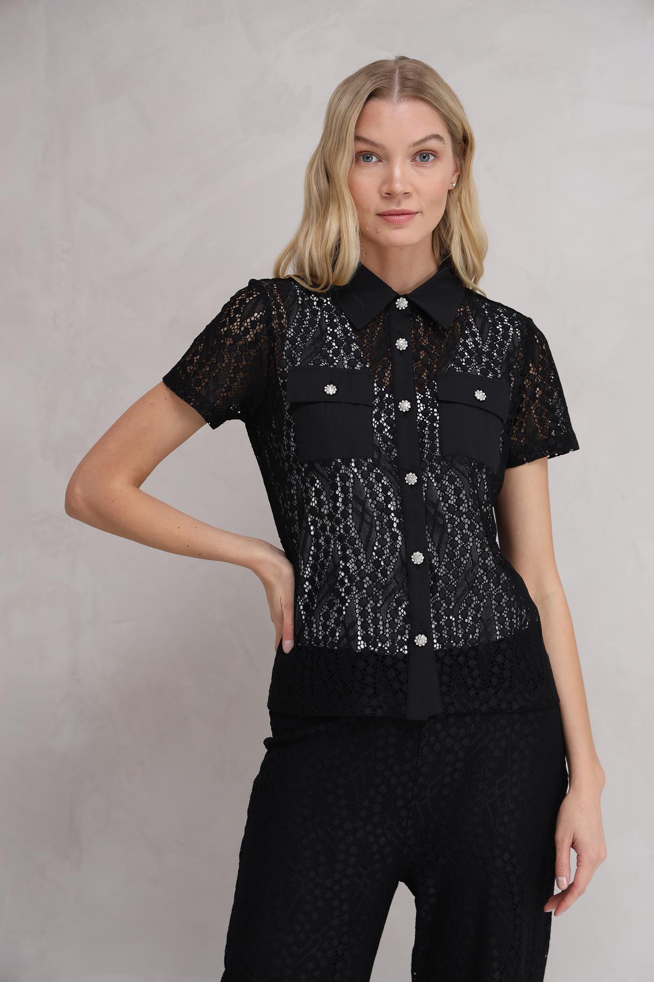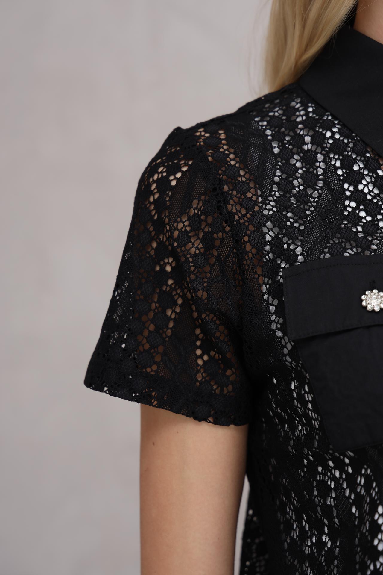- Детали: Краткие рукава и классический крой делают эту блузу идеальным выбором для теплой погоды. Изящные детали, такие как пуговицы-кристаллы и фактурное кружево, подчеркивают изысканность дизайна и внимание бренда к мелочам.