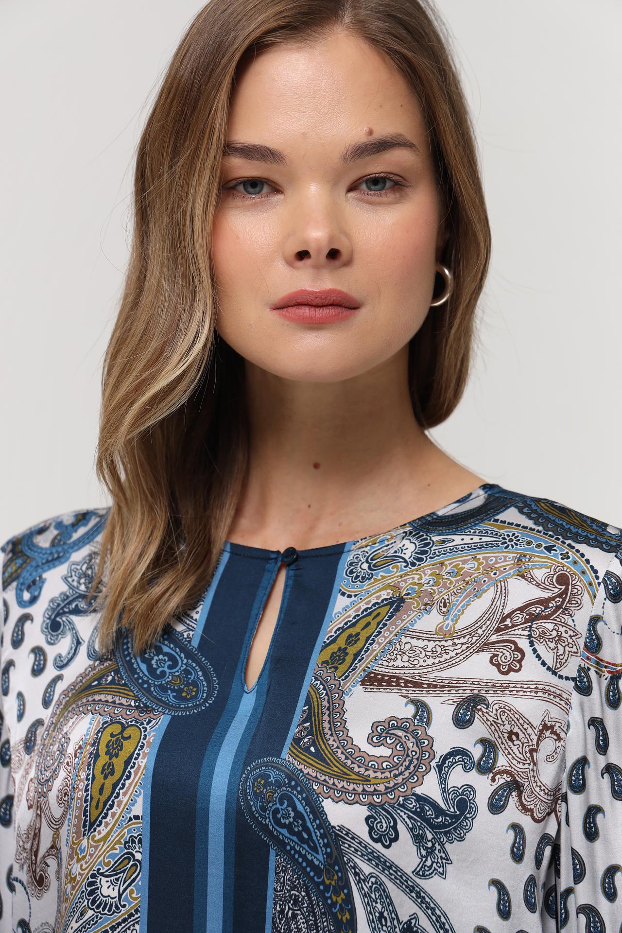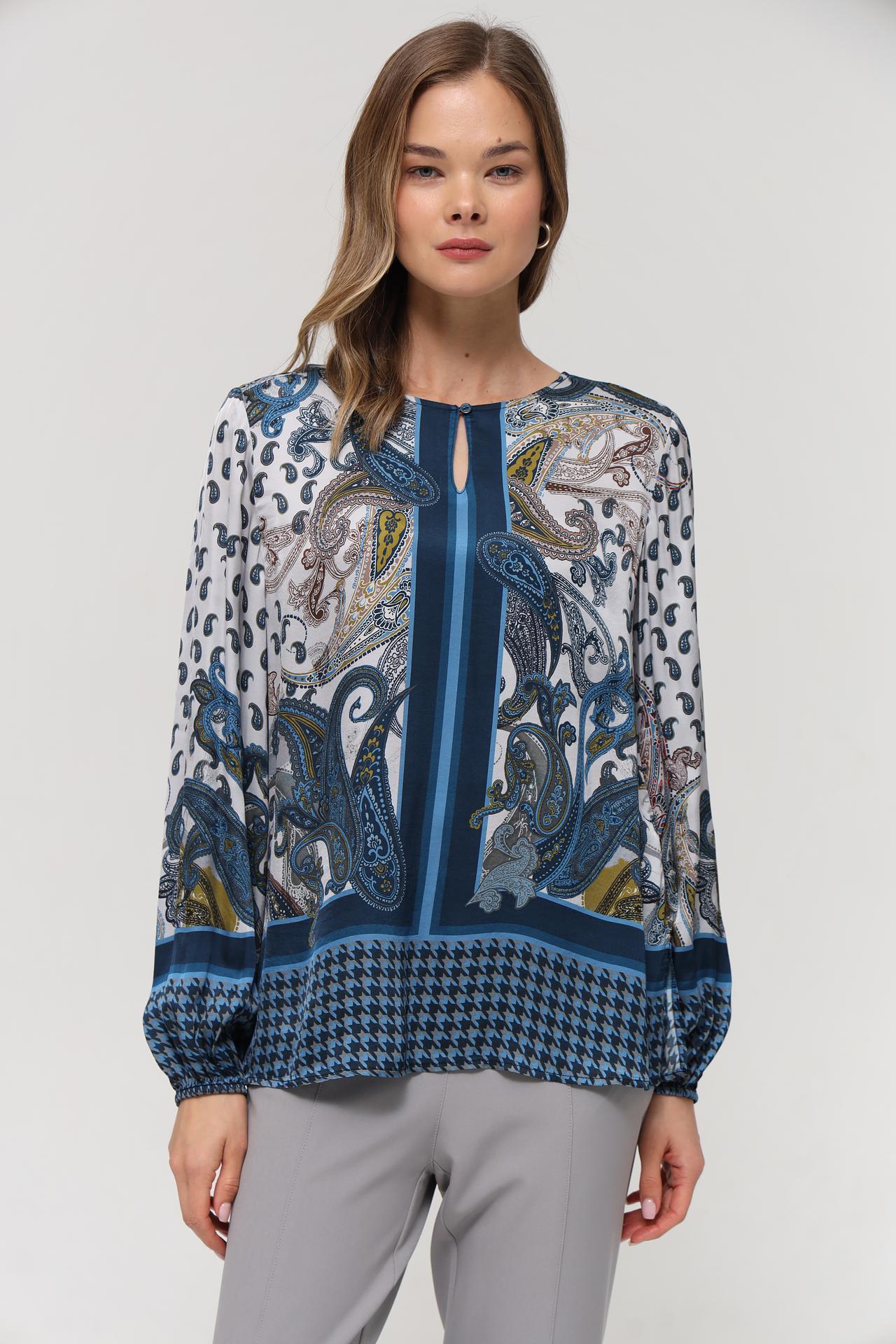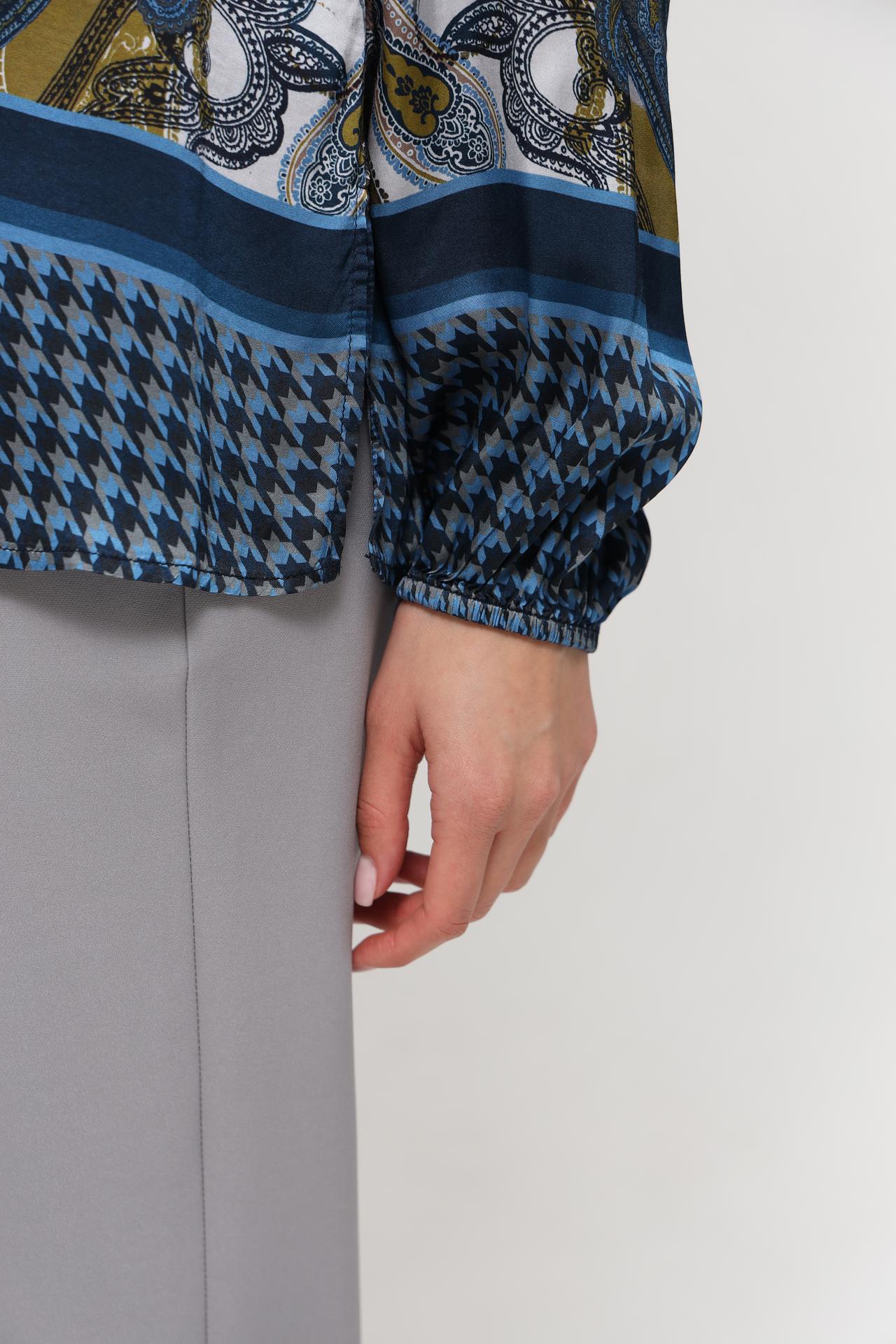 - Универсальный дизайн: Сочетание классических узоров и яркой палитры позволяет легко комбинировать блузу как с деловыми брюками, так и с джинсами или юбками для создания разнообразных образов.