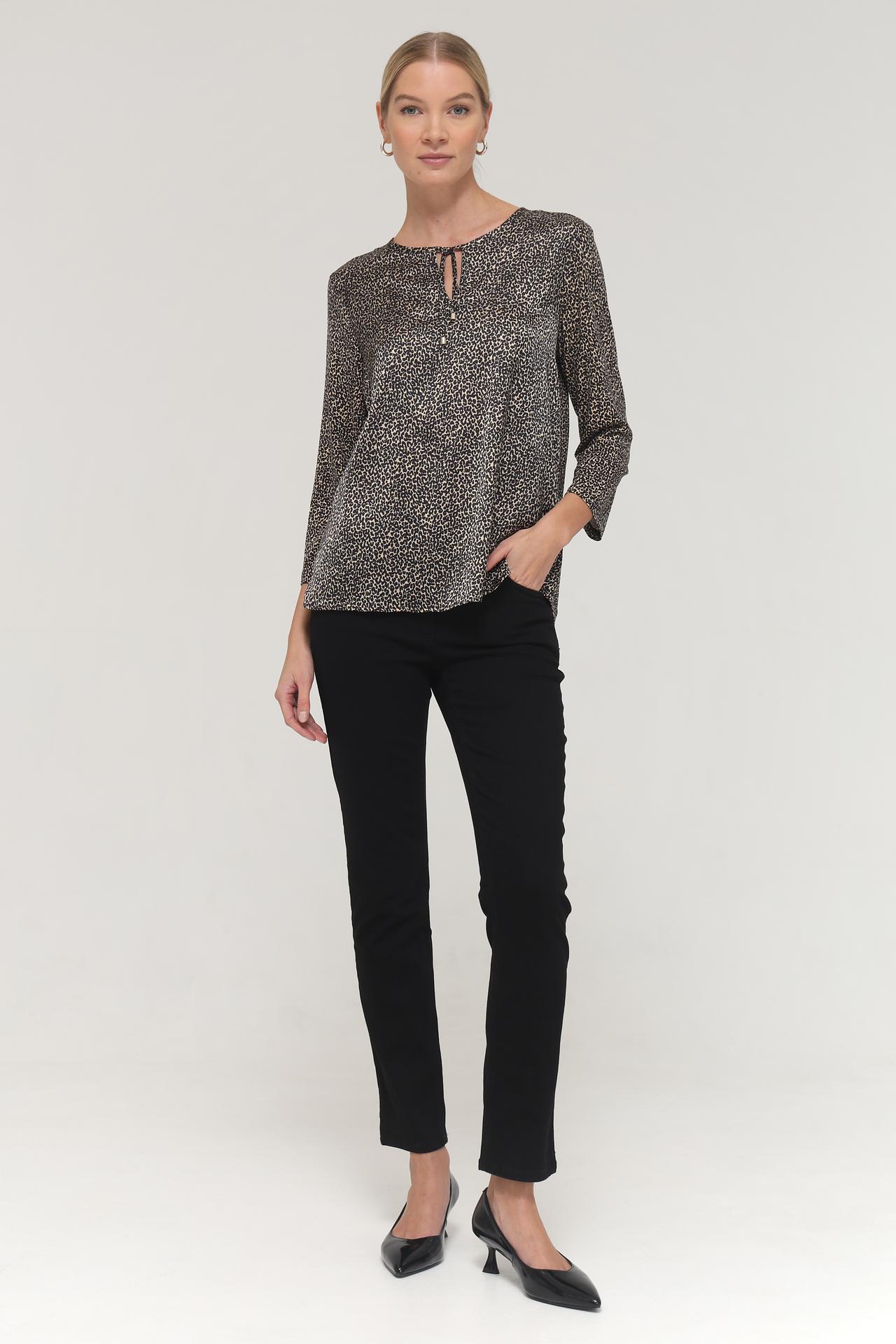 Дизайн блузы дополнен V-образным вырезом с завязками-бантом и элегантными пуговицами, что придает изделию особую изысканность. Три четверти рукава и свободный крой делают эту блузу универсальной для любого случая, будь то повседневный выход или особое событие. Прекрасно сочетается как с классическими брюками, так и с джинсами.