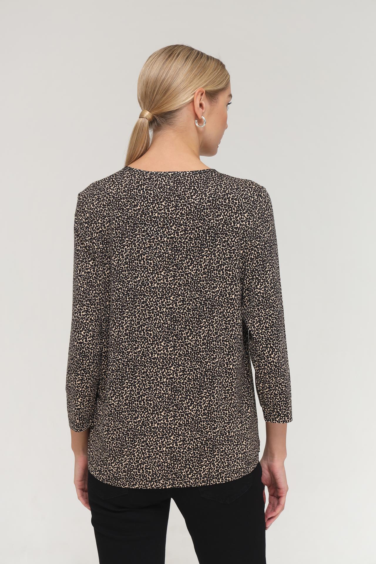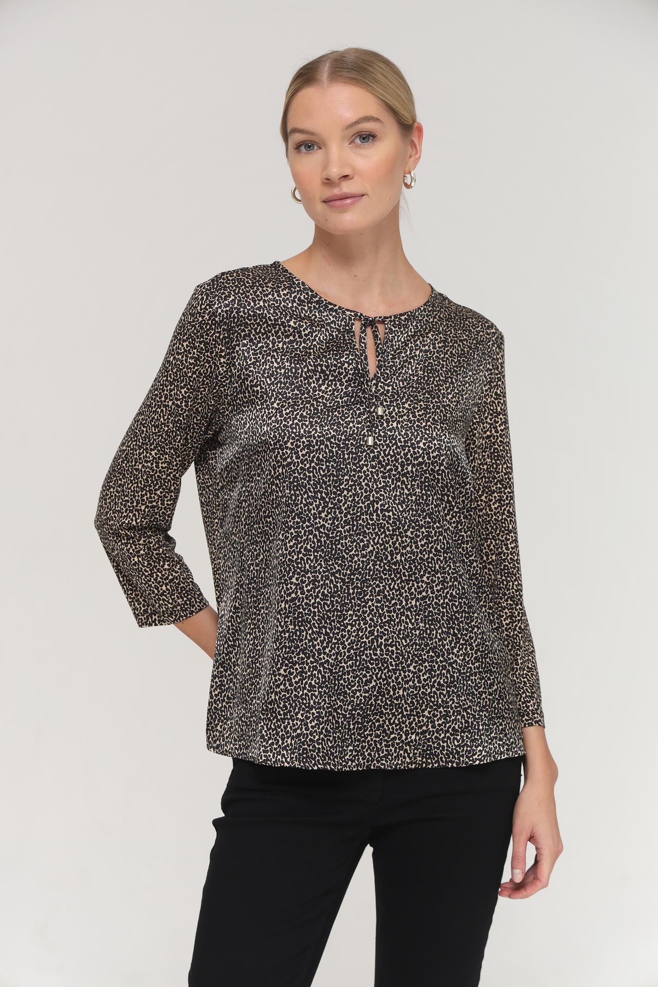 - Дизайн: Эффектный леопардовый принт и V-образный вырез с декоративными завязками и пуговицами создают модный и женственный образ.