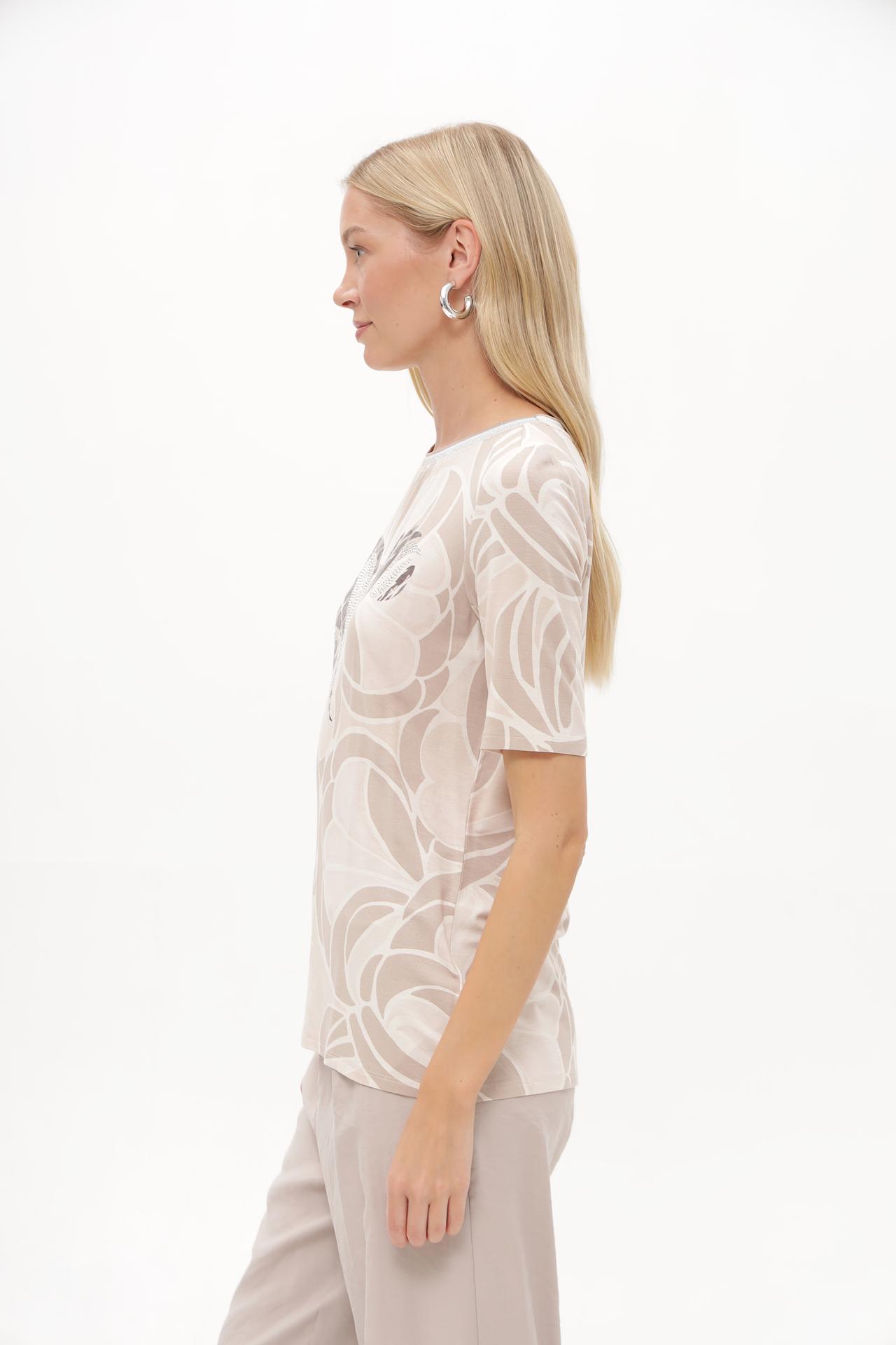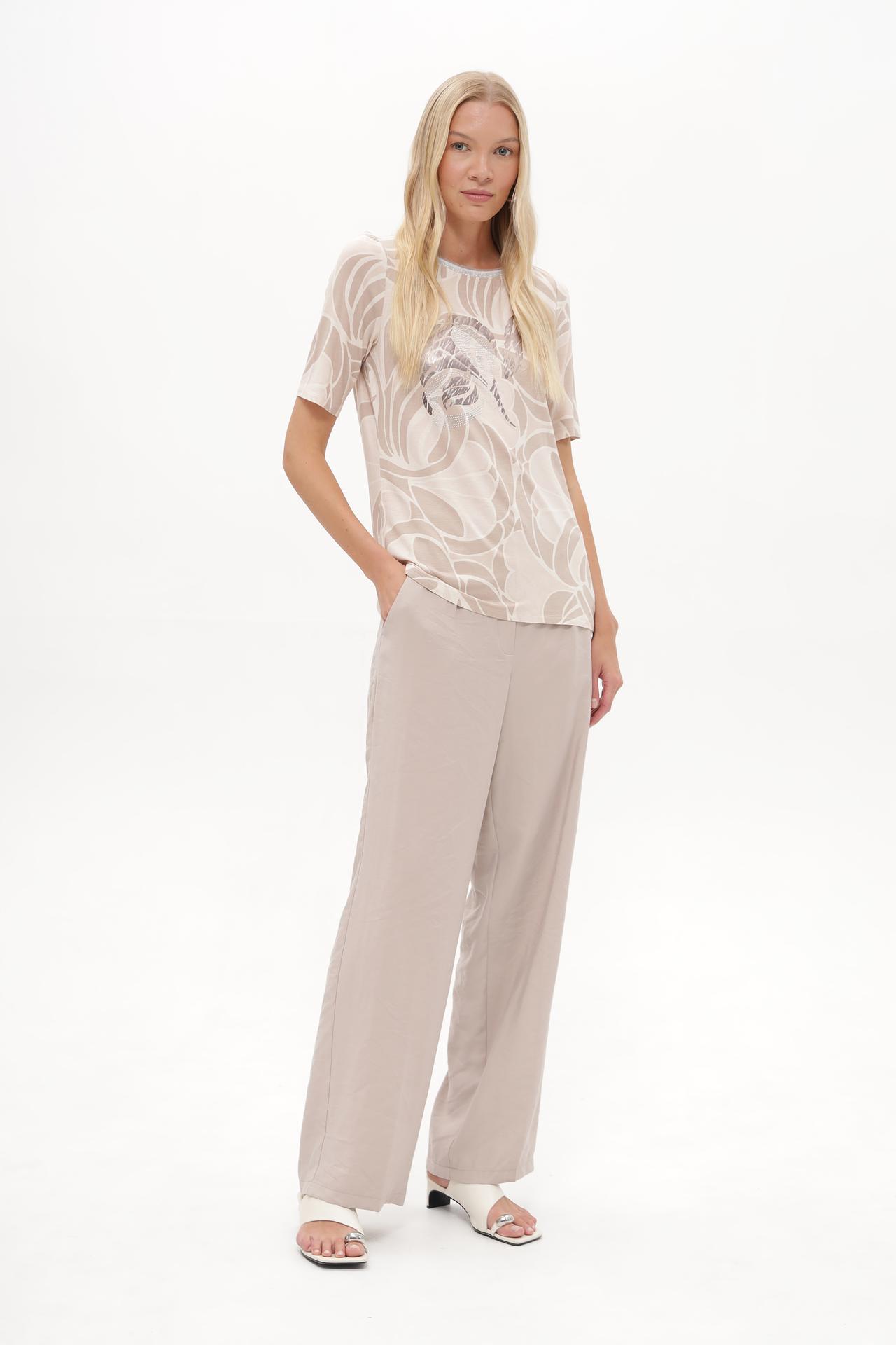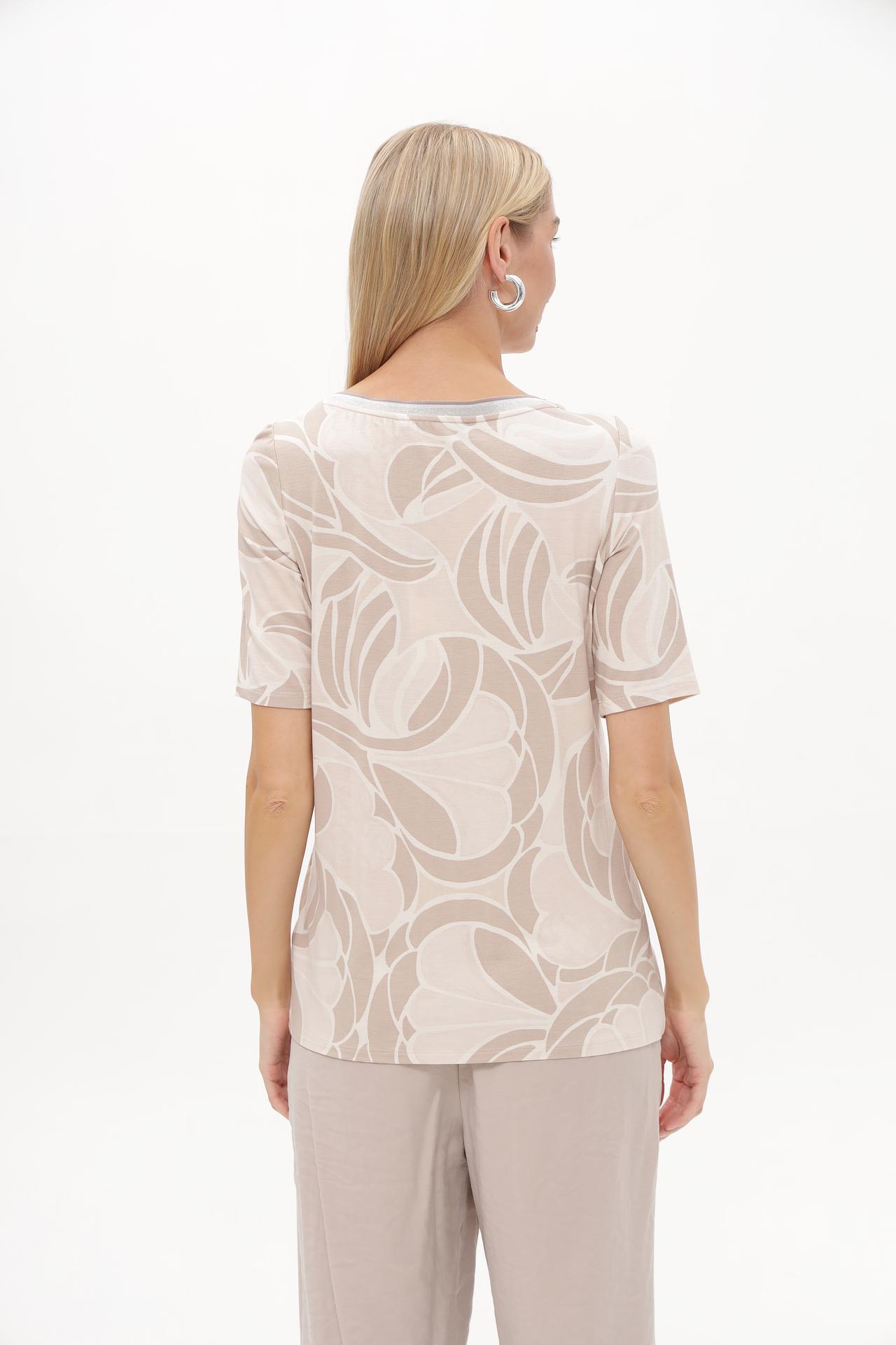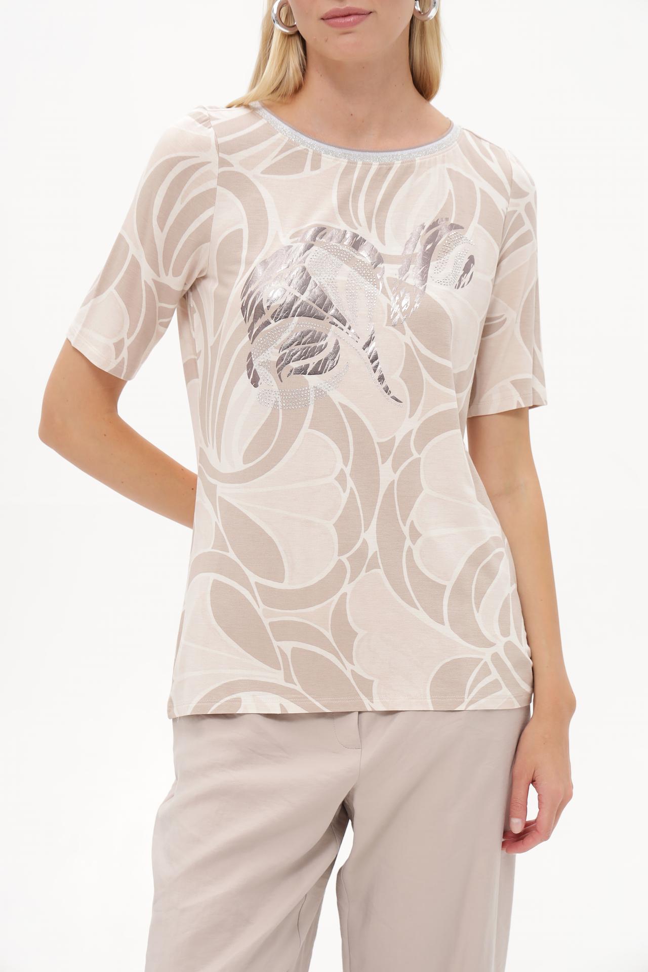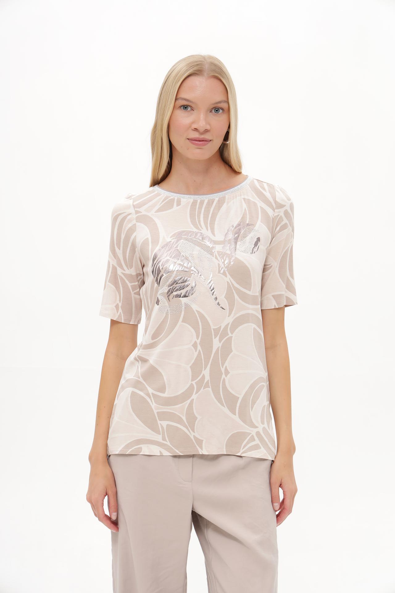 Блузка декорирована красивым принтом и имеет круглый вырез горловины. Такой дизайн делает ее универсальной, позволяя сочетать с различными элементами гардероба. Подчеркните свой безупречный вкус с новой блузкой!