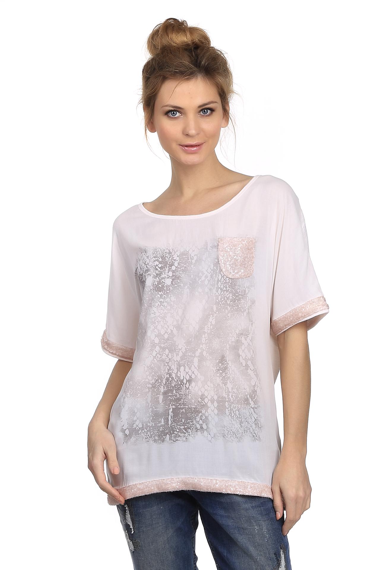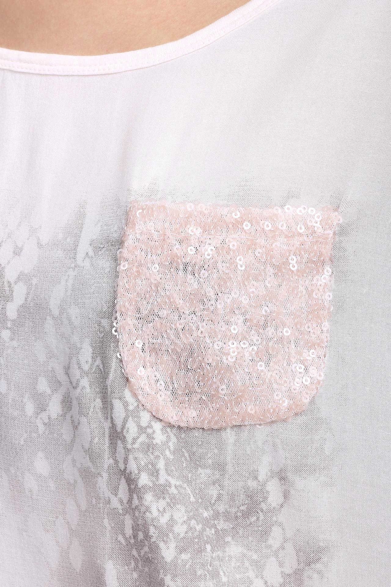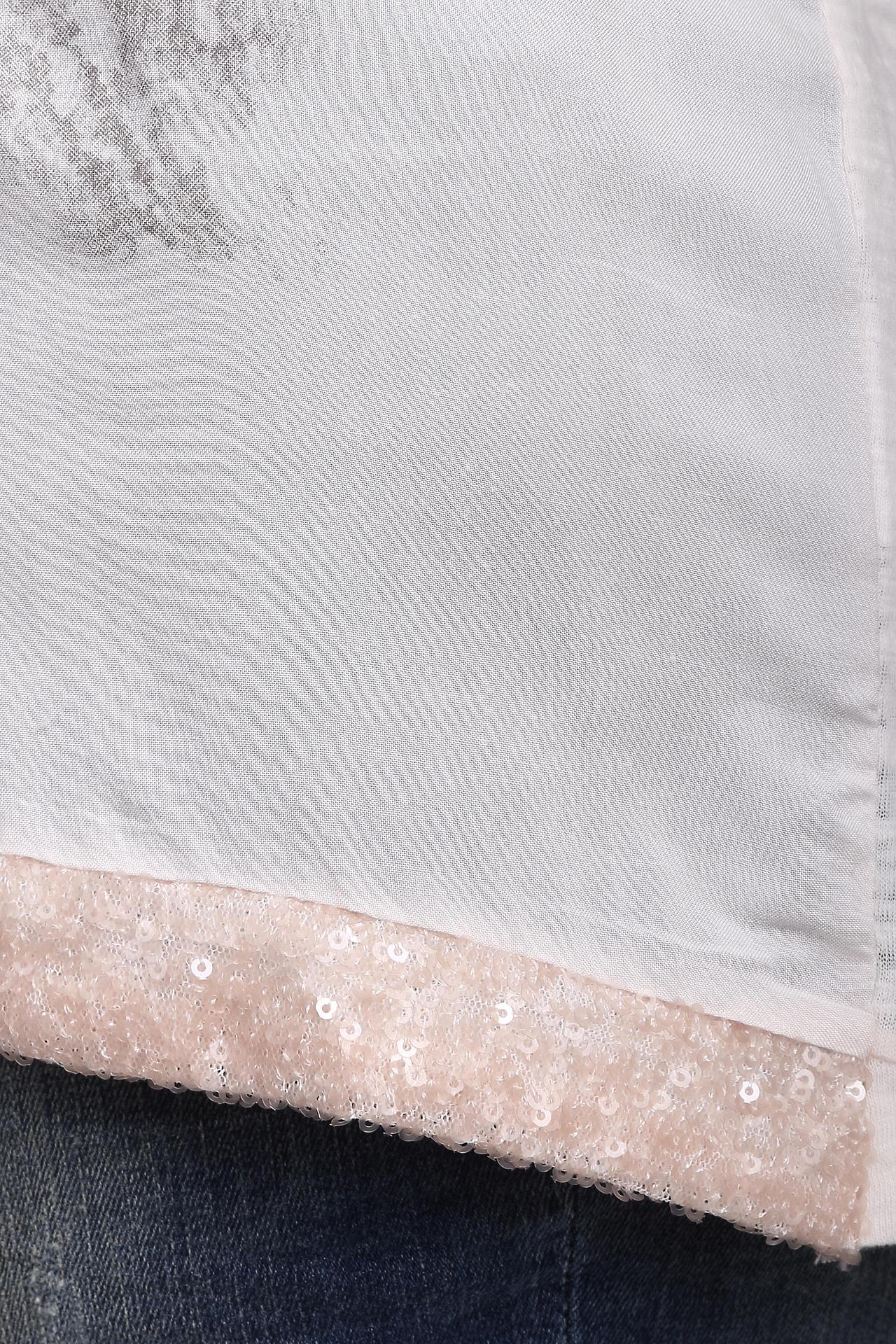 Блуза отличается оригинальным дизайном с принтом, который придает изделию особую изюминку. Декоративный нагрудный карман и нижняя отделка, украшенные мерцающими пайетками, добавляют образу женственности и роскоши.