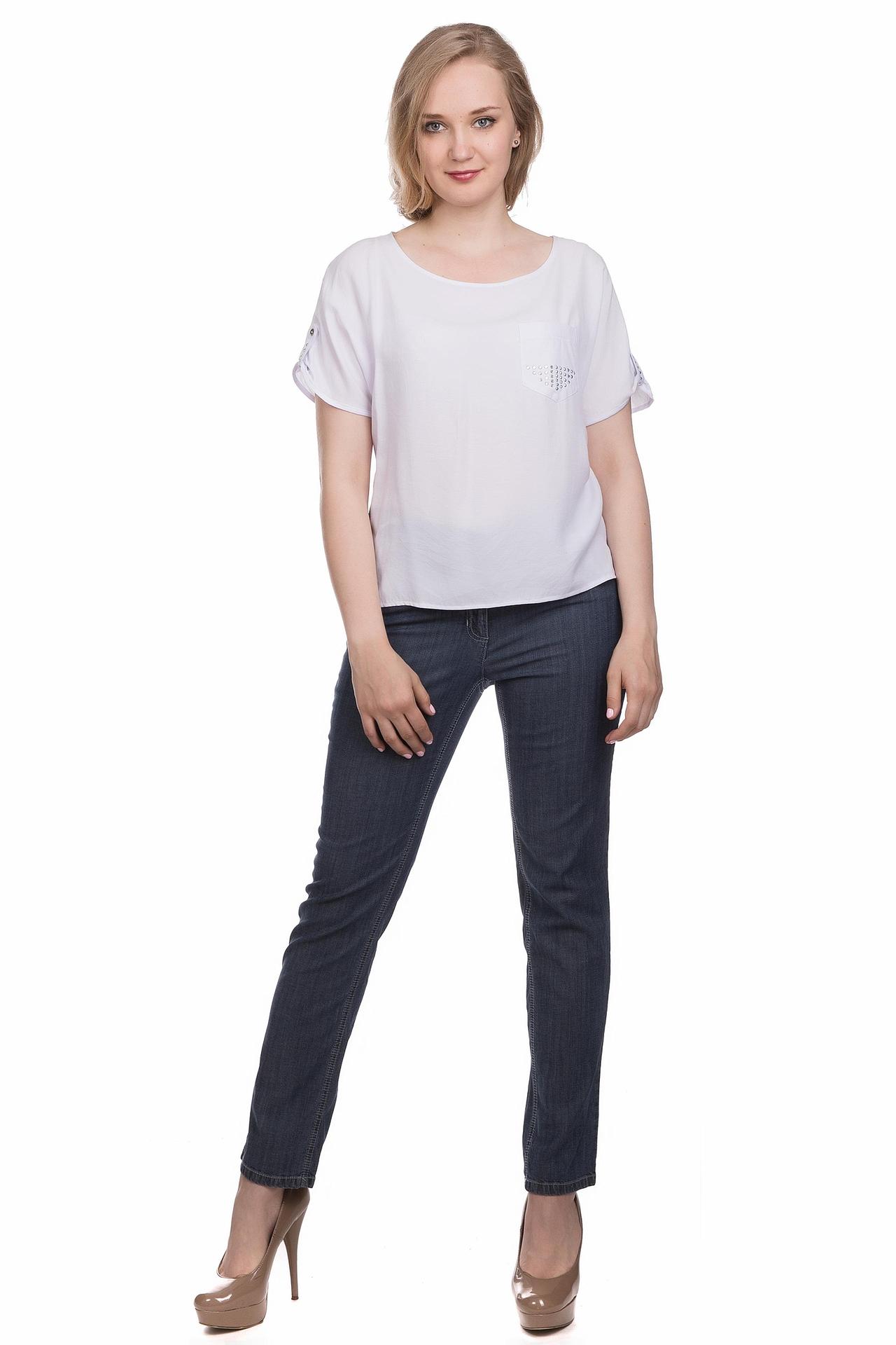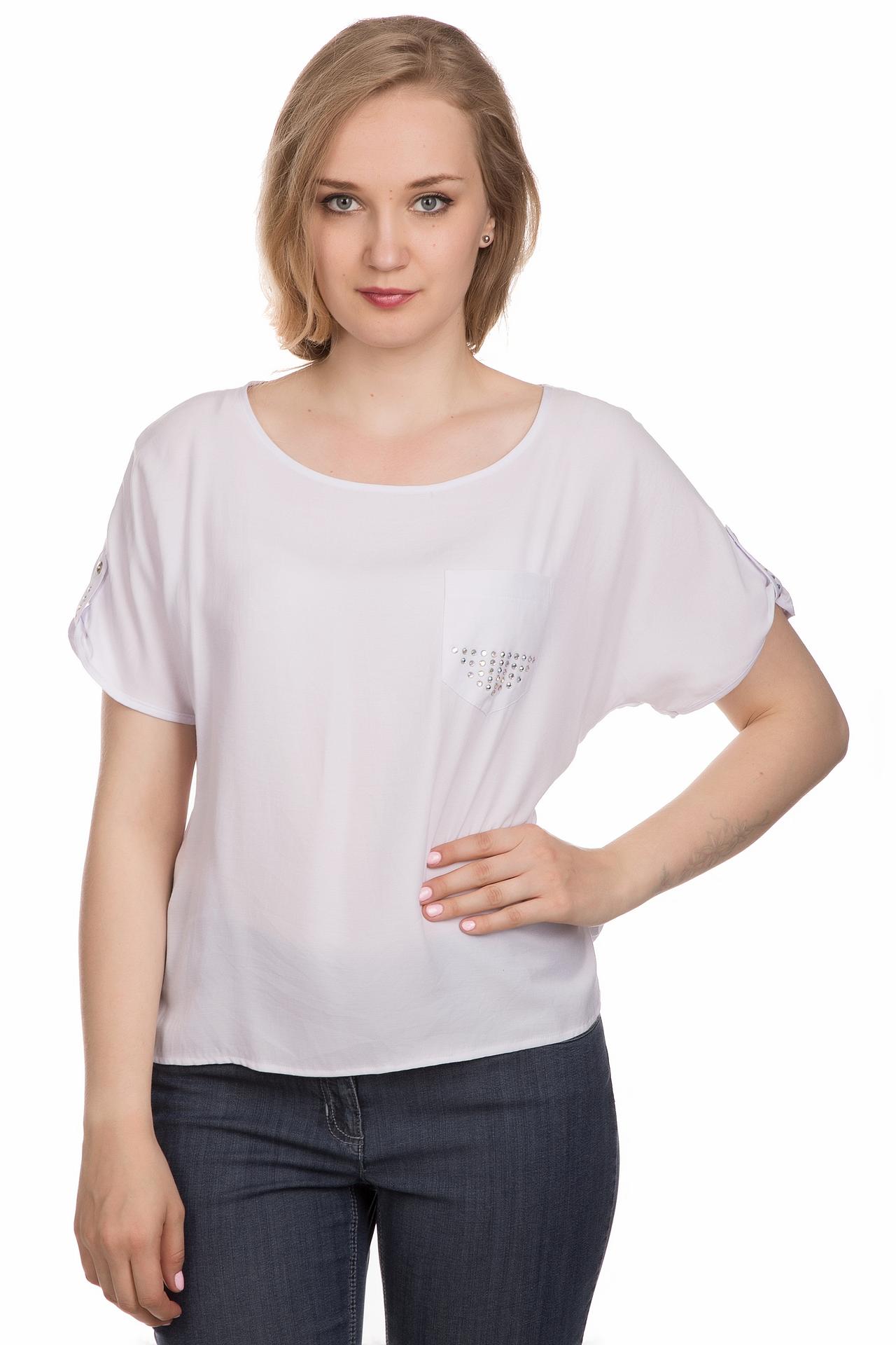Блуза фирмы Steilmann белого цвета. Модель выполнена прямым свободным покроем. Рукав короткий - реглан. Длина изделия до бедер. На передней части блузки пришит накладной карман с украшением, выполненный стразами. Рукава дополнены тесьмой с пуговицей. Все эти детали придают блузки нарядность . Дизайн блузки может быть использован в брючных костюмах.