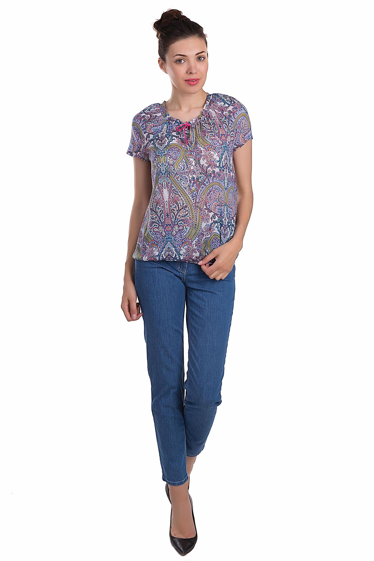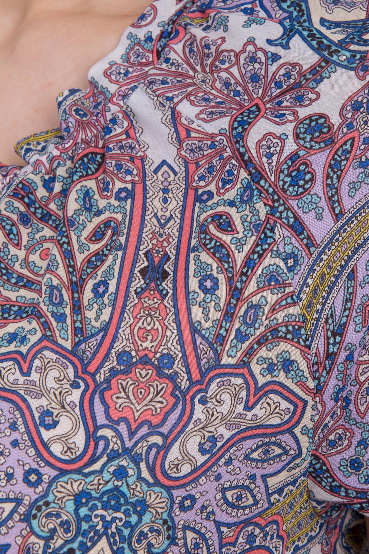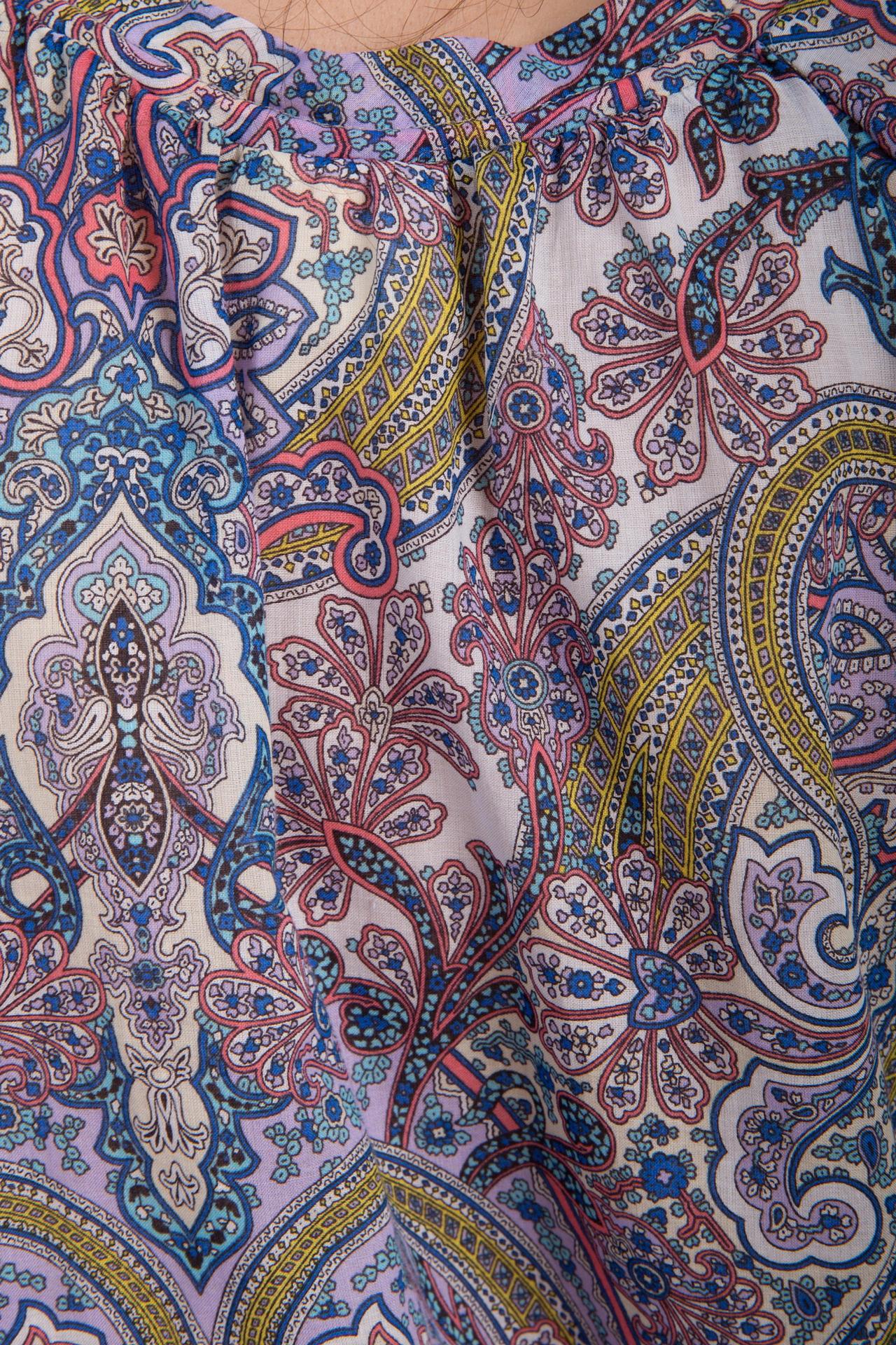 Яркий узор пейсли, включающий насыщенные синие, розовые, желтые и зеленые оттенки на светлом фоне, придает модели летнее настроение и оригинальность. Свободный крой и короткий рукав гарантируют полную свободу движений, а декоративный шнурок на горловине добавляет женственности и позволяет регулировать вырез.
