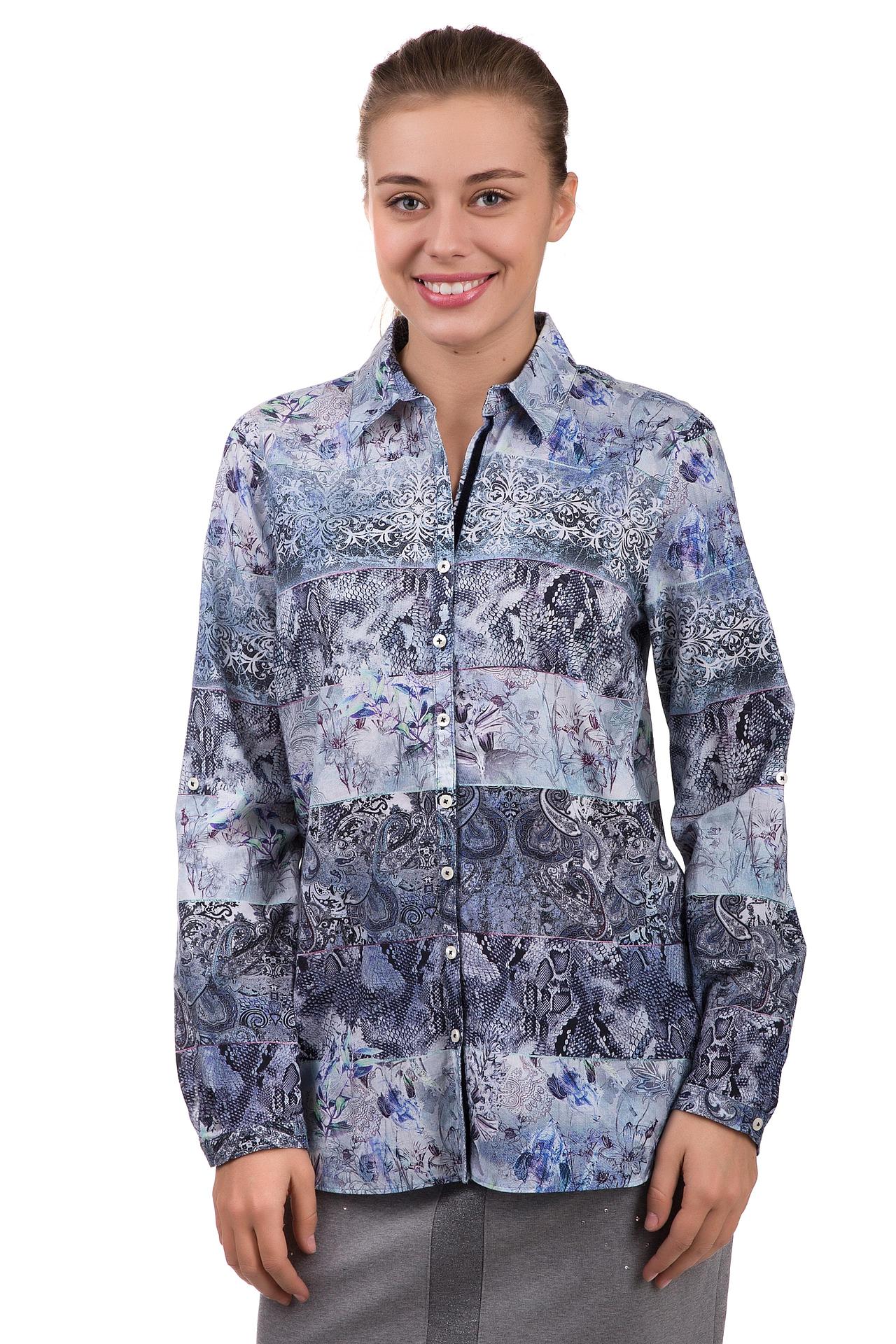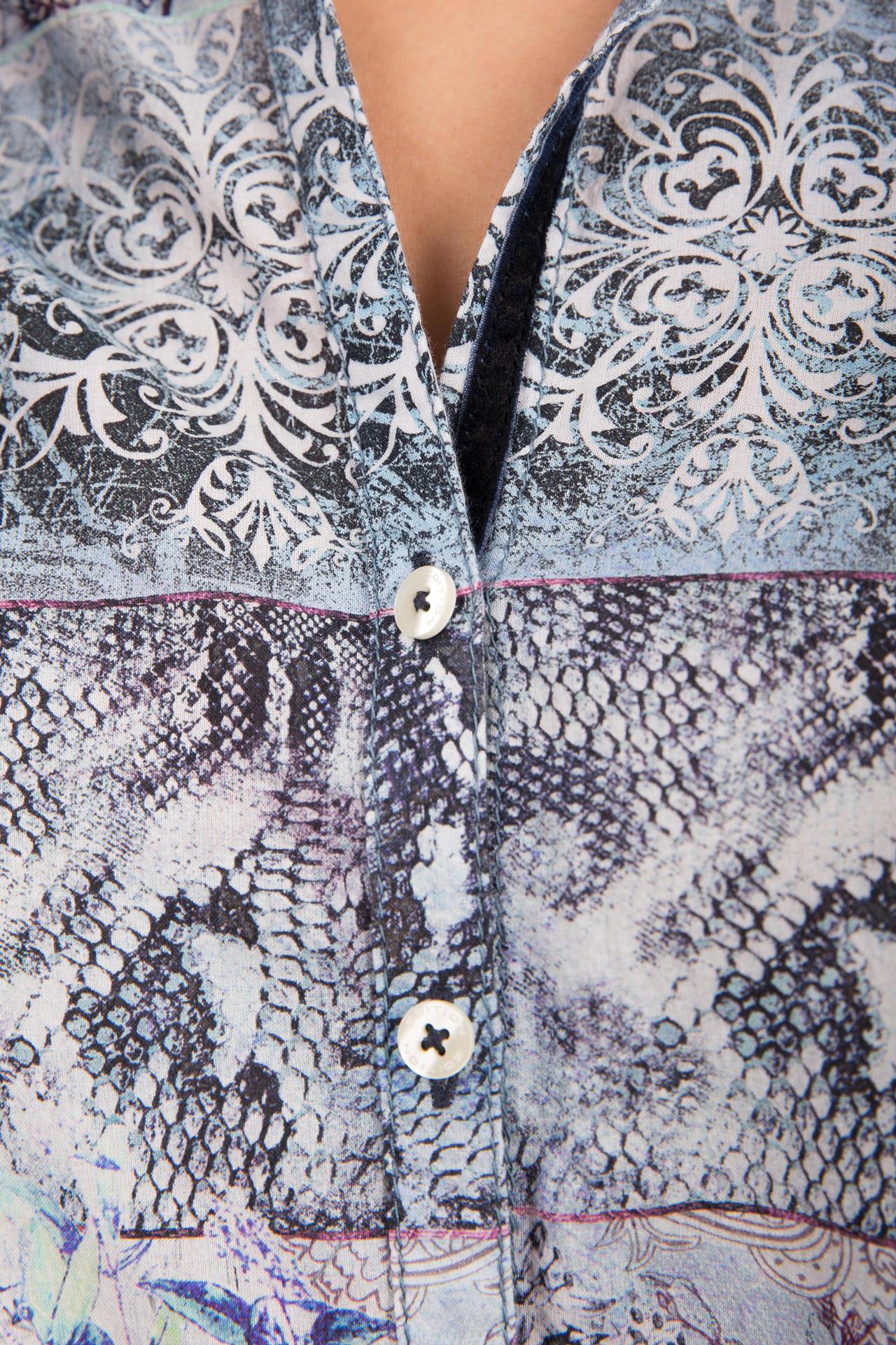 - Уникальный дизайн. Многослойный принт с чередующимися полосами различных узоров – от классических вензелей до анималистических элементов – придает блузе неповторимый и современный вид. Это позволяет легко комбинировать ее с однотонными брюками, юбками или джинсами.
