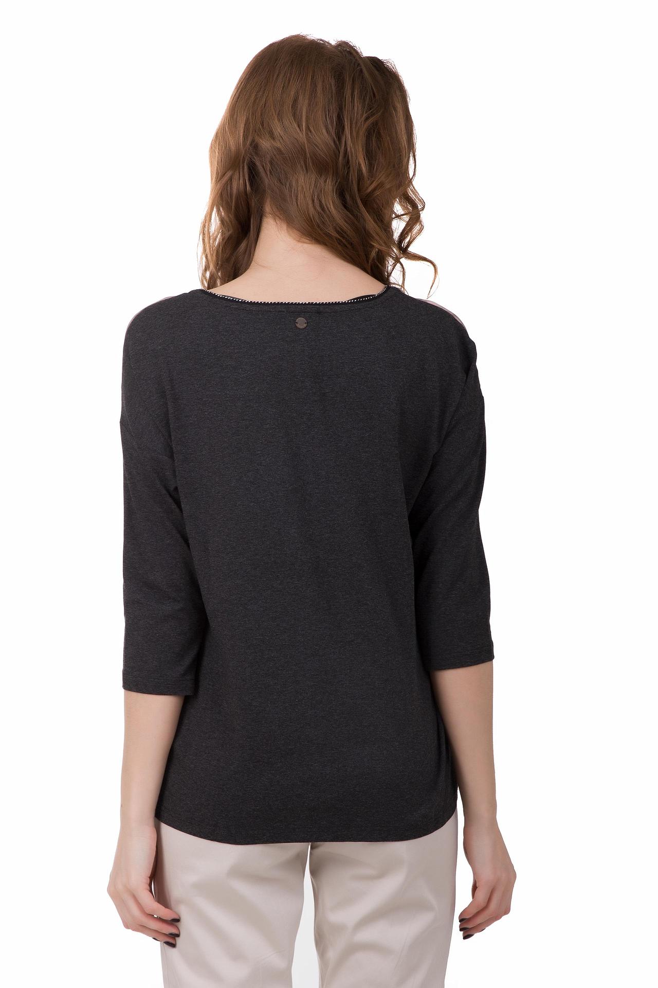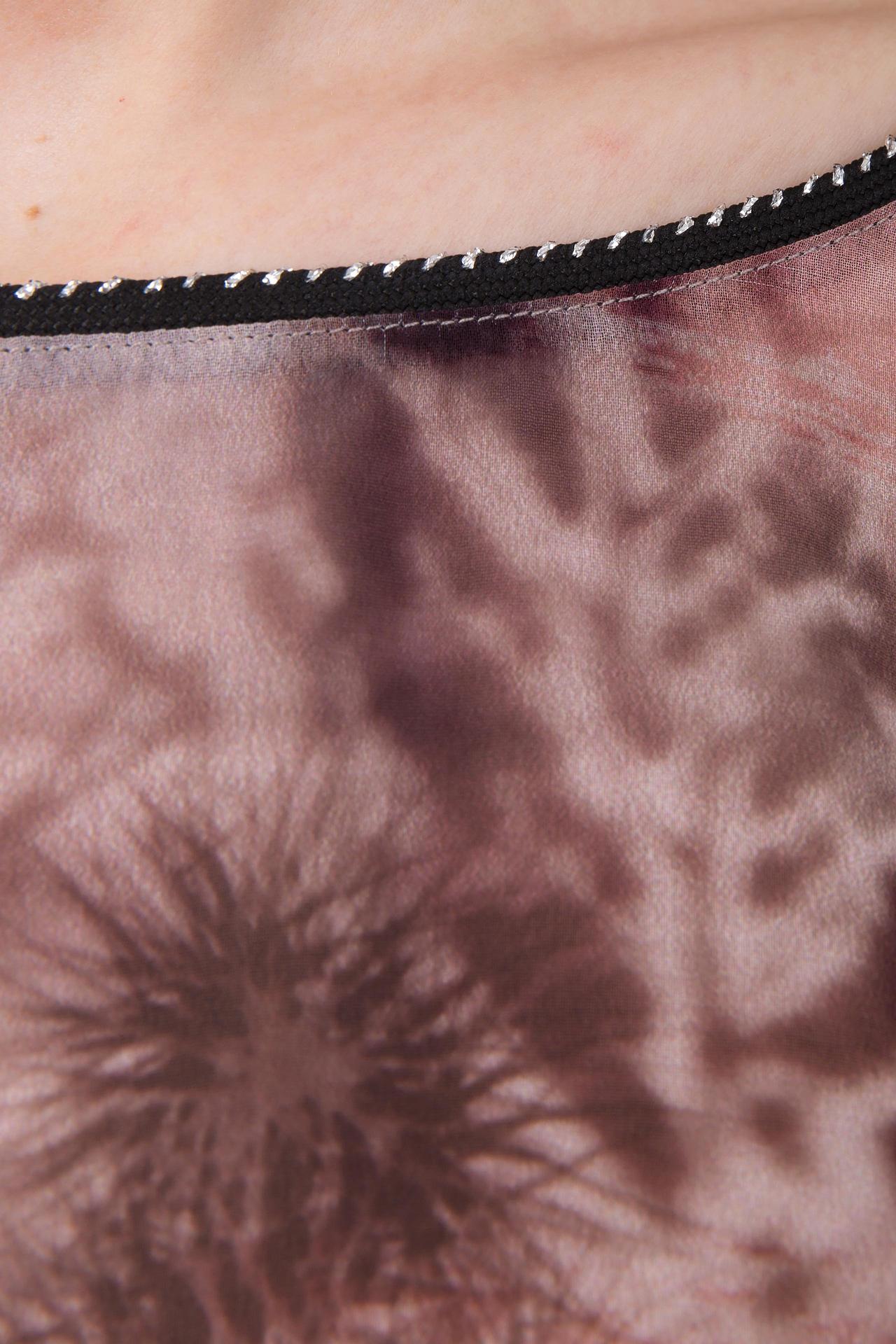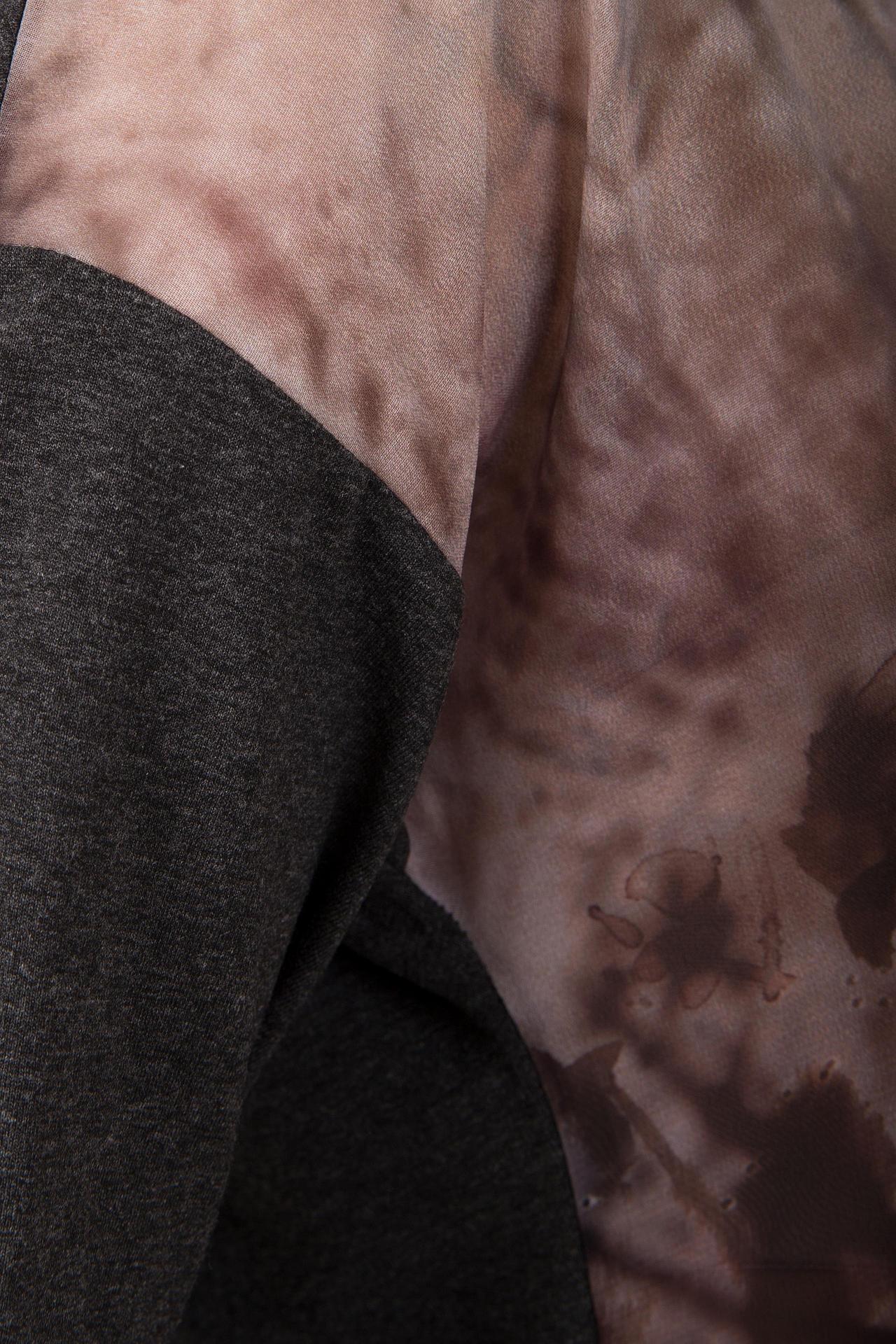 - Дизайн: Модель отличается комбинированным дизайном: передняя часть украшена уникальным принтом, а рукава и спинка выполнены из однотонного материала. Круглый вырез горловины отделан деликатной декоративной тесьмой.