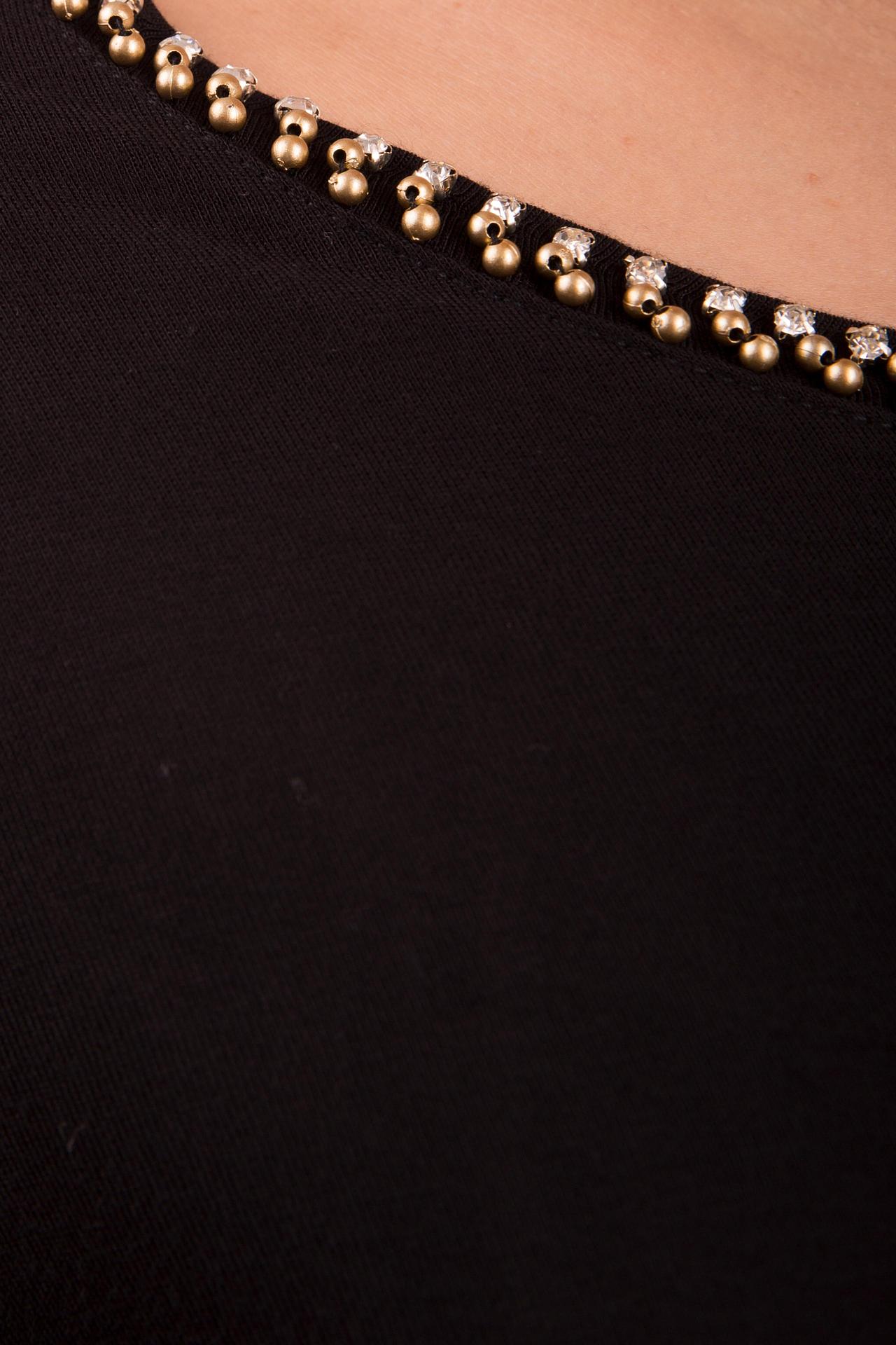 Блузa Pezzo облегающего силуэта в черном цвете. Сделана из 100%-ной вискозы. Главная деталь этой вещи – овальный вырез горловины, отделанный вышивкой из золотистых бусин и стразов. Согласитесь, довольно интересная комбинация. Возможности комбинирования данной вещи действительно безграничны.