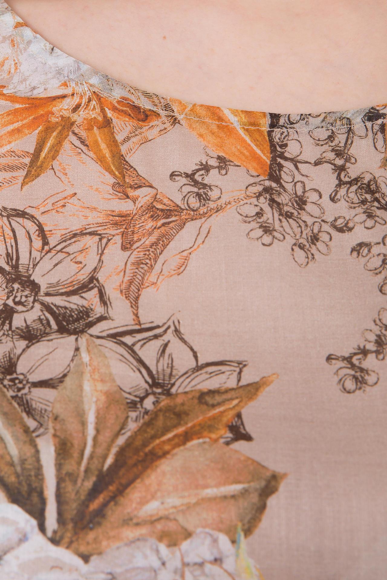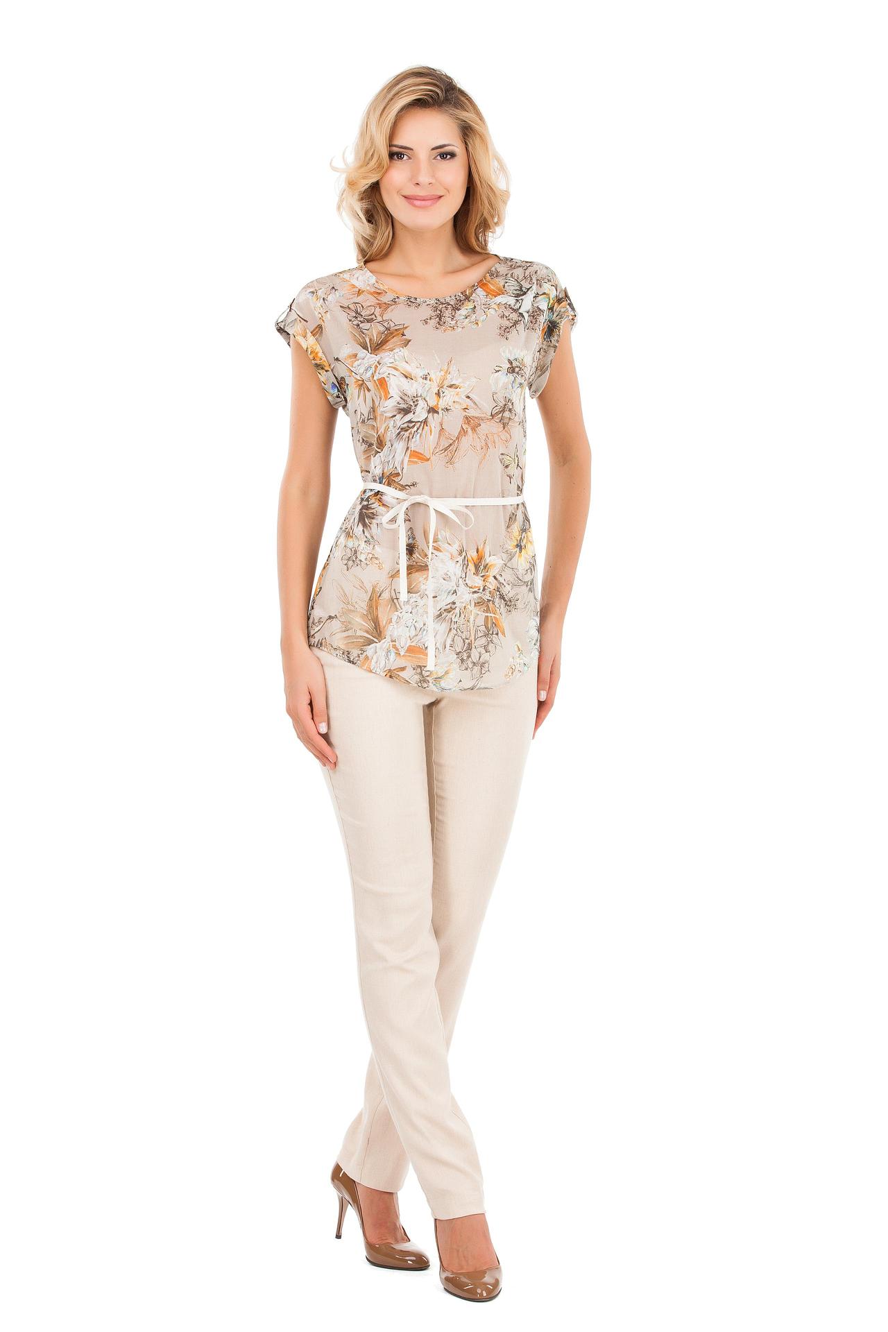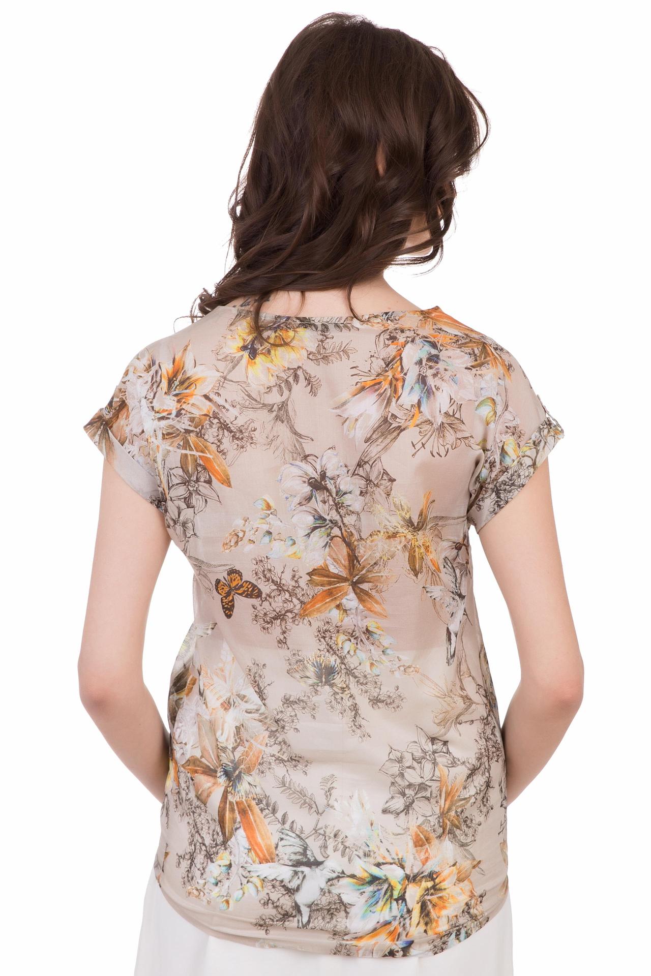 - Цвет: Основа блузы – нежный бежевый, дополненный многоцветным принтом, включающим оттенки оранжевого, коричневого, зеленого и синего.