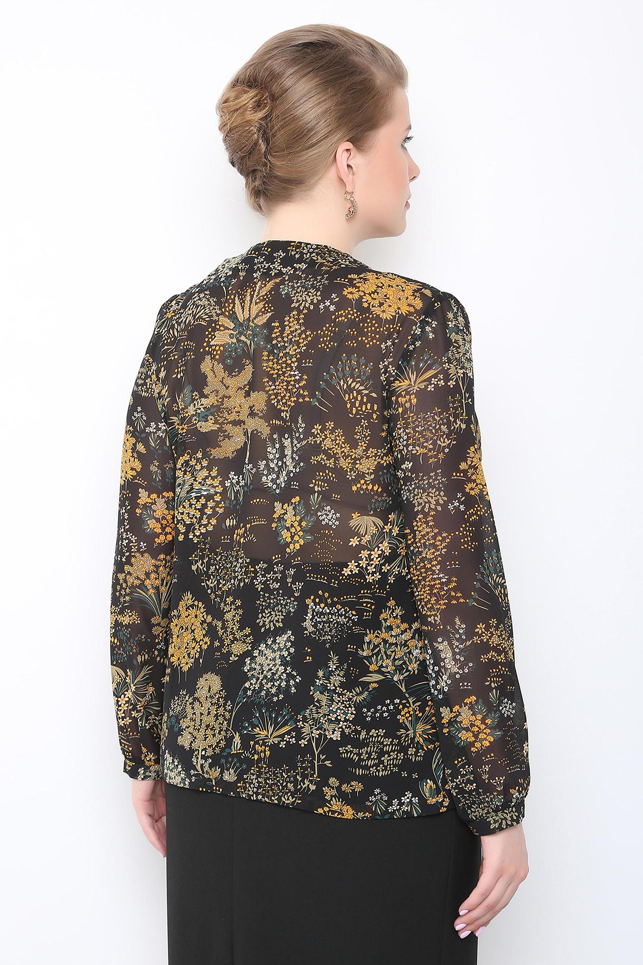 Блуза имеет стильный крой и украшена элегантными завязками, которые придают ей особый шарм. Цветочный принт на чёрном фоне выглядит очень эффектно и привлекательно. Эта блузка станет отличным дополнением к вашему гардеробу, позволяя создавать разнообразные и запоминающиеся образы.