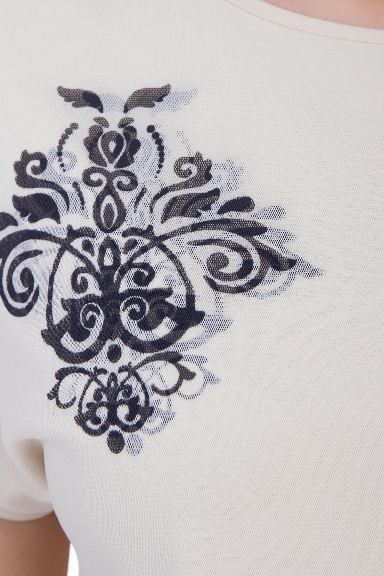 Футболка Eugen Klein бежево-черная. Красивый фантазийный узор на лифе модели смотрится действительно безупречно. Низ изделия украшен – двойной эффект на пике популярности уже далеко не один сезон. Состав: вискоза и эластан. Такая модель для лета – это именно то, что нужно. Футболка великолепно сочетается с самыми разными брюками, юбками и шортами.