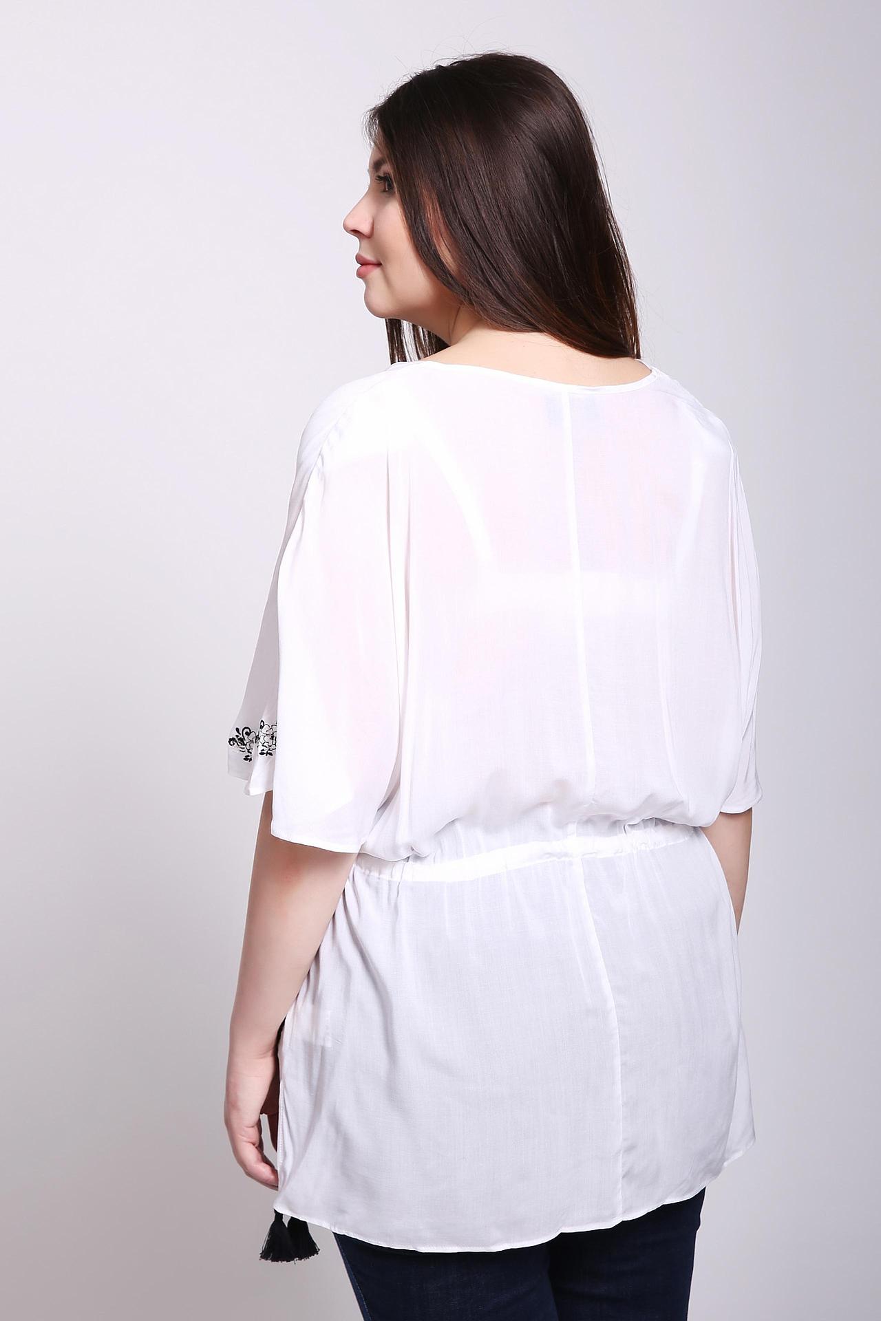 Блуза белого цвета фирмы Eugen Klein. Ткань состоит из 100% вискозы. Модель выполнена фасоном " летучая мышь". Изделие дополнено круглым воротом, на линии талии вставлена тесьма, которую можно зафиксировать. Края рукавов украшены декоративным рисунком, длина ниже бедер. Прекрасно будит гармонировать с облегающими брюками.