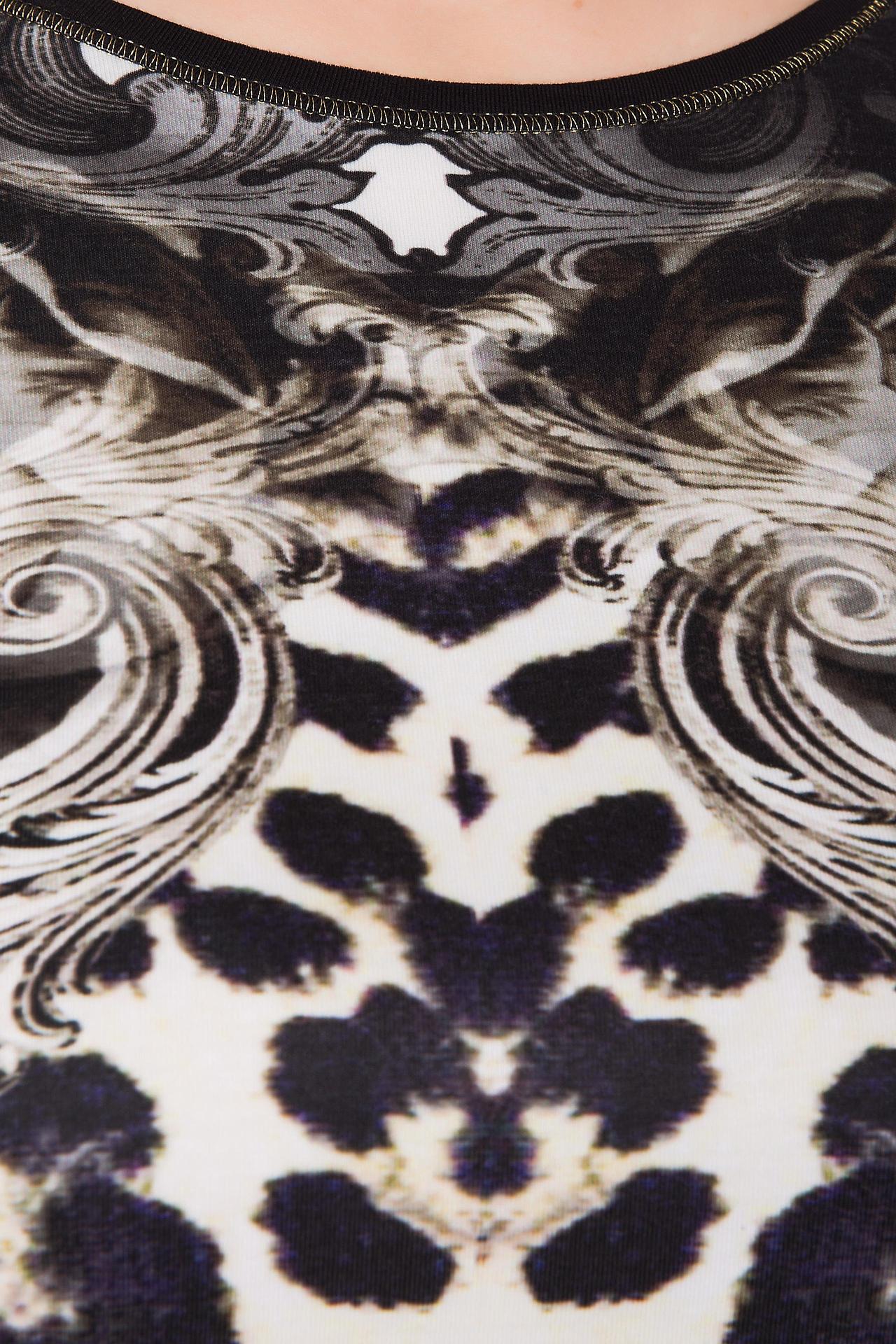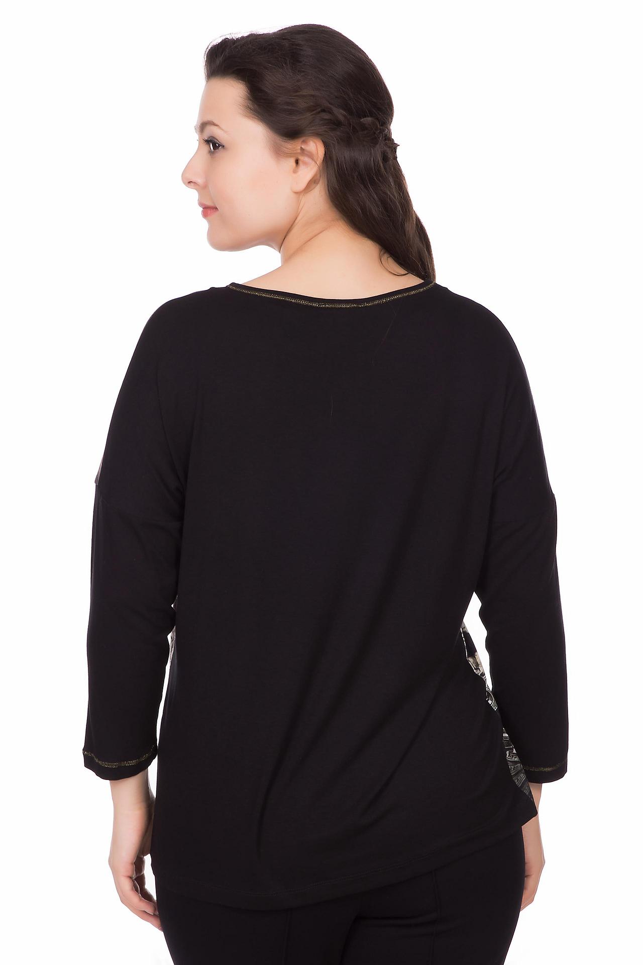 Сочетание чёрного цвета и принта делает блузку универсальной, подходящей как для повседневной носки, так и для особых случаев. Благодаря составу материала, блузка приятна к телу и хорошо садится по фигуре.