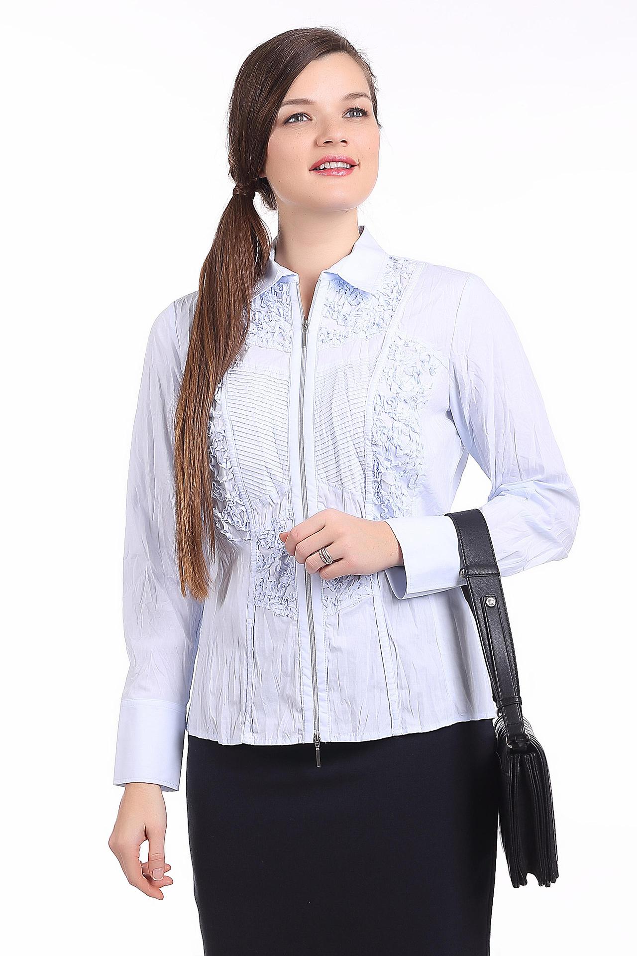 Оригинальность блузке придает центральная застежка-молния, которая является стильной альтернативой традиционным пуговицам. По бокам от молнии расположены декоративные рюши и вертикальные складки, добавляющие образу женственности и утонченности. Отложной воротник и стандартные манжеты подчеркивают строгий и в то же время изысканный стиль.