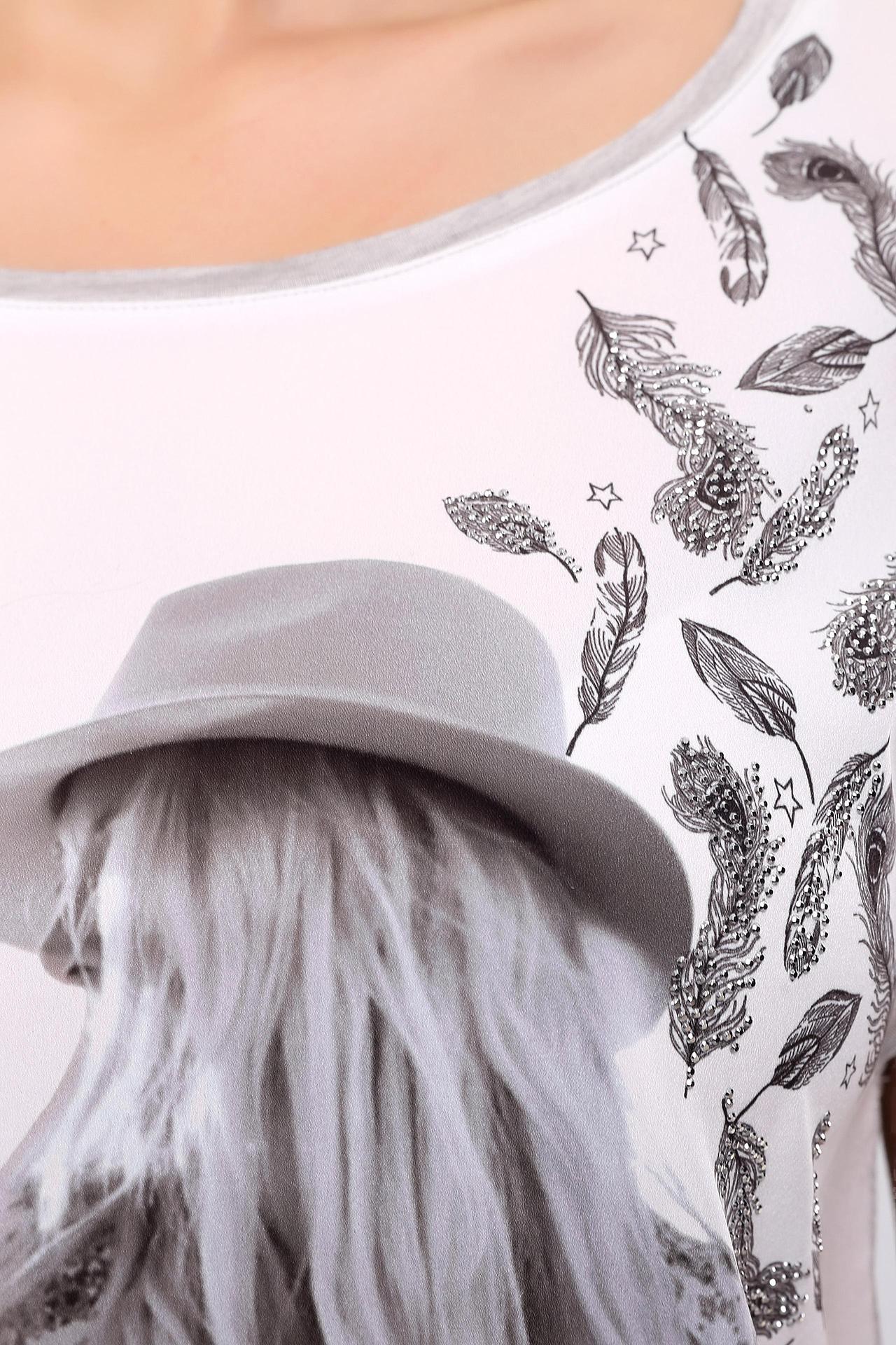 Женская блуза Oui – идеальное дополнение к повседневному гардеробу. Модель выполнена в классическом стиле и украшена оригинальным принтом с изображением девушки в шляпе и летящих перьев, дополненным серебристыми элементами, придающими изделию особую элегантность.