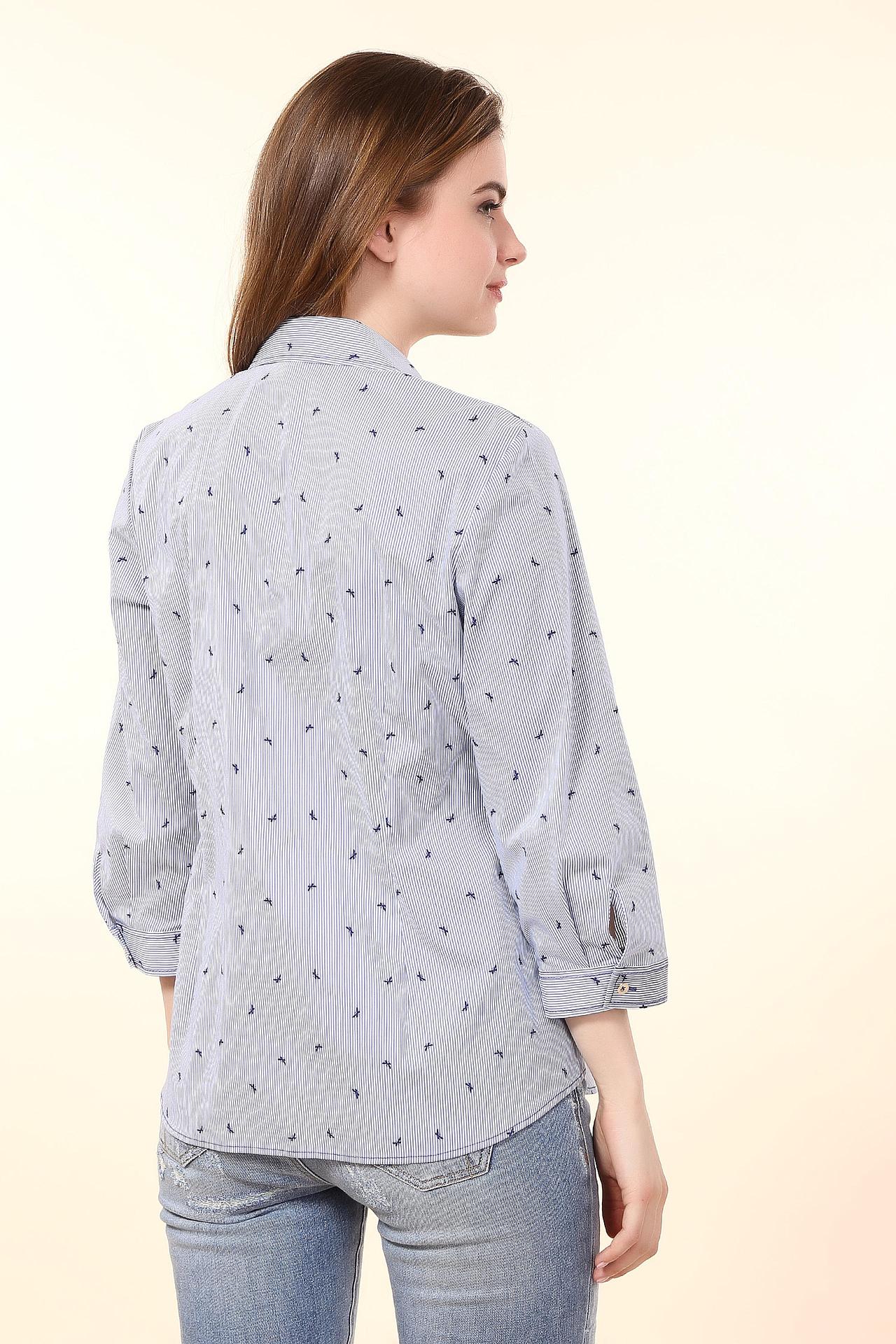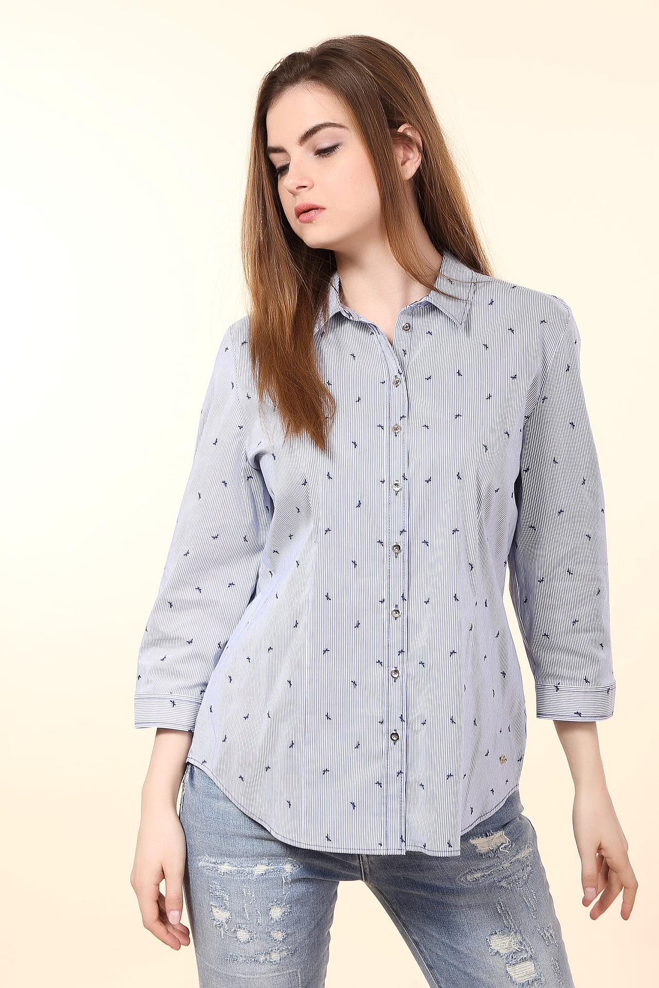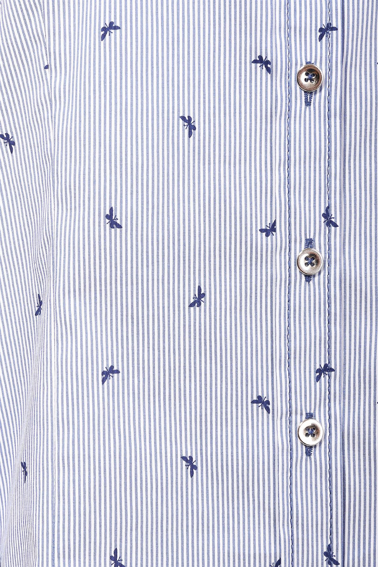 - Дизайн: Классическая рубашечная модель с воротником-стойкой и застежкой на пуговицы. Тонкая голубая полоска и мелкий принт в виде стрекоз создают элегантный и запоминающийся вид.