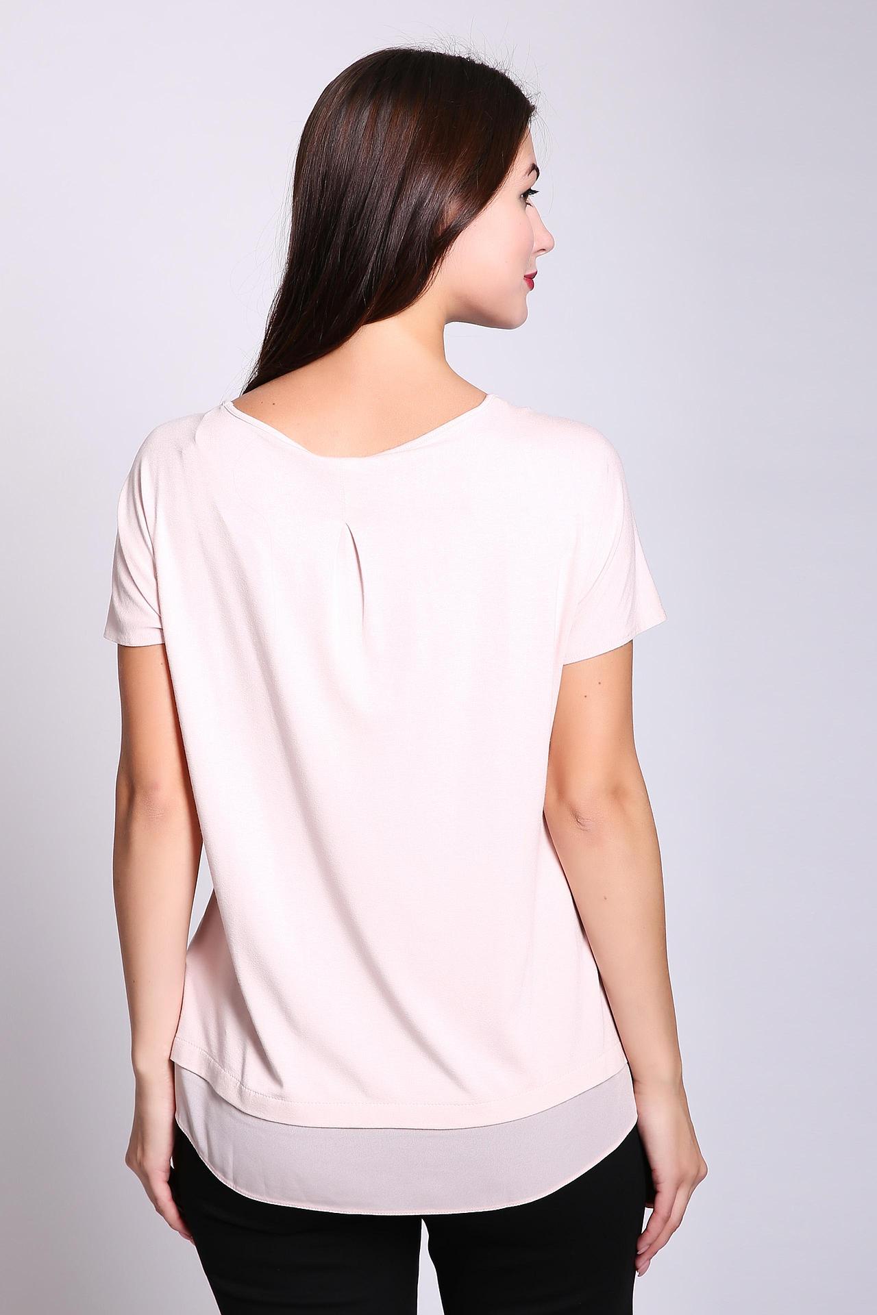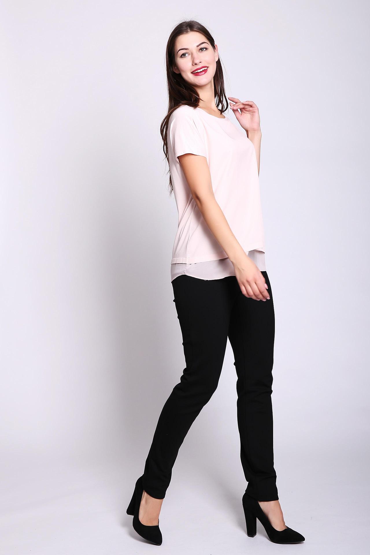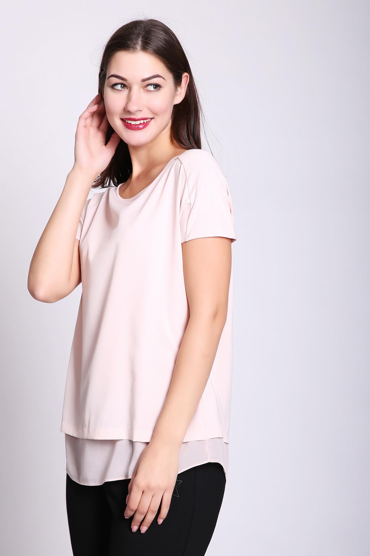 - Универсальный дизайн: Классический крой с круглым вырезом и короткими рукавами дополнен современным двухслойным низом. Это делает блузу идеальной как для офисного стиля, так и для создания элегантного повседневного образа.