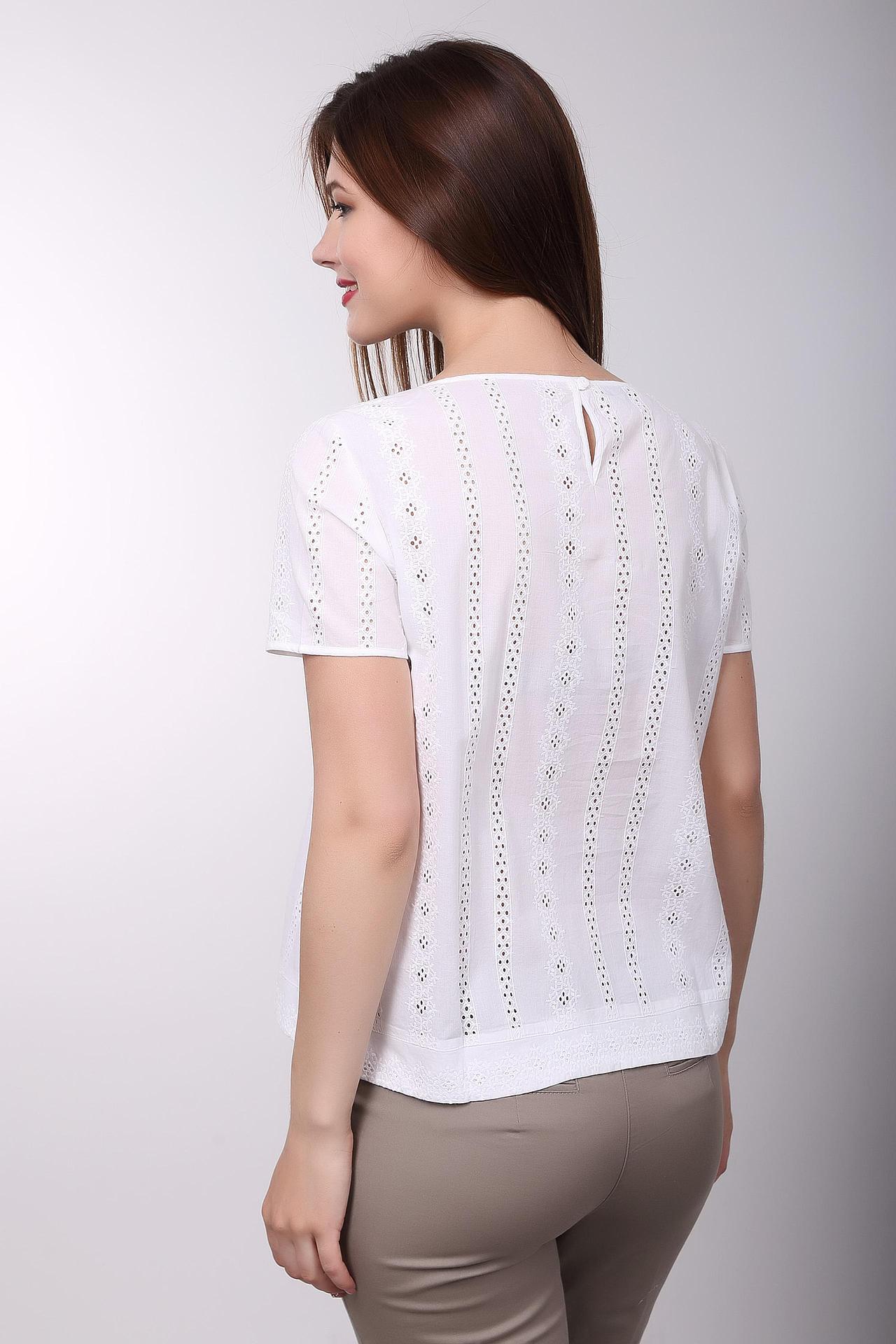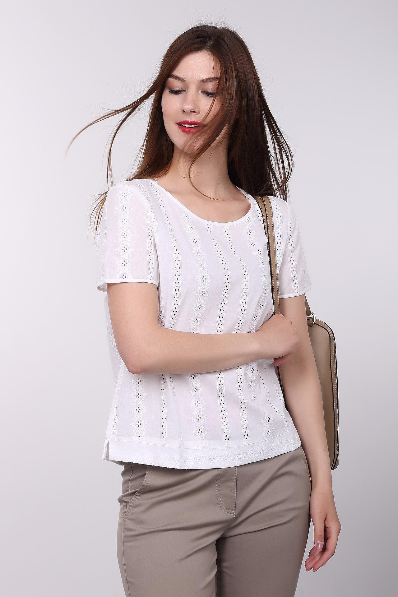 Модель украшена изысканной вышивкой и ажурными вставками, которые придают ей особый шарм и женственность. Укороченный рукав и прямой крой обеспечивают свободу движений и подходят для любого типа фигуры.