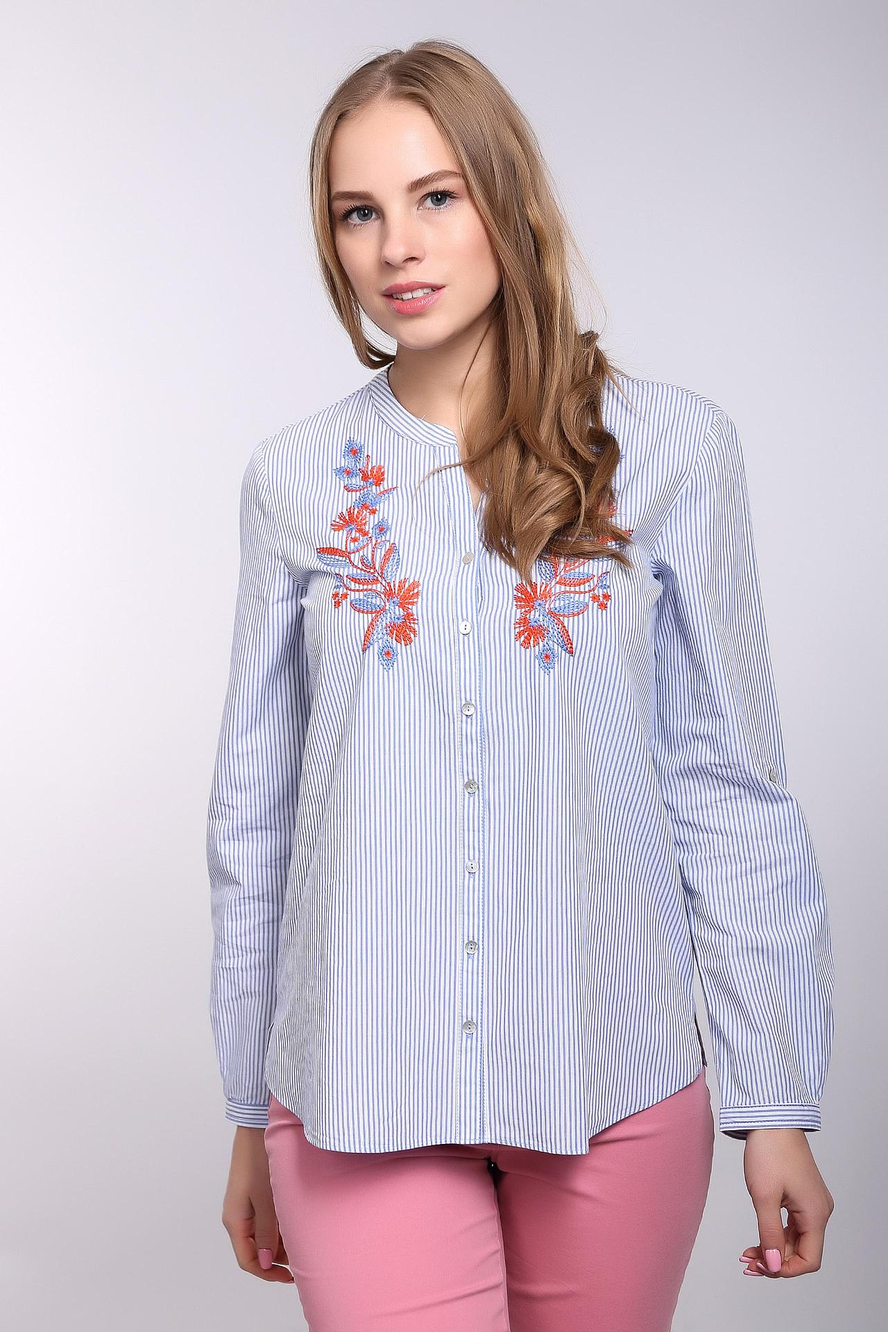 - Дизайн: Классическая вертикальная полоска в сине-белых тонах дополнена стильной вышивкой в красно-синих оттенках. Отложной воротник-стойка и планка с пуговицами создают законченный образ.