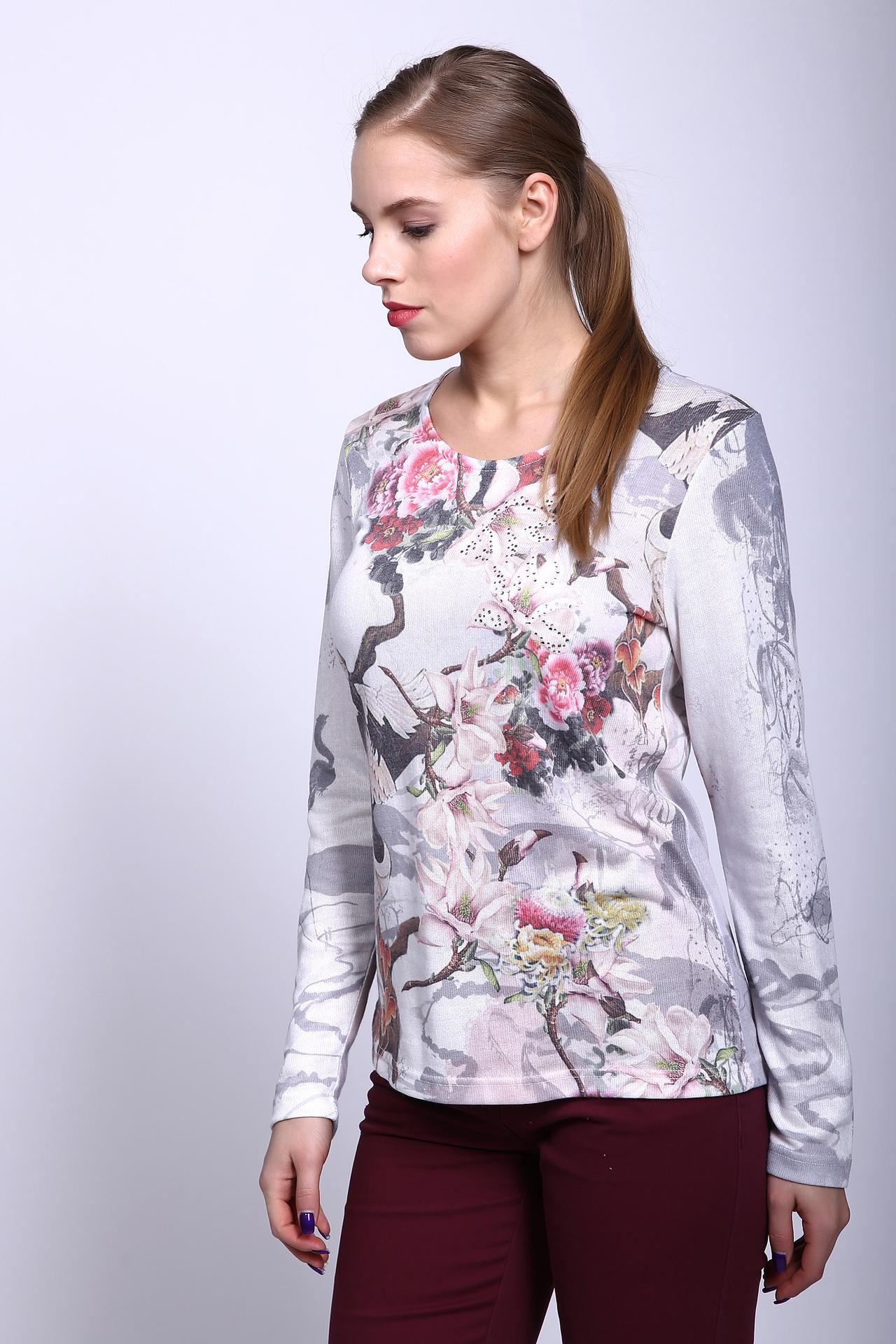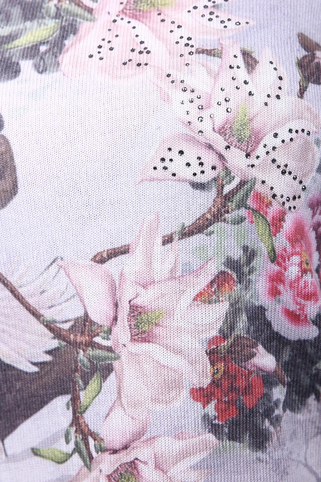 Центральным элементом дизайна является нежный цветочный принт с изображением магнолий и других растительных мотивов на светлом фоне, придающий изделию особую утонченность. Гармоничное сочетание приглушенных оттенков розового, бордового и серого создает элегантный образ. Дополнительный шарм блузе добавляют деликатные черные стразы, украшающие лепестки цветов, что подчеркивает внимание к деталям.