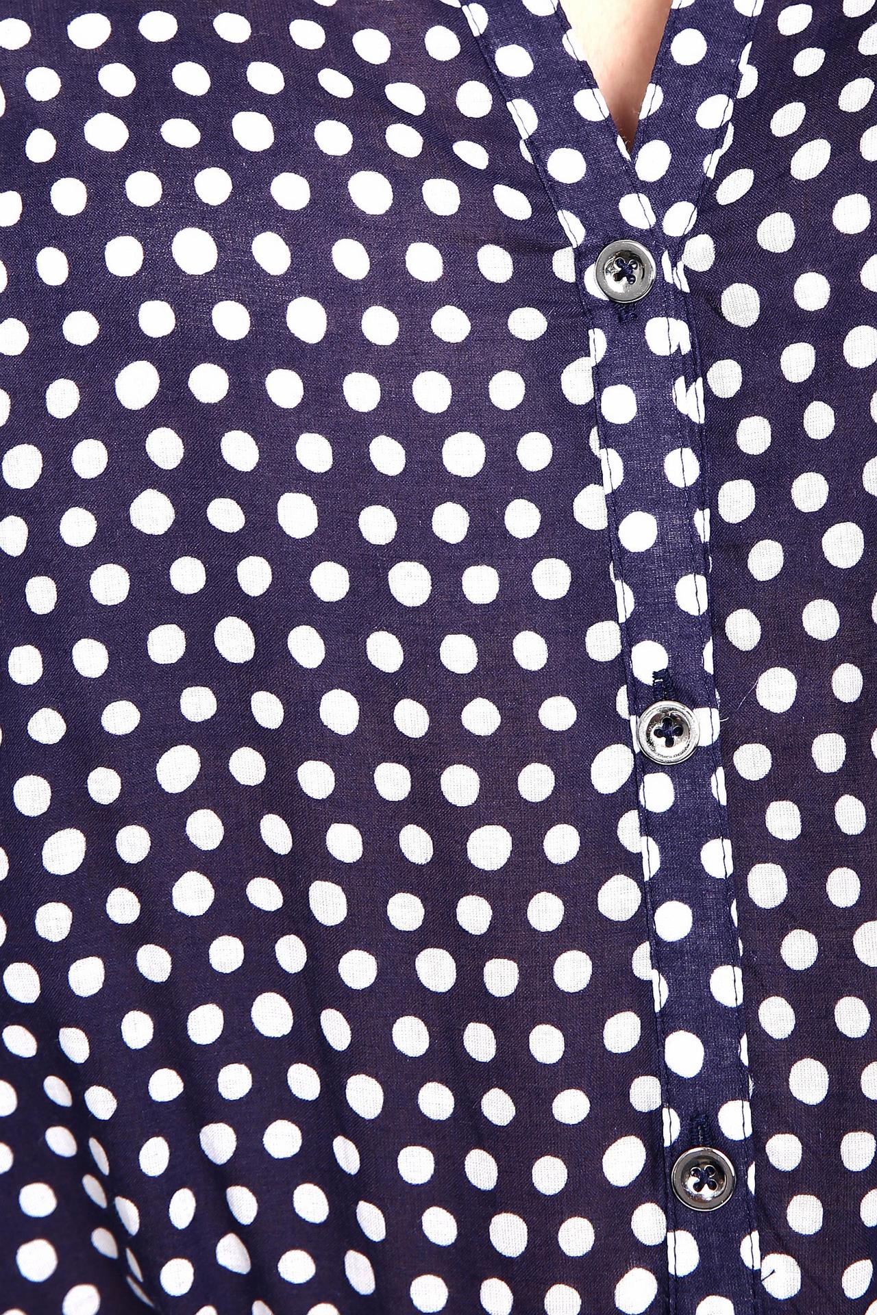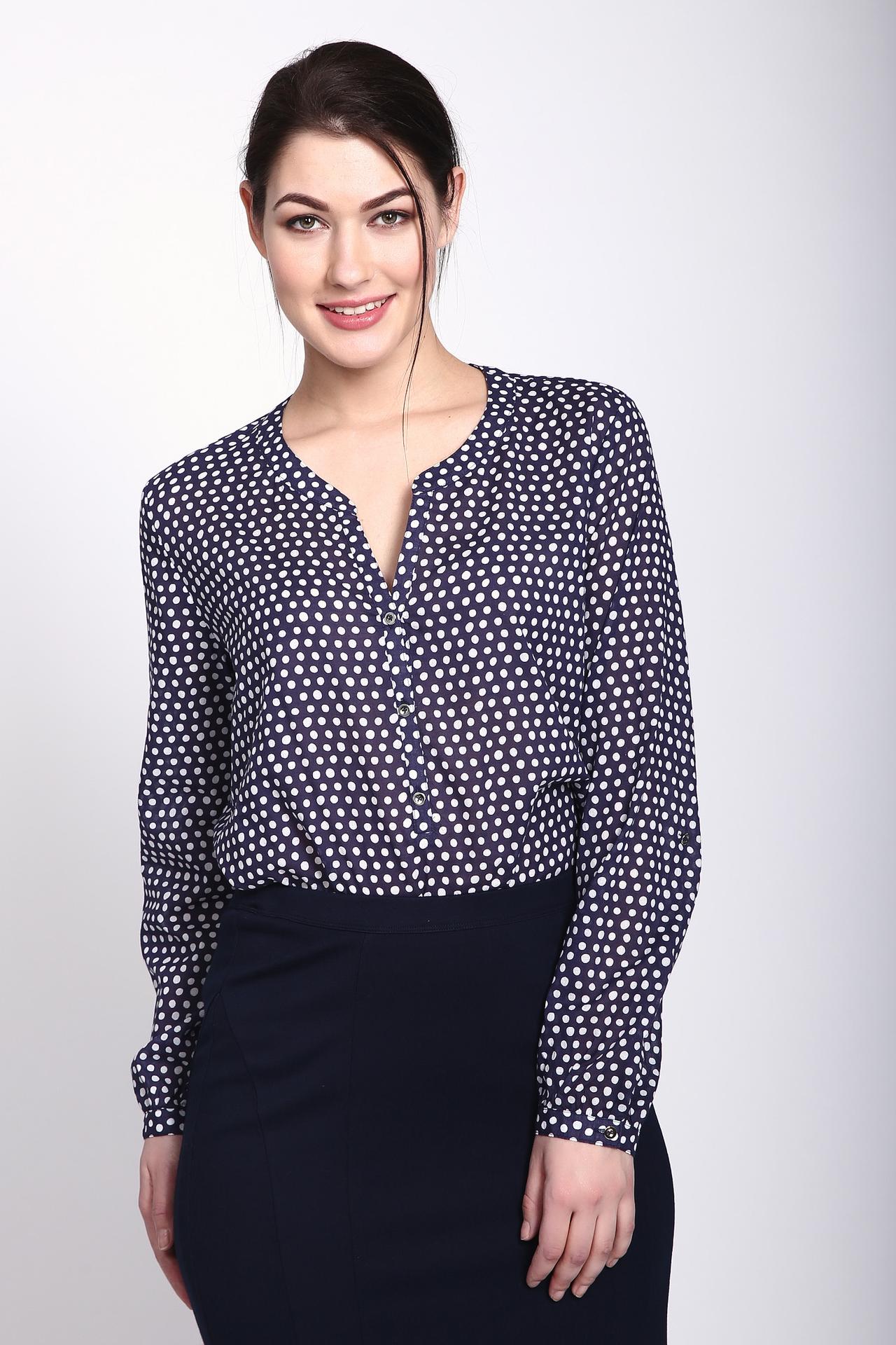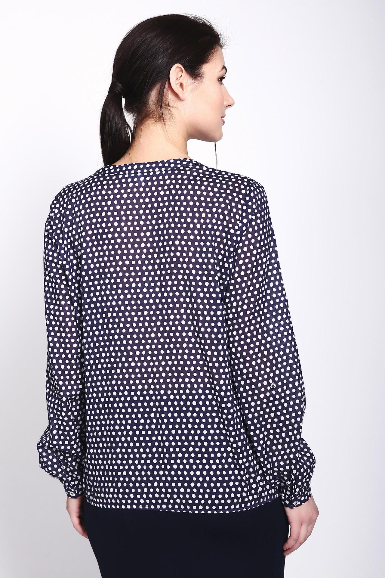 Блузка выполнена в синем цвете с модным принтом в горошек, добавляющим образу игривости и шарма. Она прекрасно сочетается как с деловыми брюками, так и с повседневными джинсами, позволяя создавать разнообразные образы.