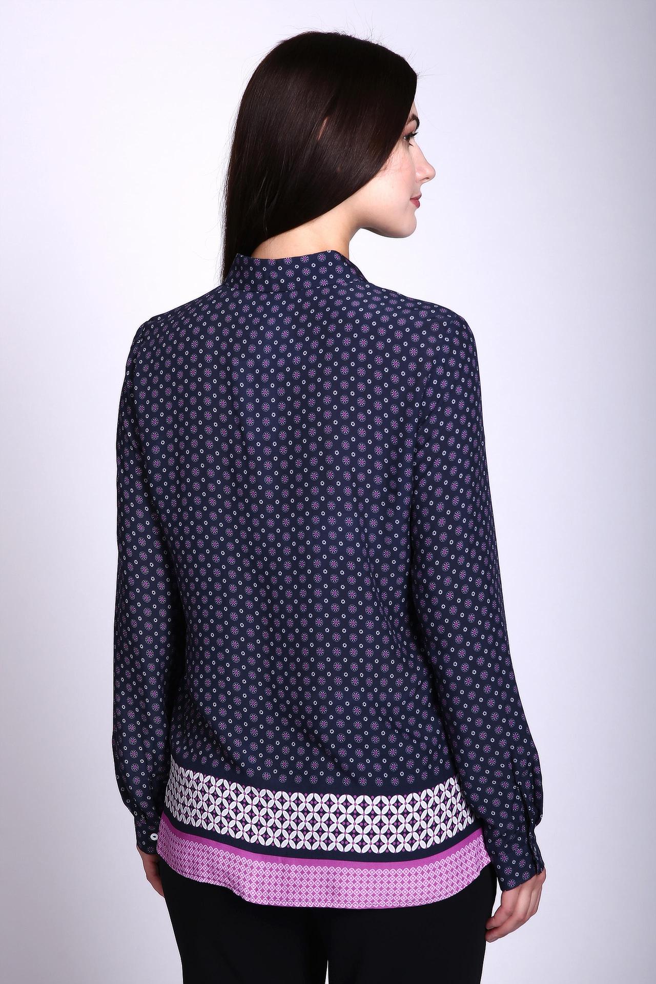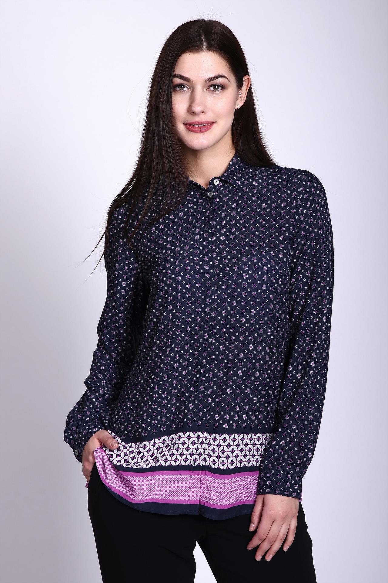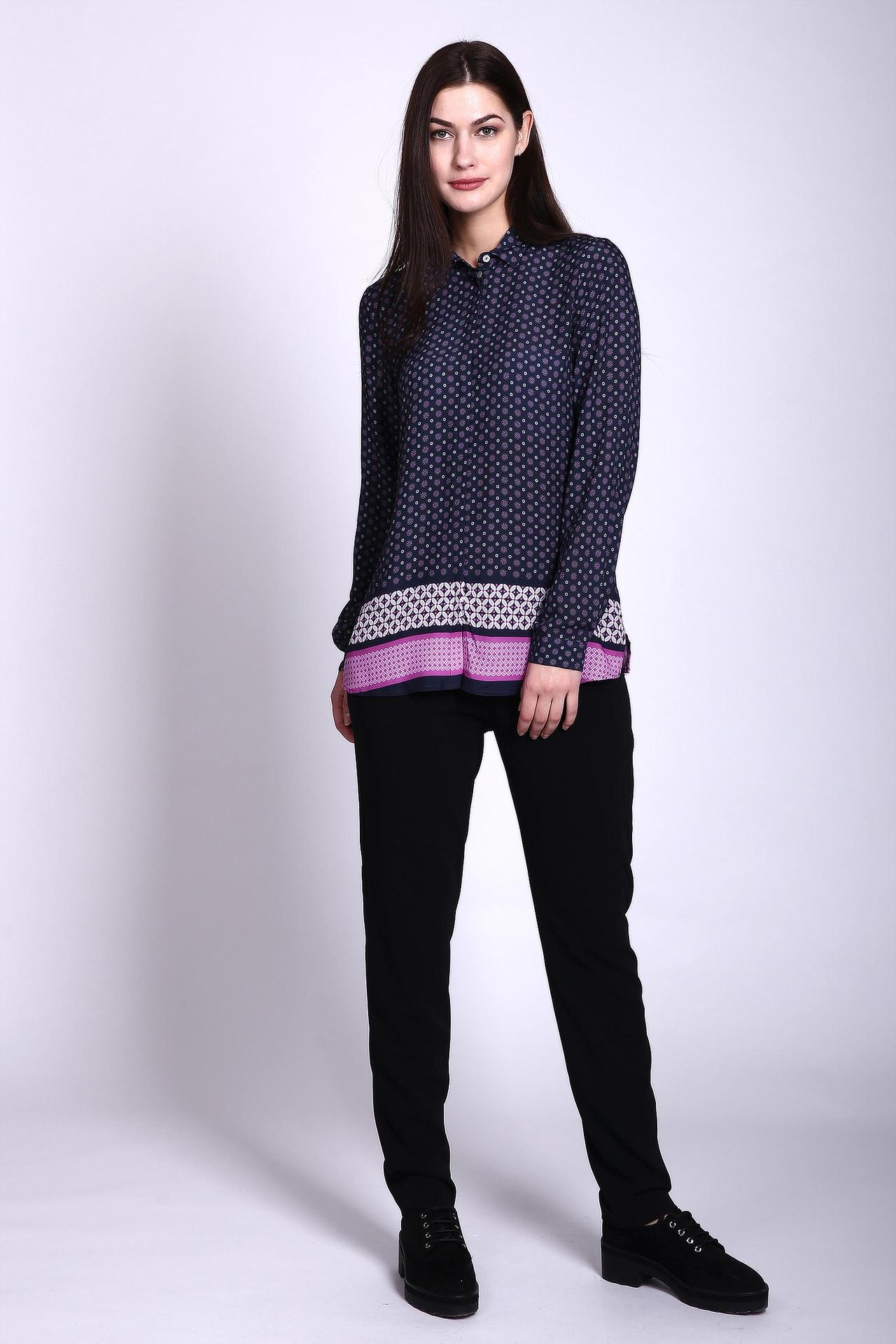 Блуза синего цвета фирмы Gerry Weber. Ткань состоит из 100% вискозы. Модель выполнена прямым покроем. Блуза дополнена откладным воротом, застежка на пуговицы, длинными, втачными рукавами с манжетами на пуговицы. Ткань имеет принт. Гармонировать может с узкими брюками.
