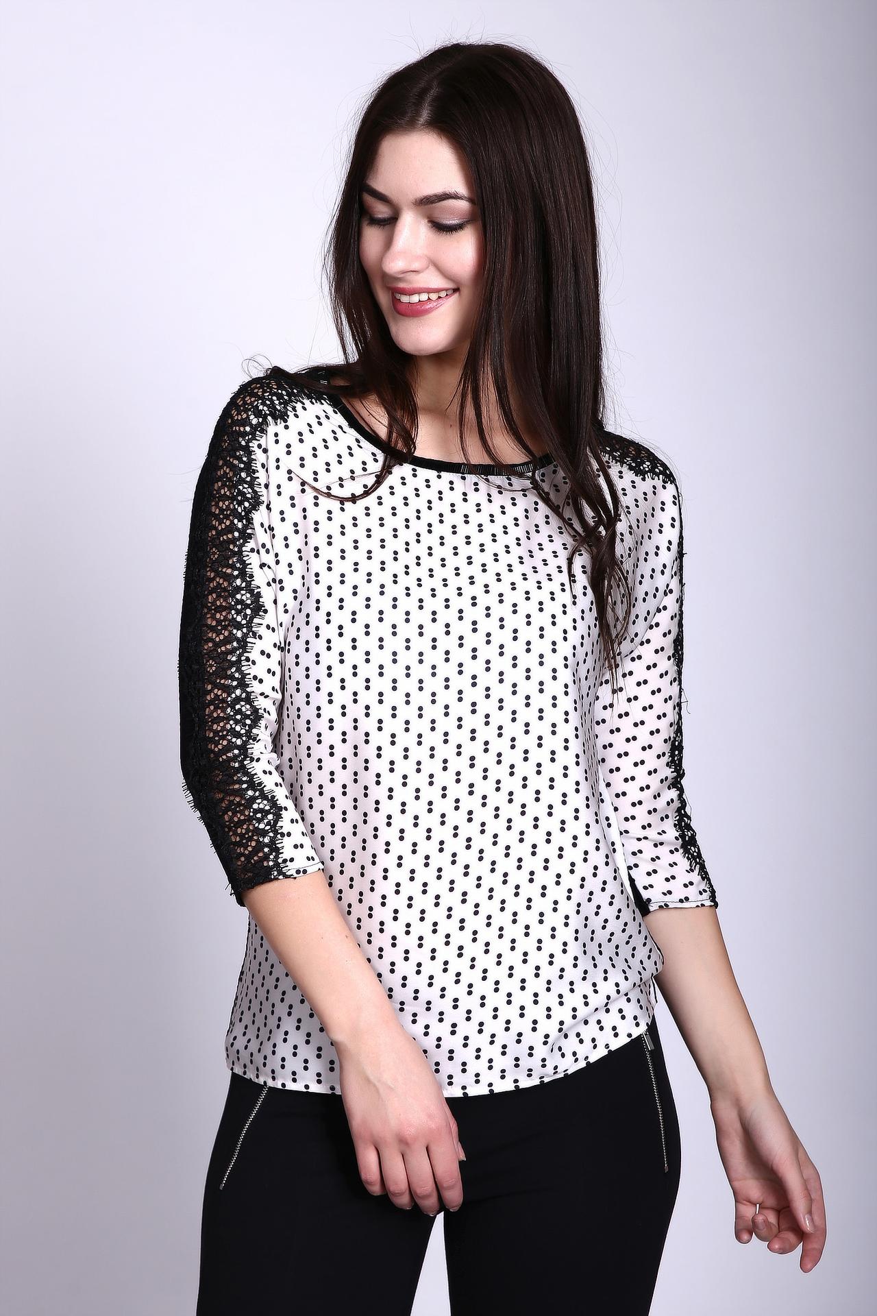 Модель отличается оригинальным дизайном: белый фон с мелким черным горошком и вставки из черного кружева на рукавах добавляют образу изюминку. Блуза прекрасно подходит для создания как повседневных, так и нарядных образов.