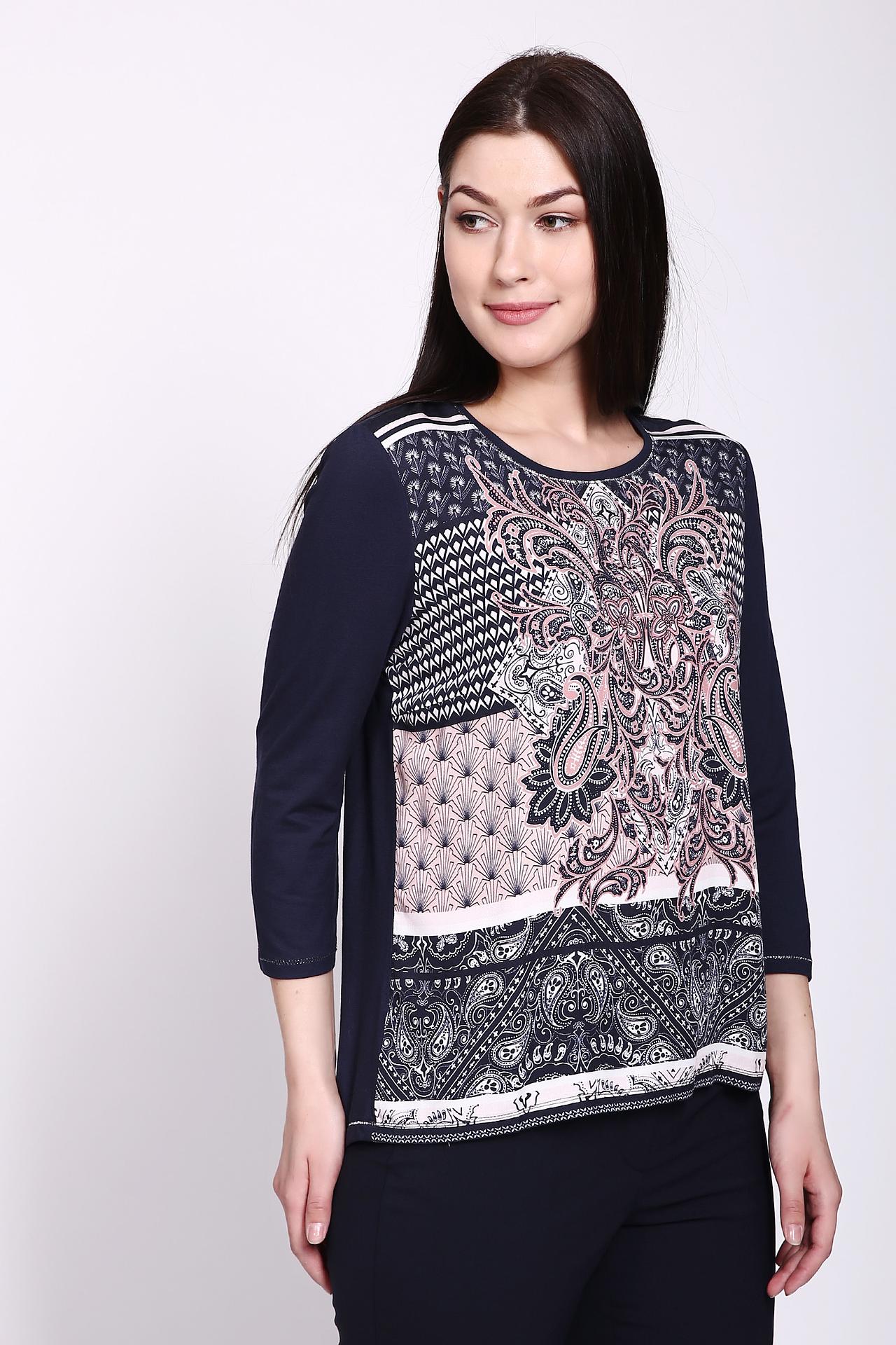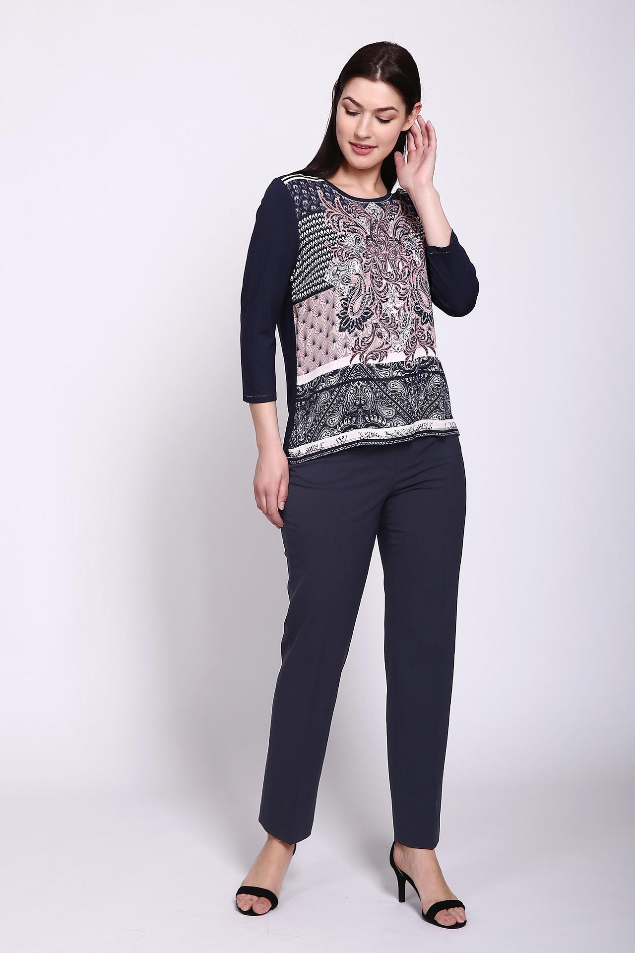 Классическая женская блуза Betty Barclay выполнена в глубоком синем цвете и украшена выразительным узорным принтом на передней части. Принт сочетает в себе оттенки розового, белого и черного, создавая элегантный и запоминающийся образ. Модель имеет комфортный круглый вырез и рукава длиной 3/4, что делает ее идеальной для демисезонного гардероба.