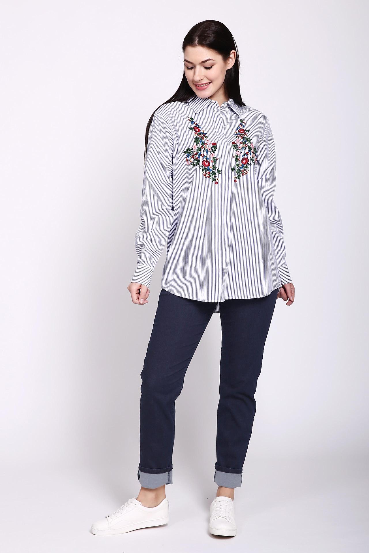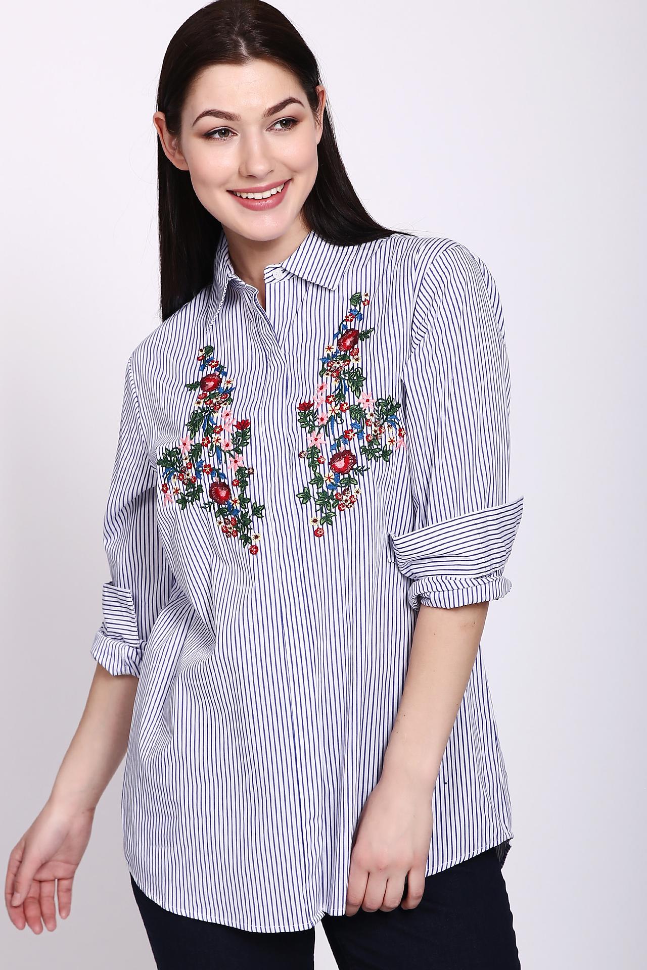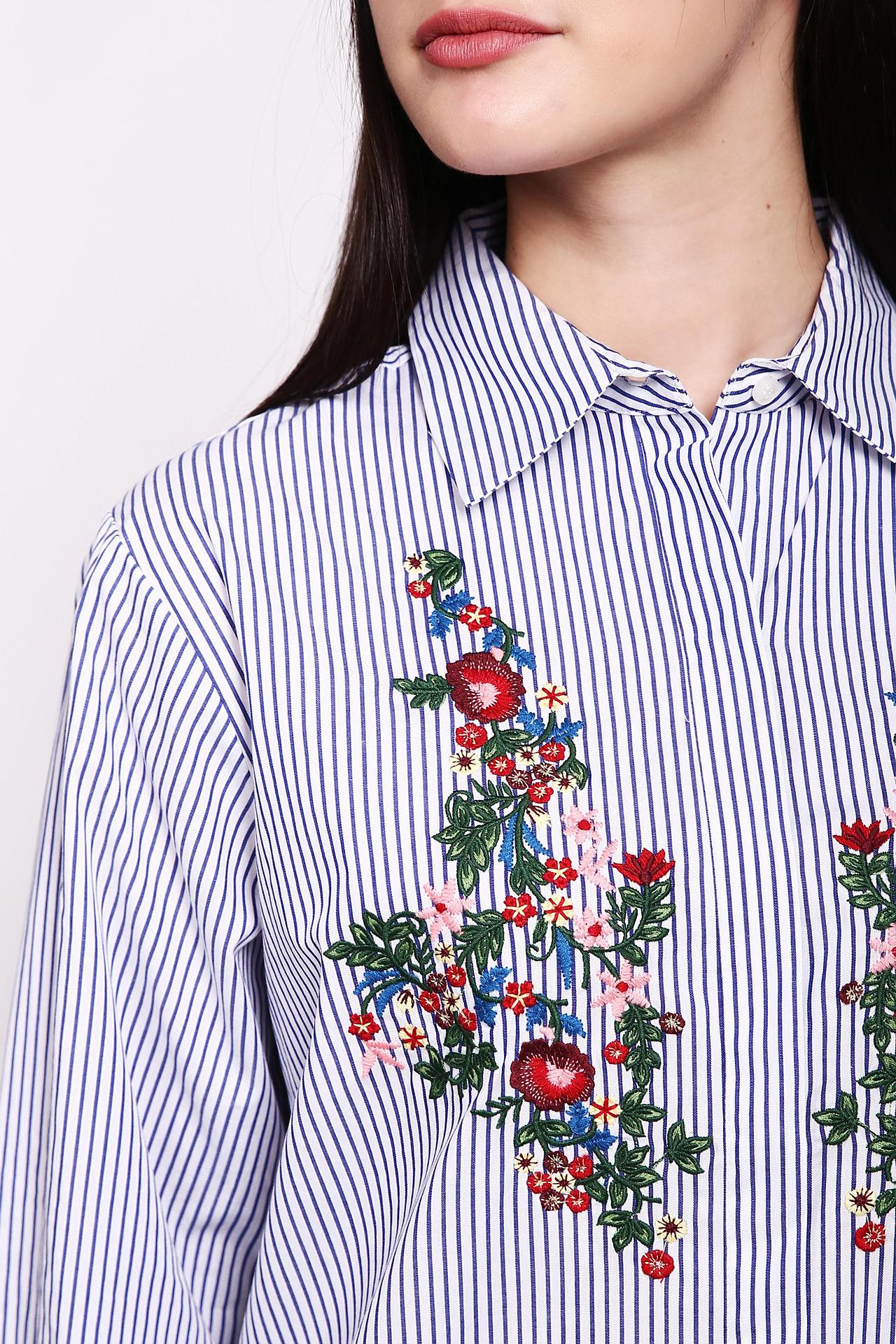 Ткань приятна к телу, не мнется и отлично пропускает воздух, обеспечивая комфорт в течение всего дня. Блуза украшена изящной вышивкой в виде цветов, которая добавляет изделию оригинальности и шарма. Полоски синего цвета на белом фоне создают свежий и элегантный look.