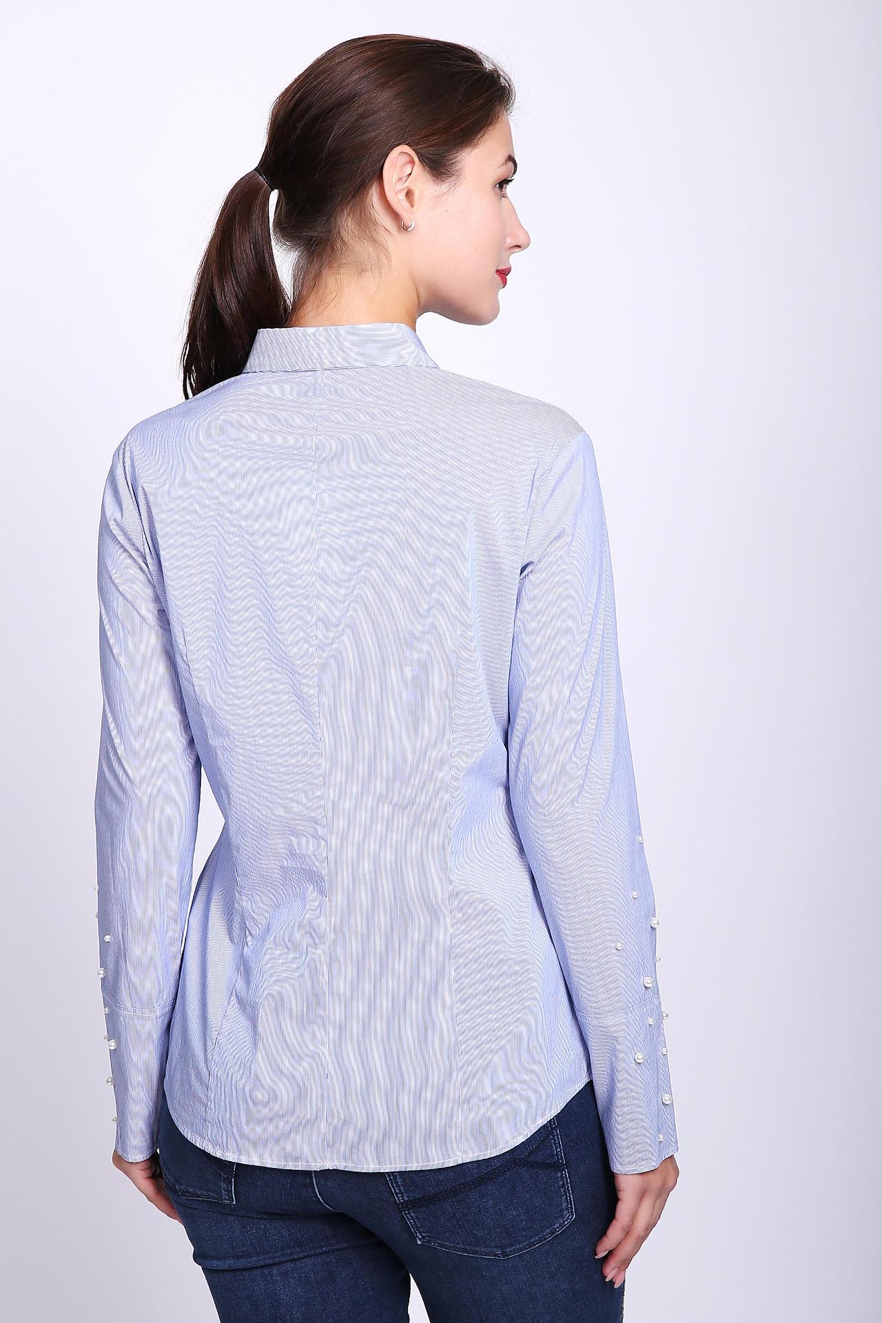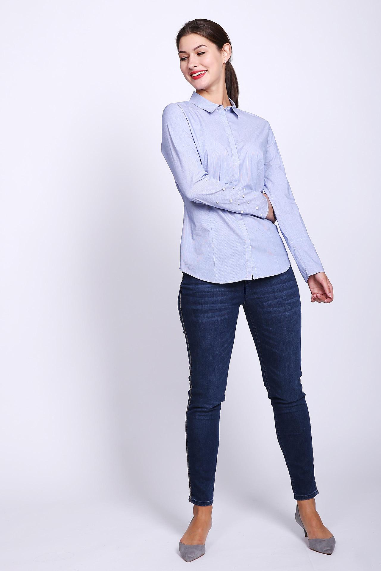 - Дизайн и отделка: Классический воротник и застежка на пуговицы подчеркивают элегантность модели. Оригинальный акцент в виде мелких жемчужин, расположенных по краю манжет, придает блузе особое очарование. Тонкая вертикальная полоска визуально стройнит фигуру.