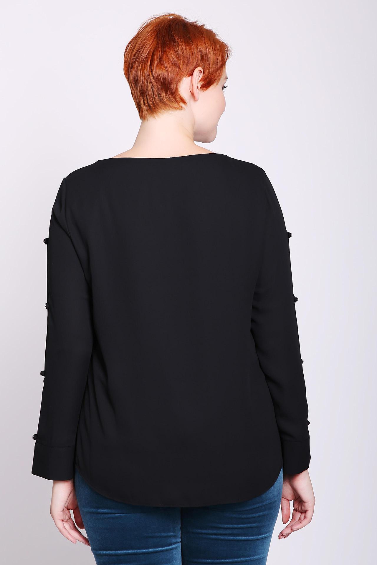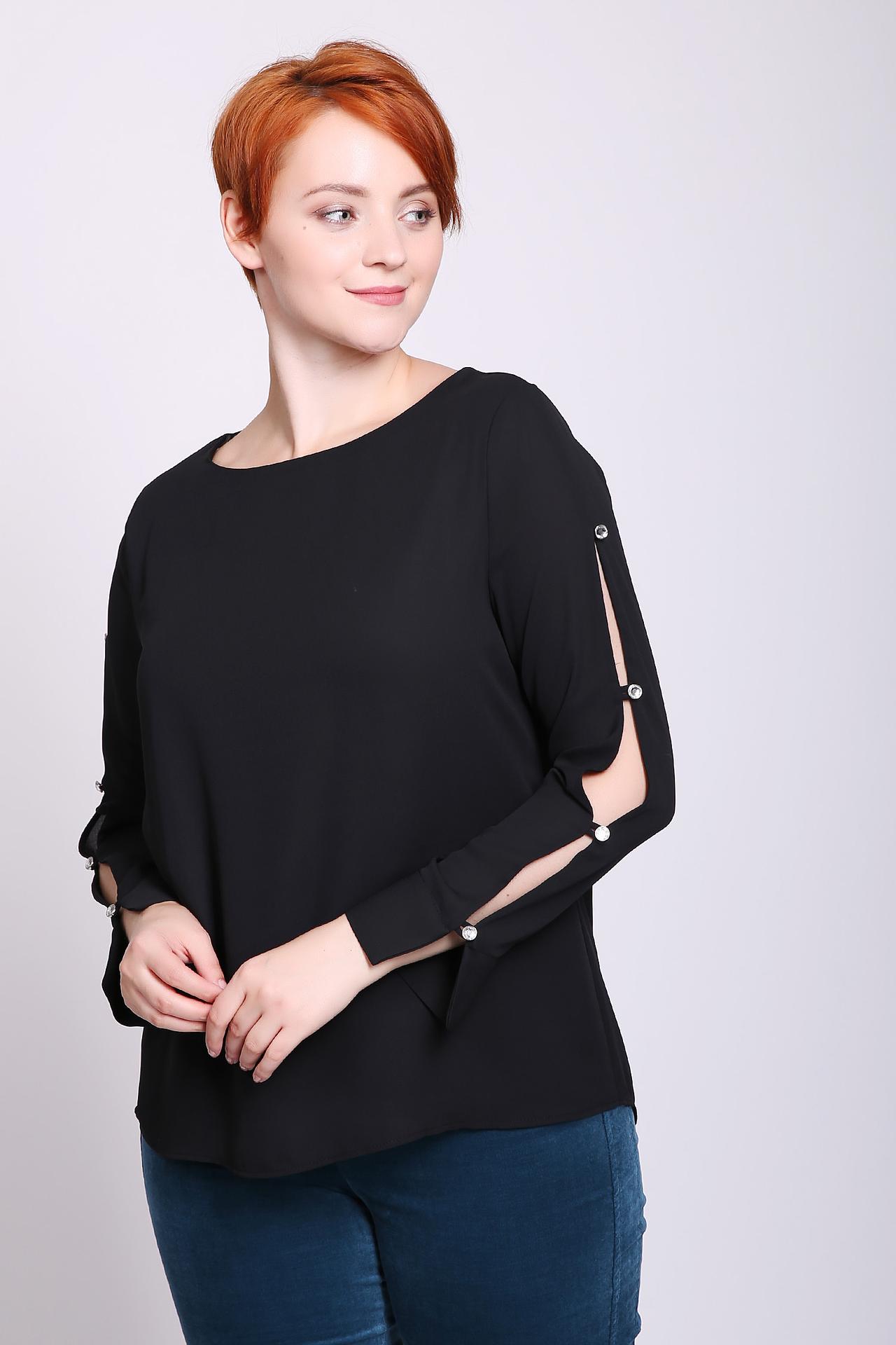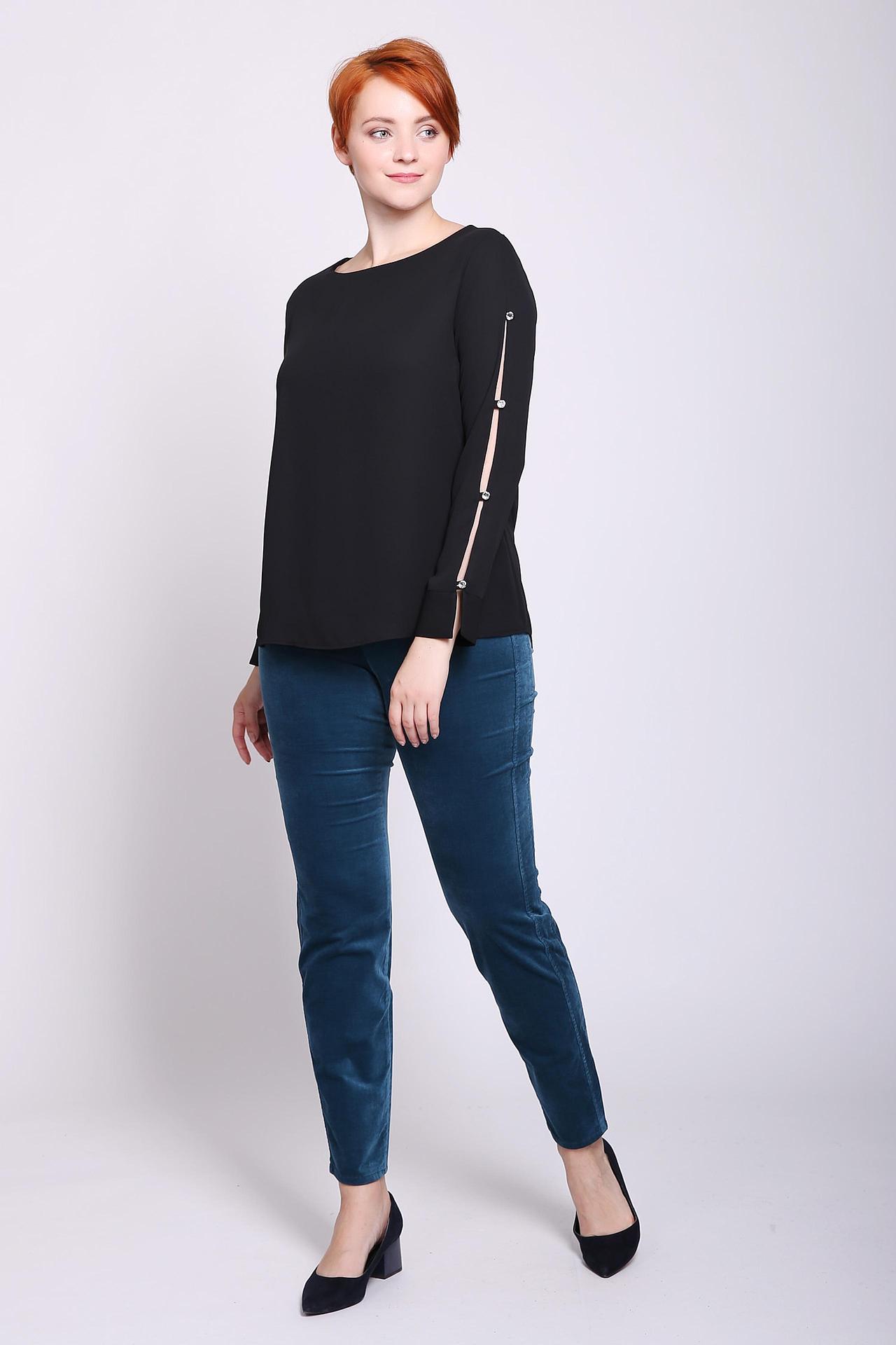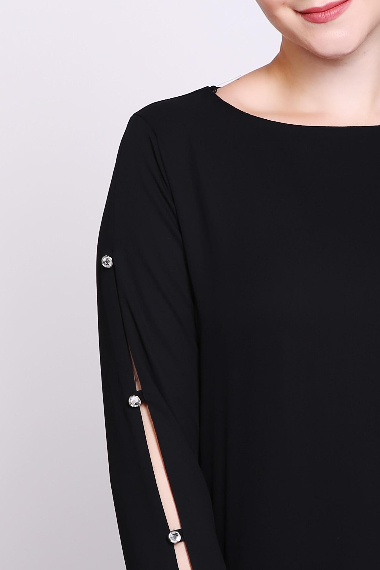 Блуза женская черного цвета фирмы Frank Walder. Модель выполнена прямым фасоном. Изделие дополнено округлым воротом, втачными, длинными рукавами с разрезом. По рукаву расположены стразы. Ткань состоит из 100% полиэстера. Комбинировать можно с различными брюками.