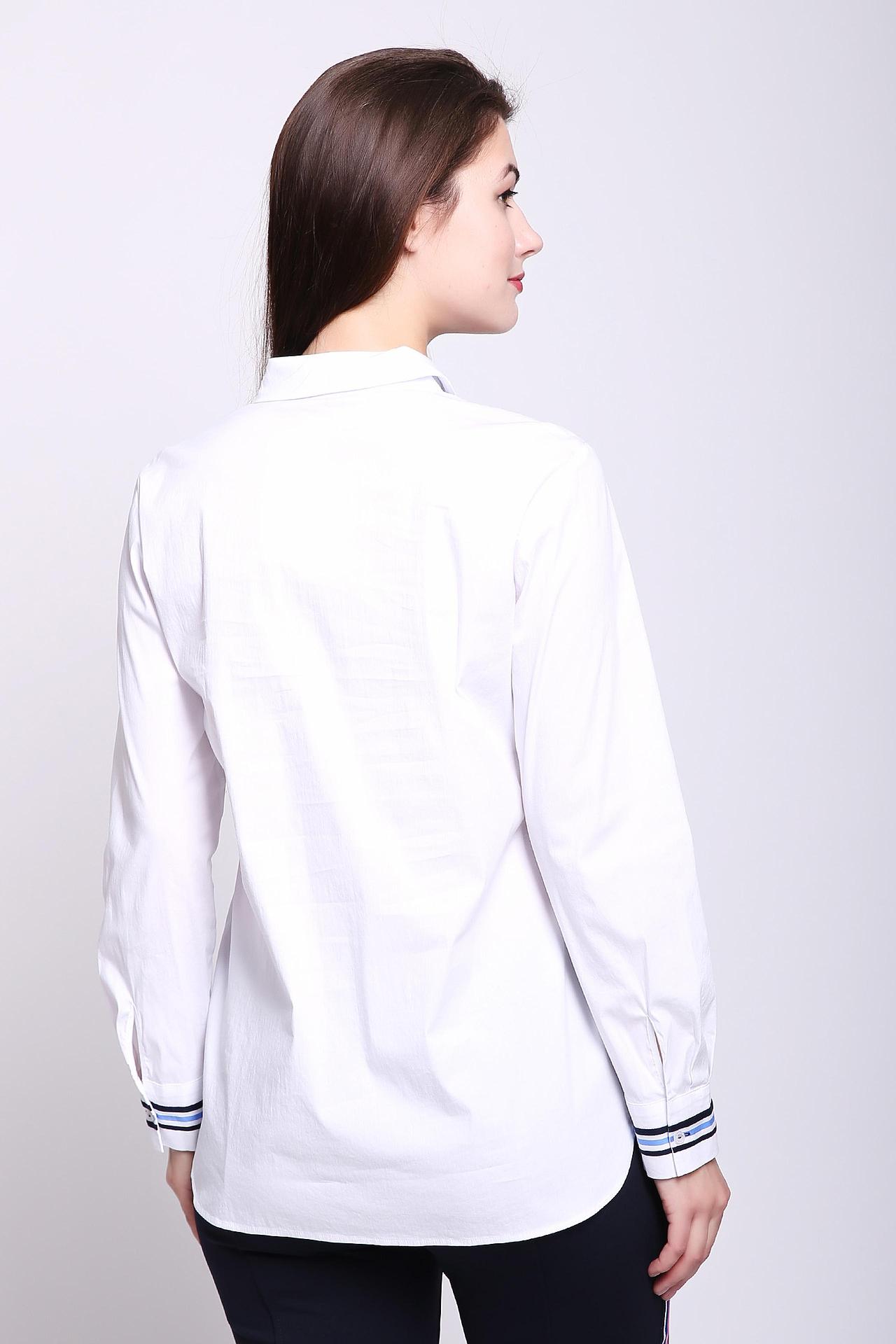 - Дизайн: Классический крой с длинными рукавами и отложным воротником. Декоративные элементы в виде сине-белых полос на манжетах и вдоль планки застежки подчеркивают изысканность модели.