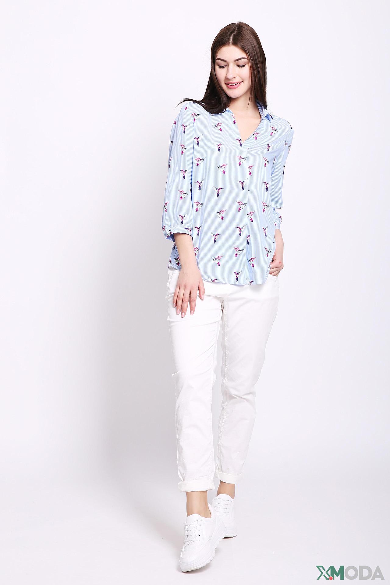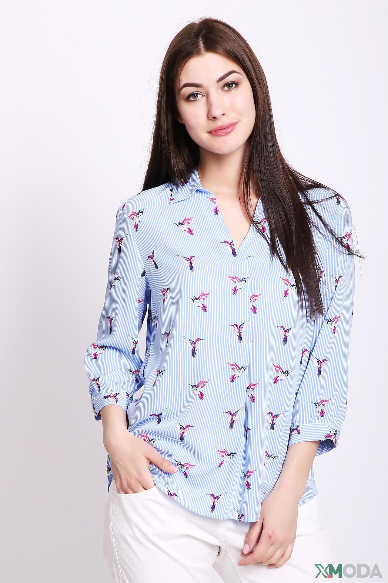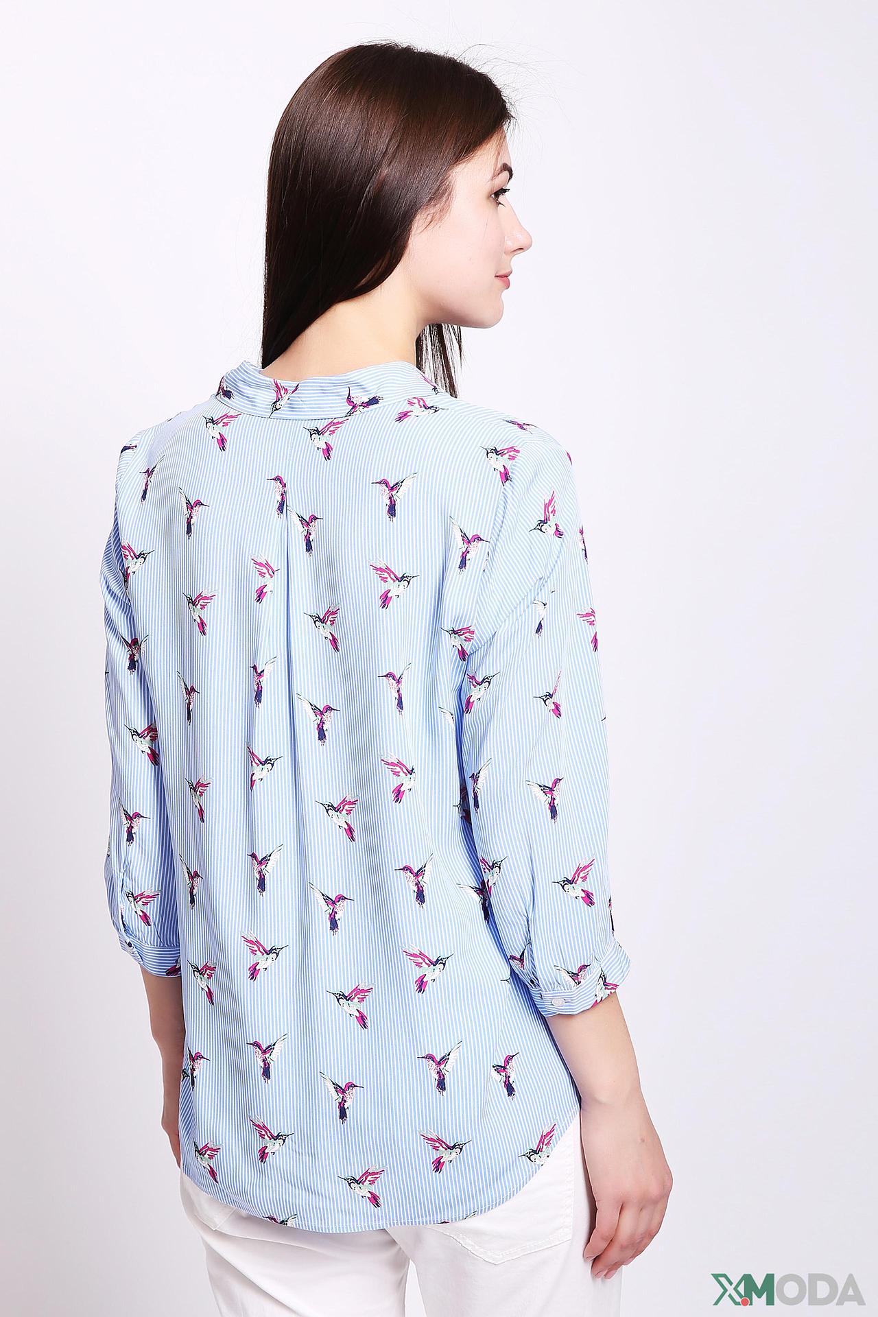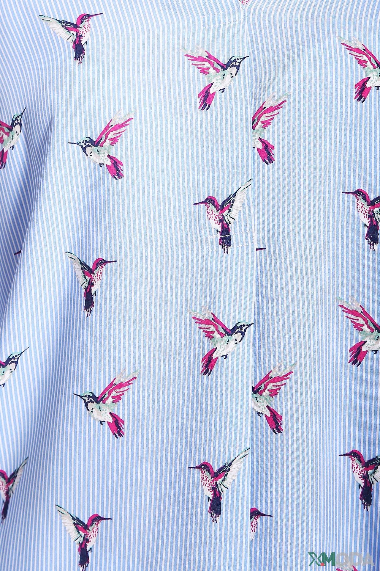 - Дизайн: Классический приталенный крой с V-образным вырезом и рукавом три четверти. Оригинальный принт с яркими колибри на голубом полосатом фоне придает изделию уникальность.
