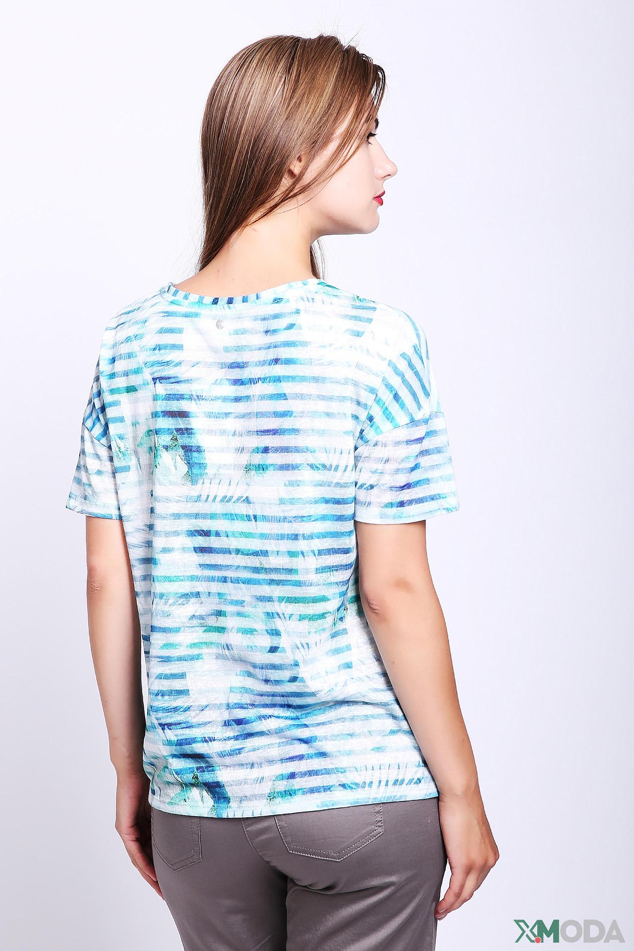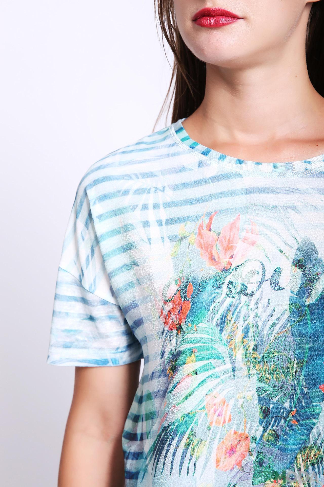 Блуза женская зеленого цвета от бренда Taifun. Модель выполнена прямым фасоном. Изделие дополнено округлым воротом, втачными, короткими рукавами. Окружность ворота обшита бейкой. Низ блузы фиксируется на тесьму. Ткань имеет принт. Состав ткани: 100% полиэстер. Сочетать можно с различными деталями вашего гардероба.