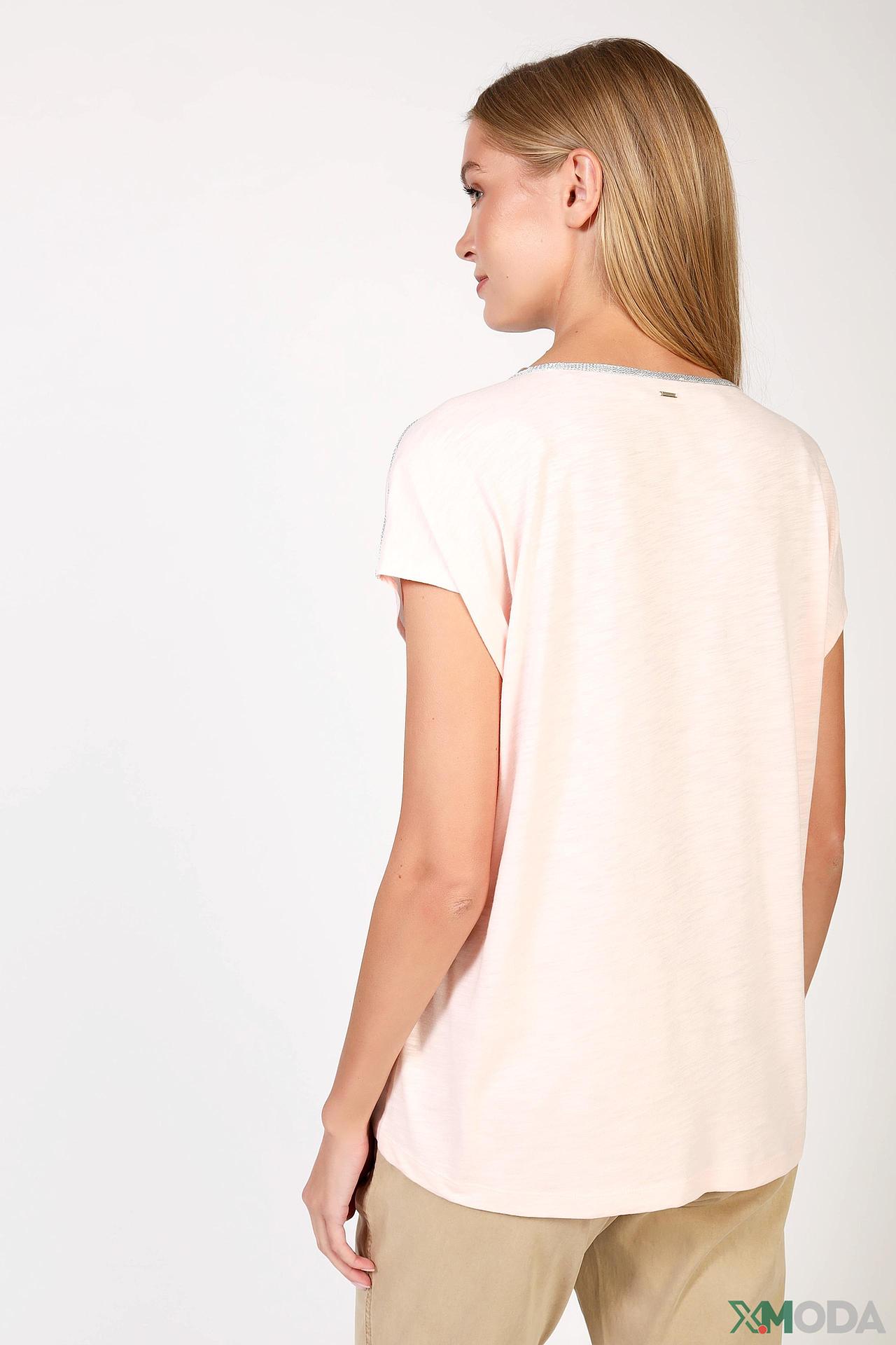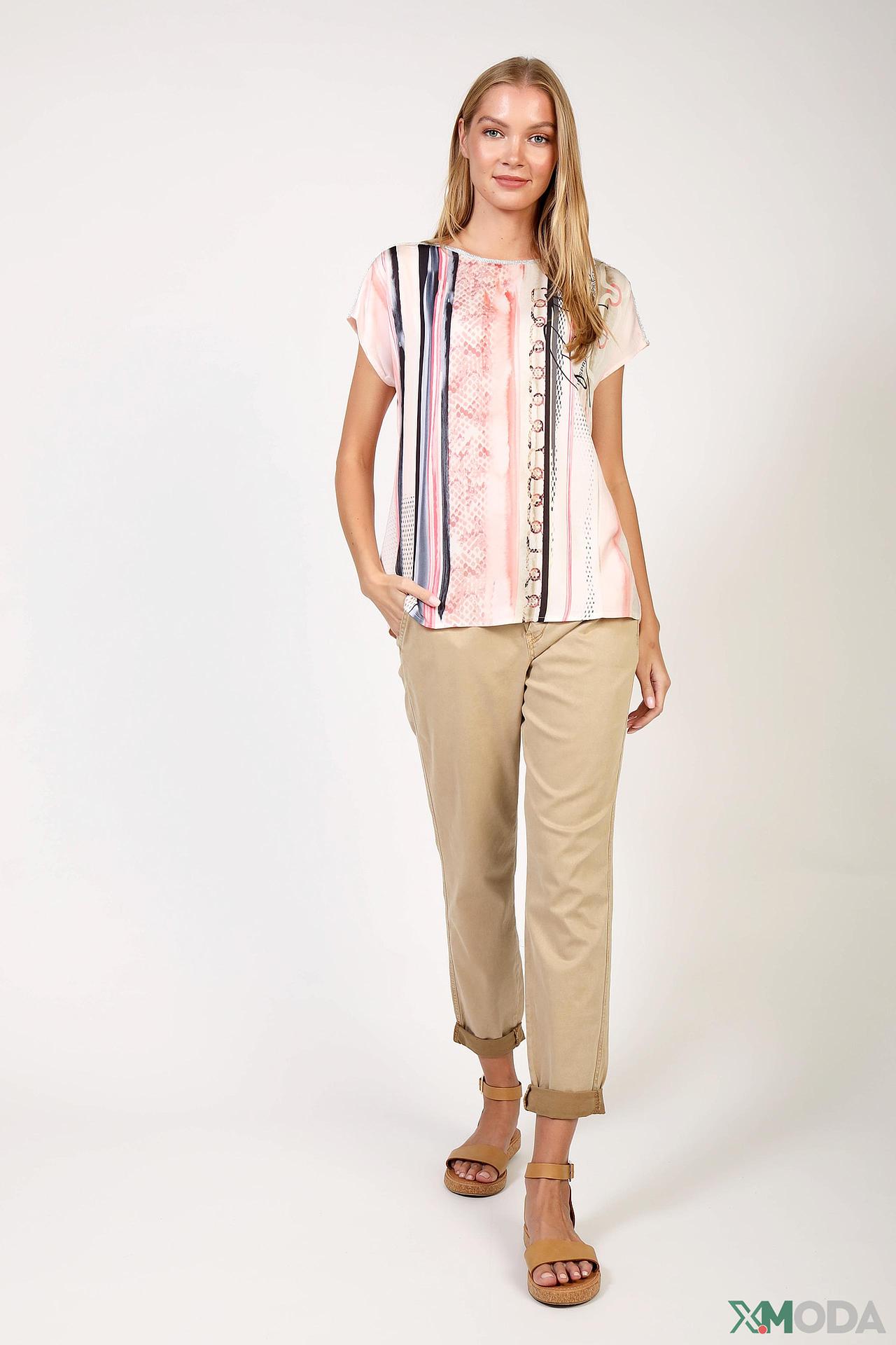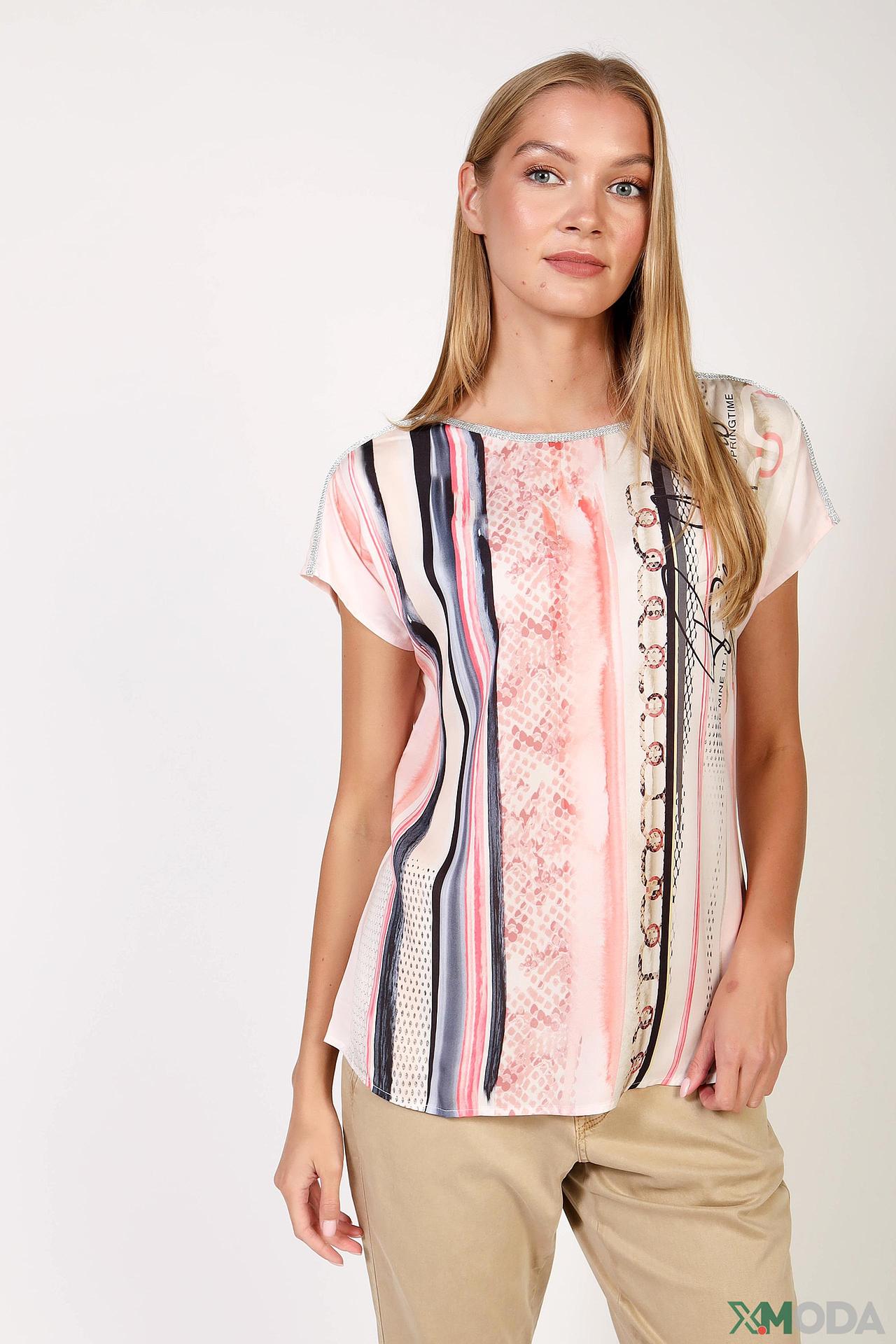 Блуза женская розового цвета фирмы Taifun. Модель выполнена прямым фасоном. Изделие дополнено округлым воротом, короткими рукавами реглан. Окружность ворота обшита бейкой. Ткань передней части блузы имеет разноцветный принт. Состав: 50% хлопок, 50% модал. Гармонировать можно с различными брюками.
