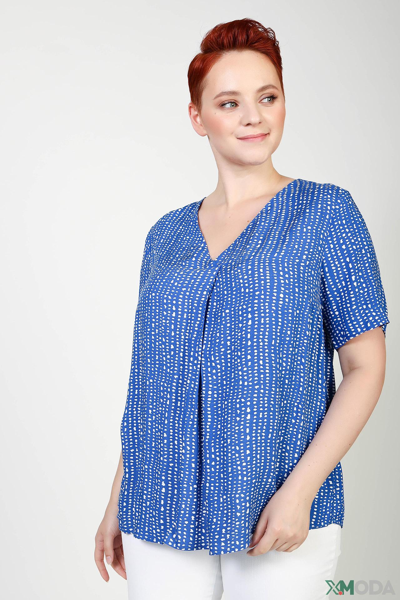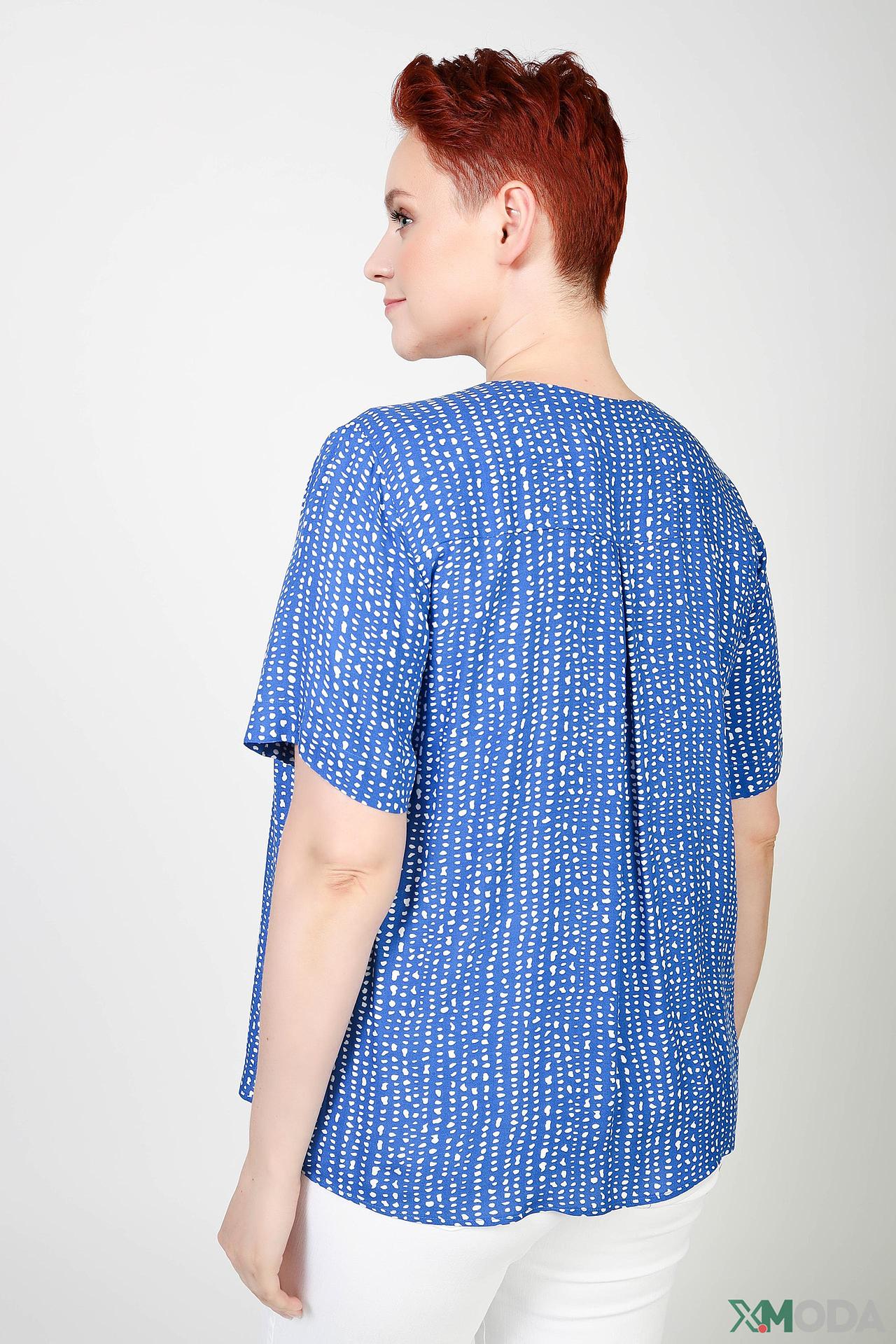 Блуза женская синего цвета бренда Frapp. Модель выполнена прямым фасоном. Изделие дополнено V - образным вырезом и встречной складкой, втачными, короткими рукавами, задней кокеткой и встречной складкой. Ткань блузы имеет принт. Вырез обшит бейкой. Гармонировать можно с различными брюками и юбками.