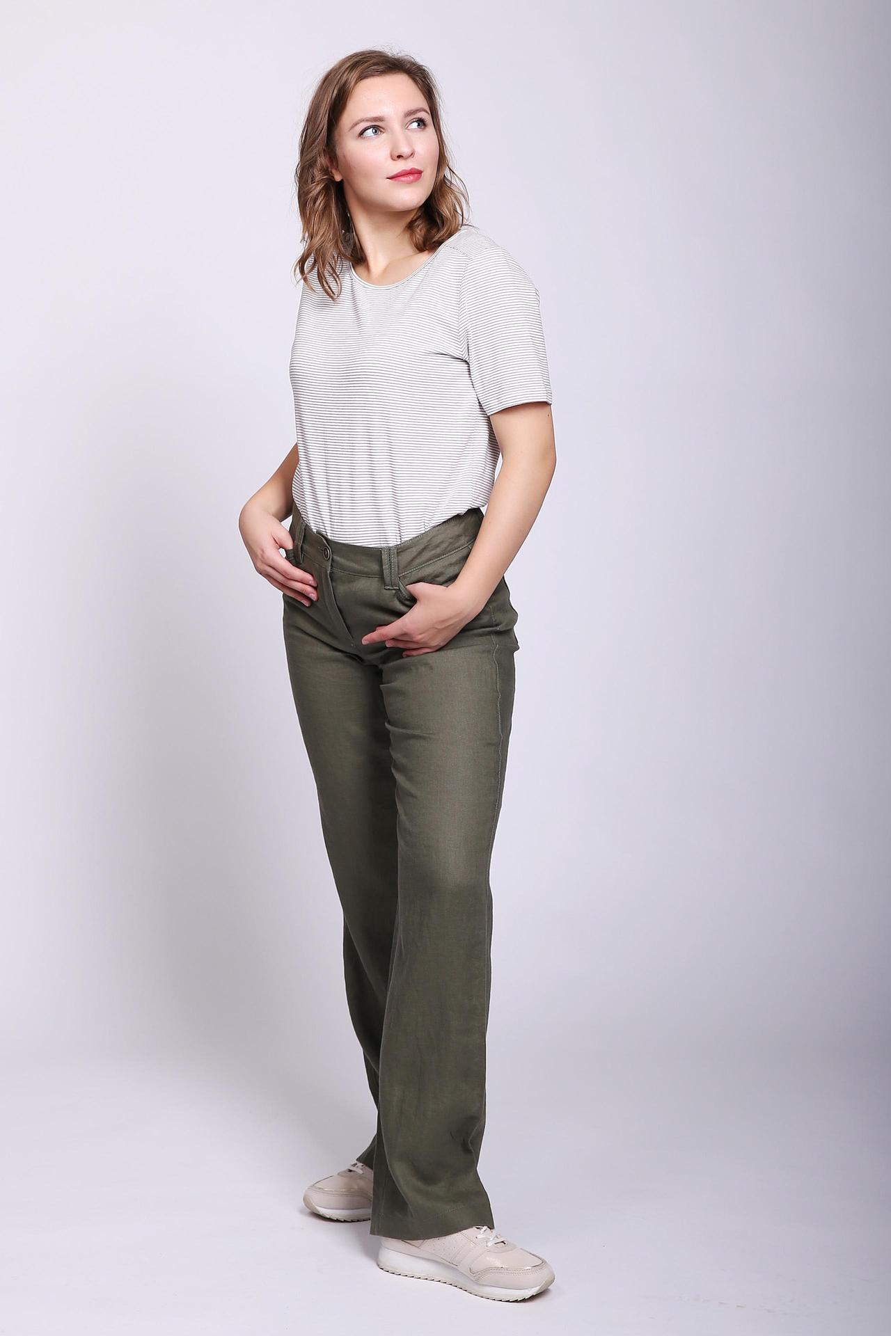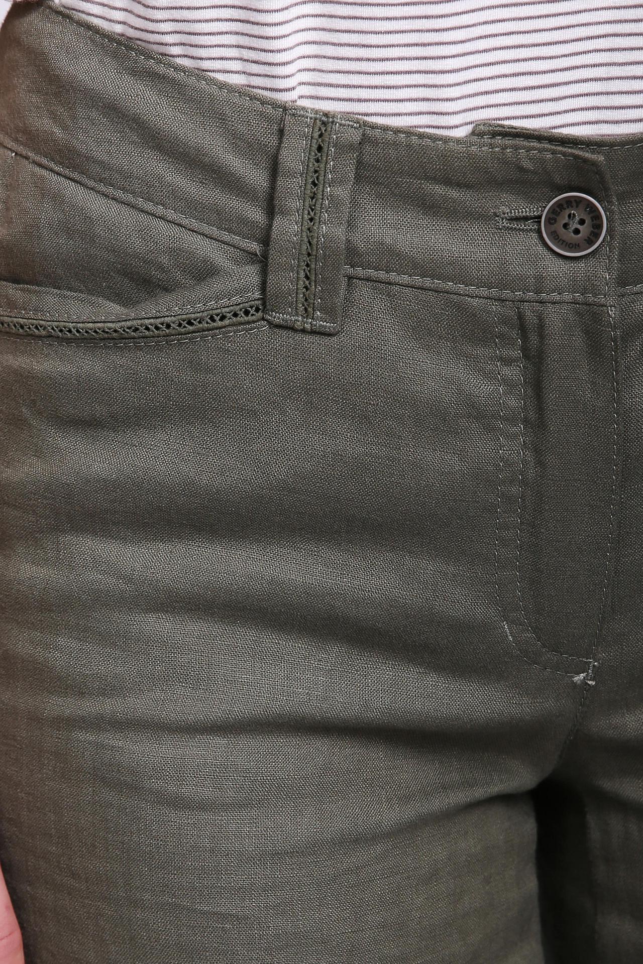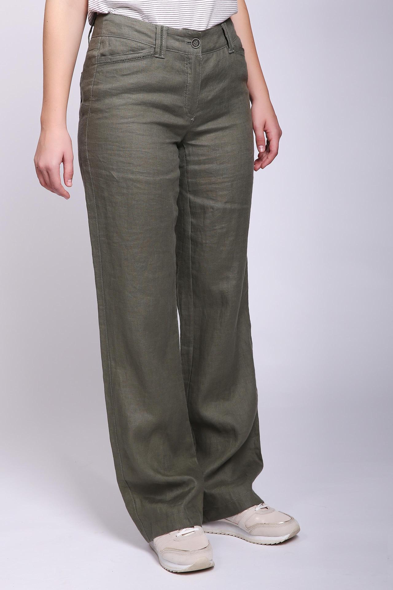 Брюки женские зеленого цвета фирмы Gerry Weber. Модель выполнена прямым покроем. Изделие дополнено пришивным поясом со шлевками для ремня, боковыми карманами, задними кокетками, накладными карманами. Ткань состоит из 100% льна. Гармонировать можно с различными блузами, топами, футболками.