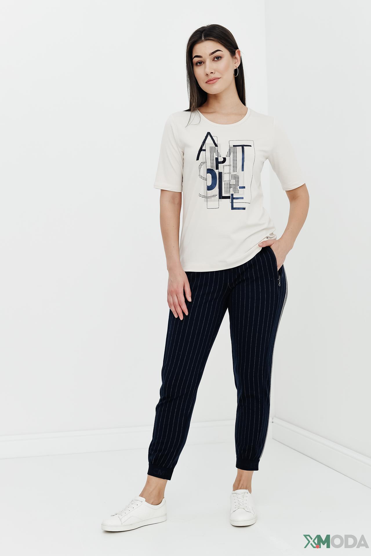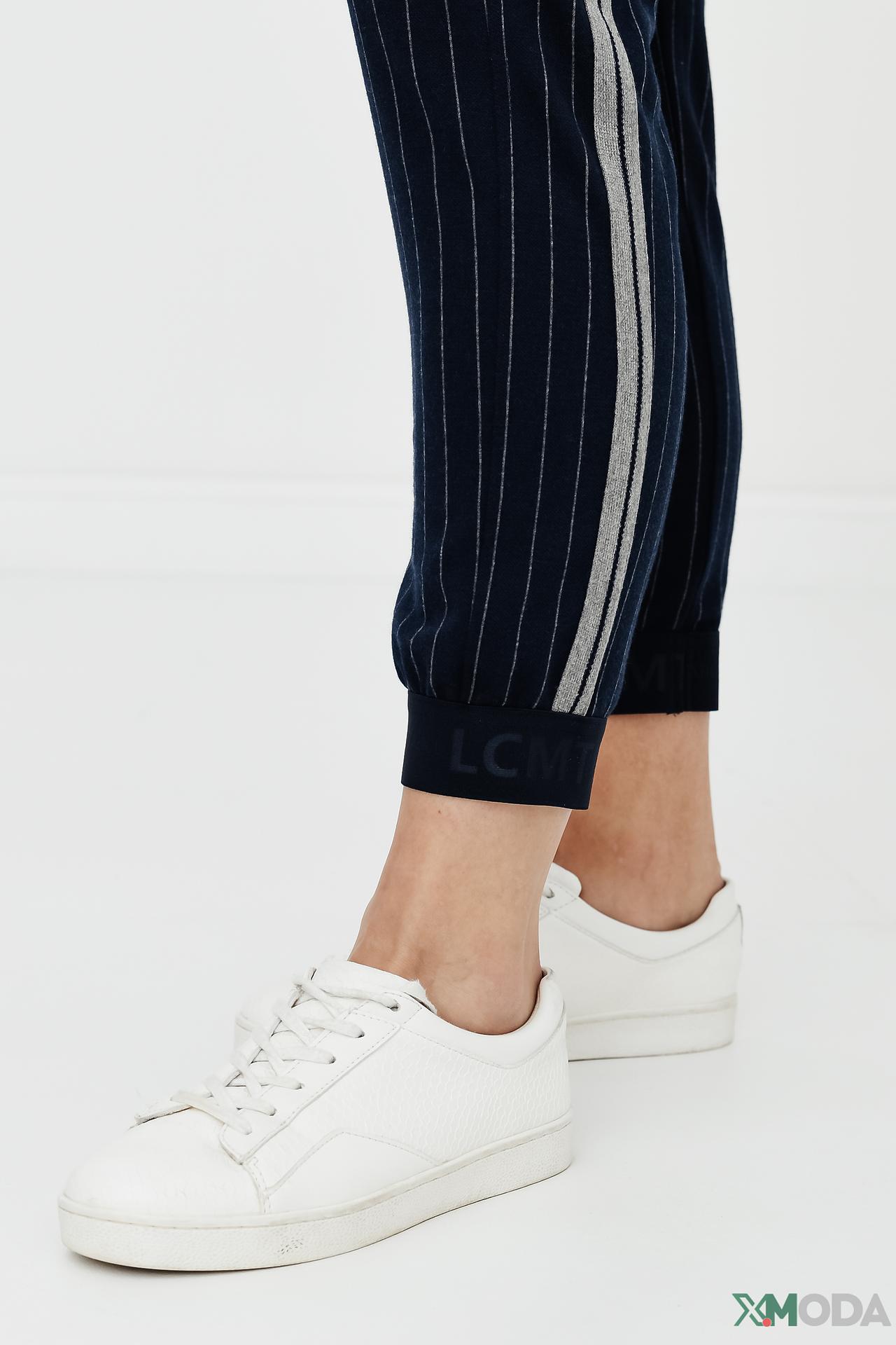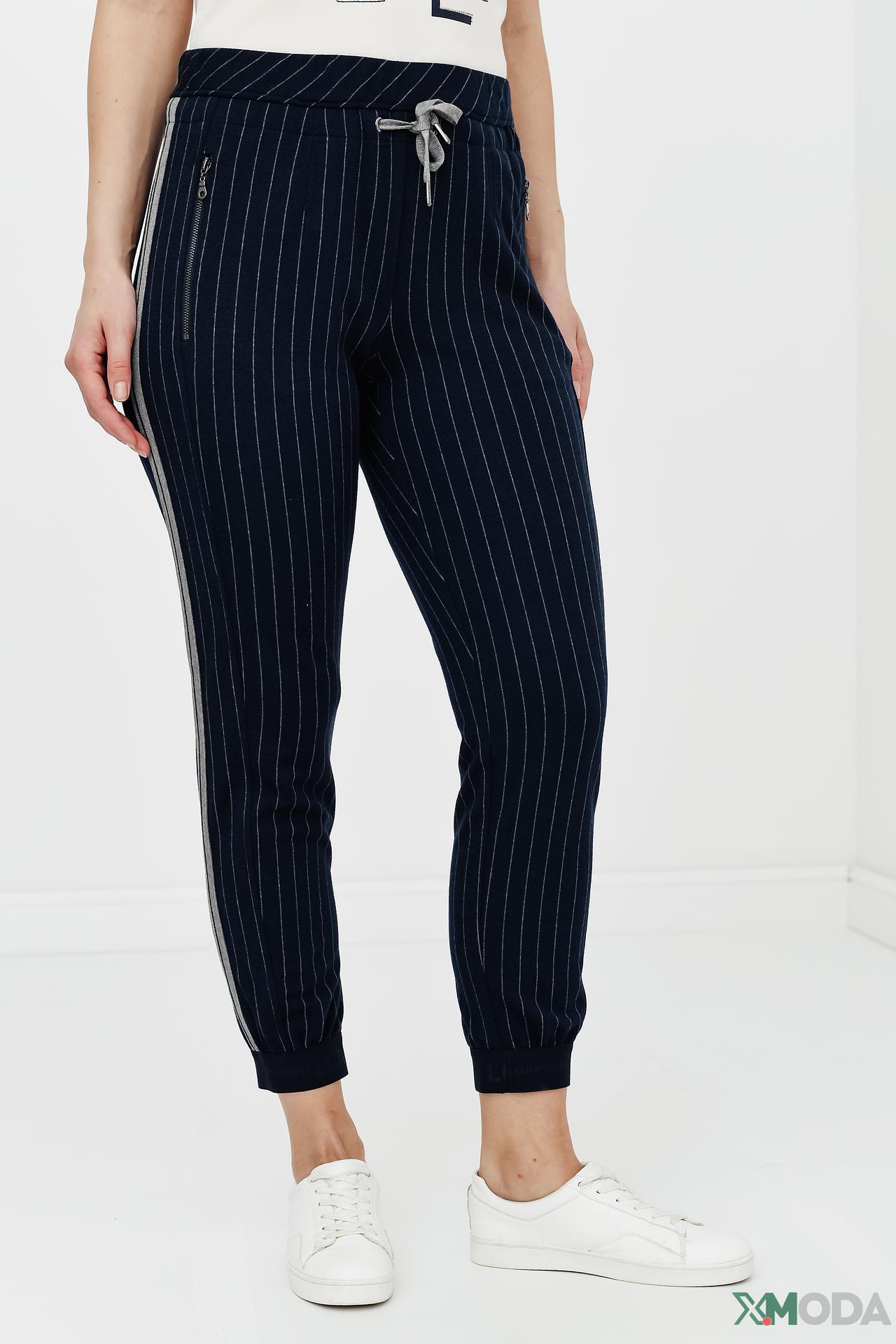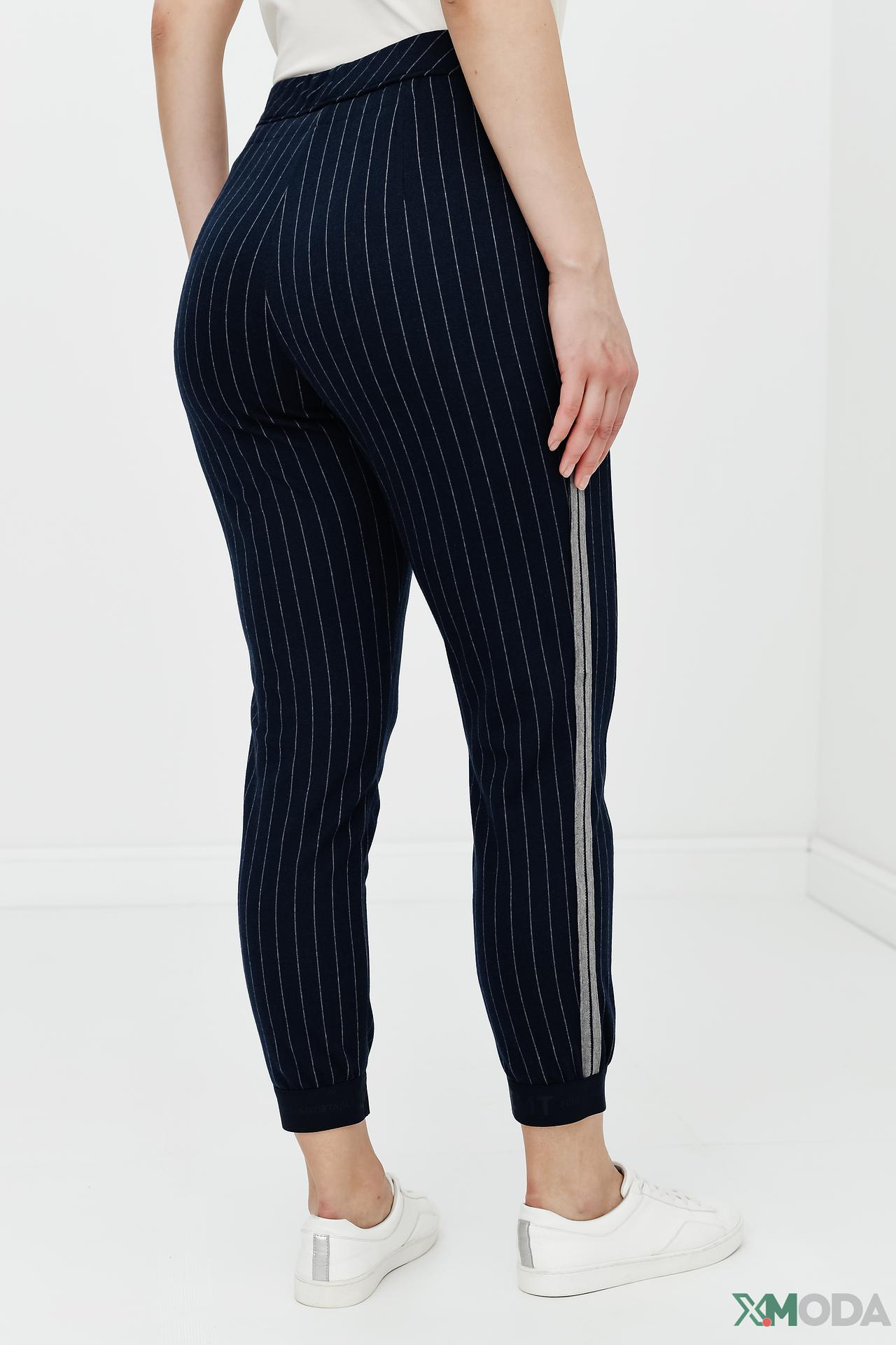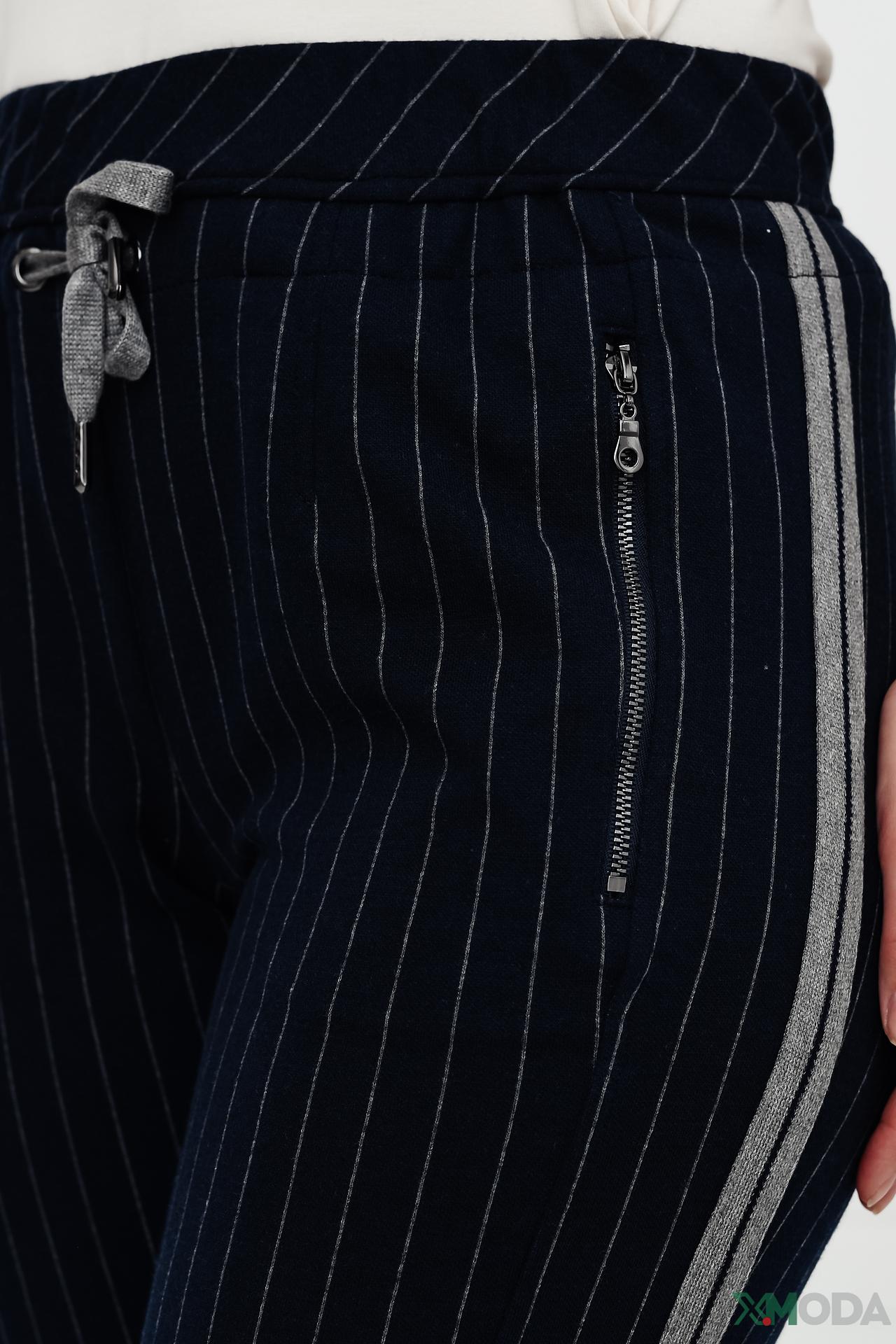 Брюки женские синего цвета от бренда Lecomte. Модель выполнена прямым фасоном. Изделие дополнено пришивным поясом с тесьмой, боковыми карманами на молнию, манжетами на брючинах. Ткань брюк имеет полосатый принт. Состав: 1% эластан, 31% вискоза, 68% полиэстер. Сочетать можно с различными блузами, футболками, пуловерами.