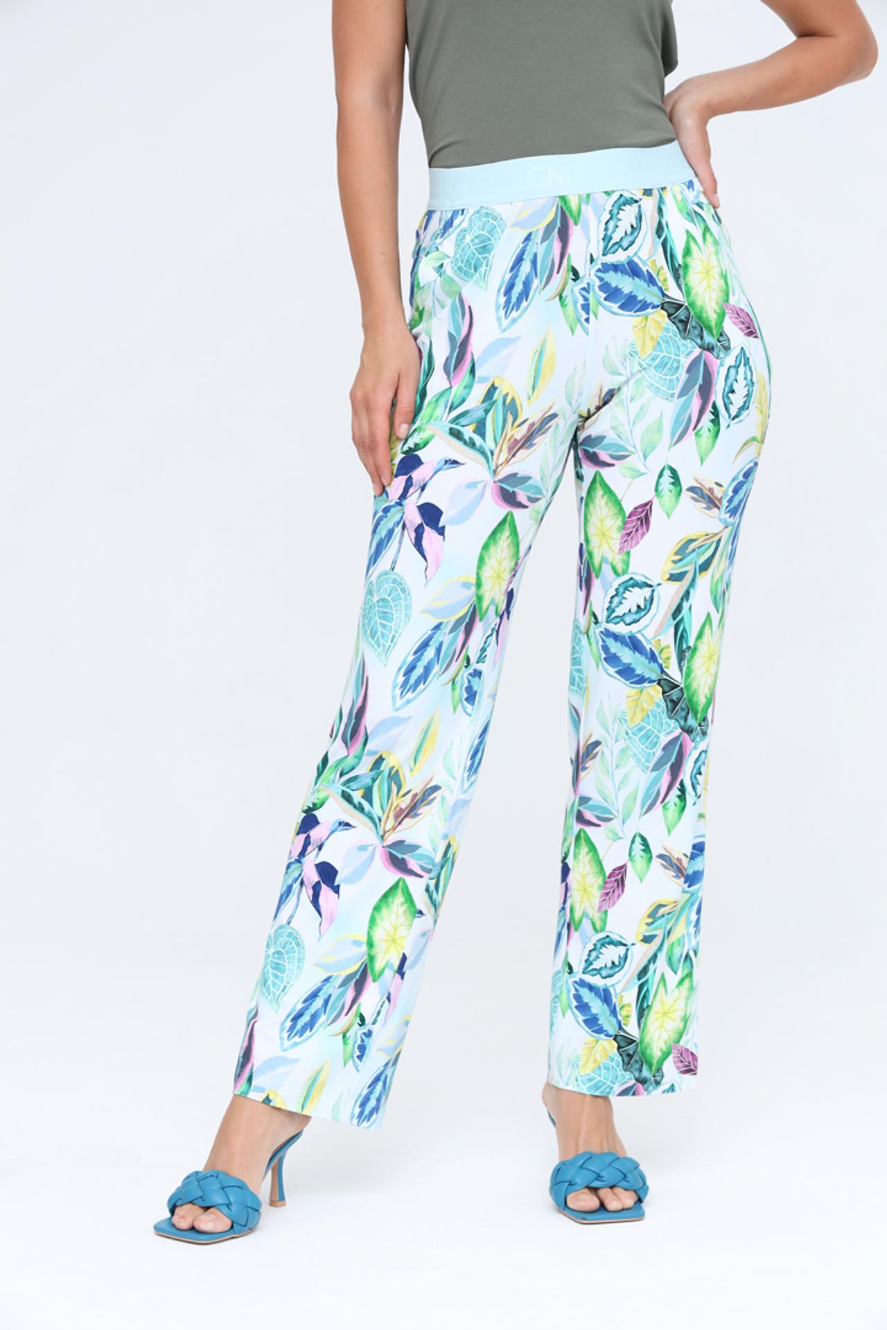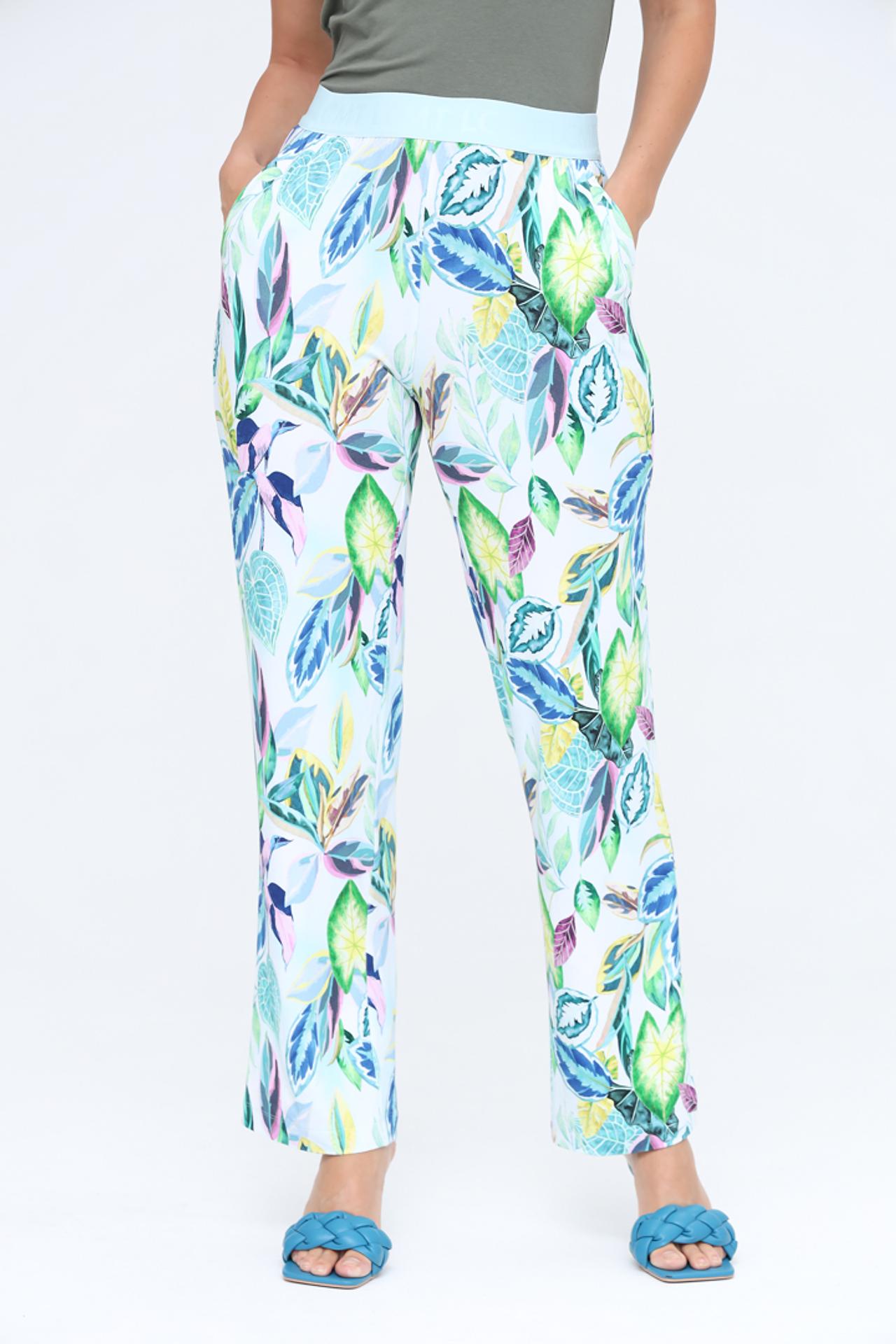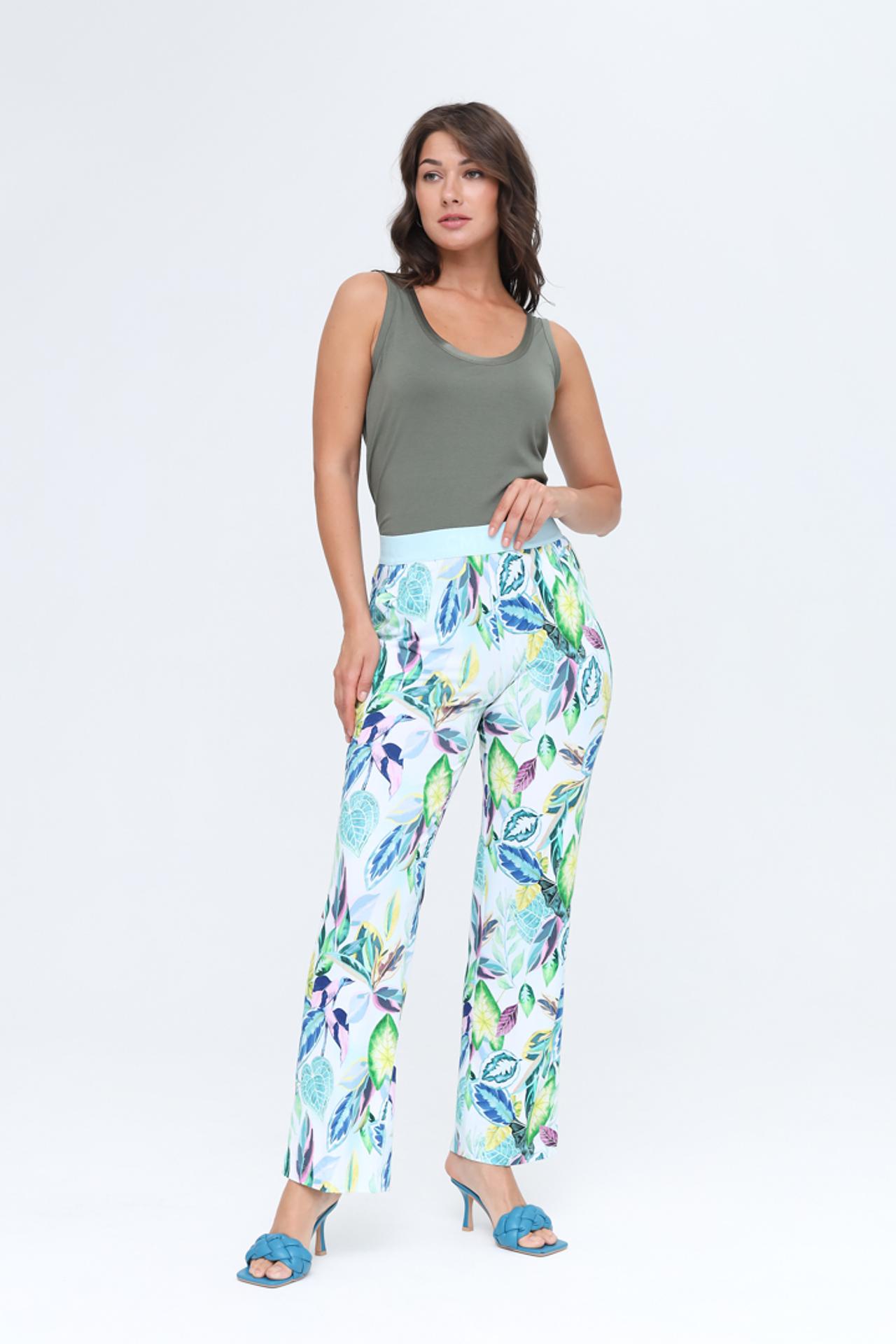 - Яркий дизайн: Эти модные брюки украшает уникальный разноцветный листовой принт на белом фоне, который моментально приковывает внимание. Сочетание зеленых, синих, розовых и желтых оттенков создает летнее настроение, делая их идеальным выбором для ярких образов.